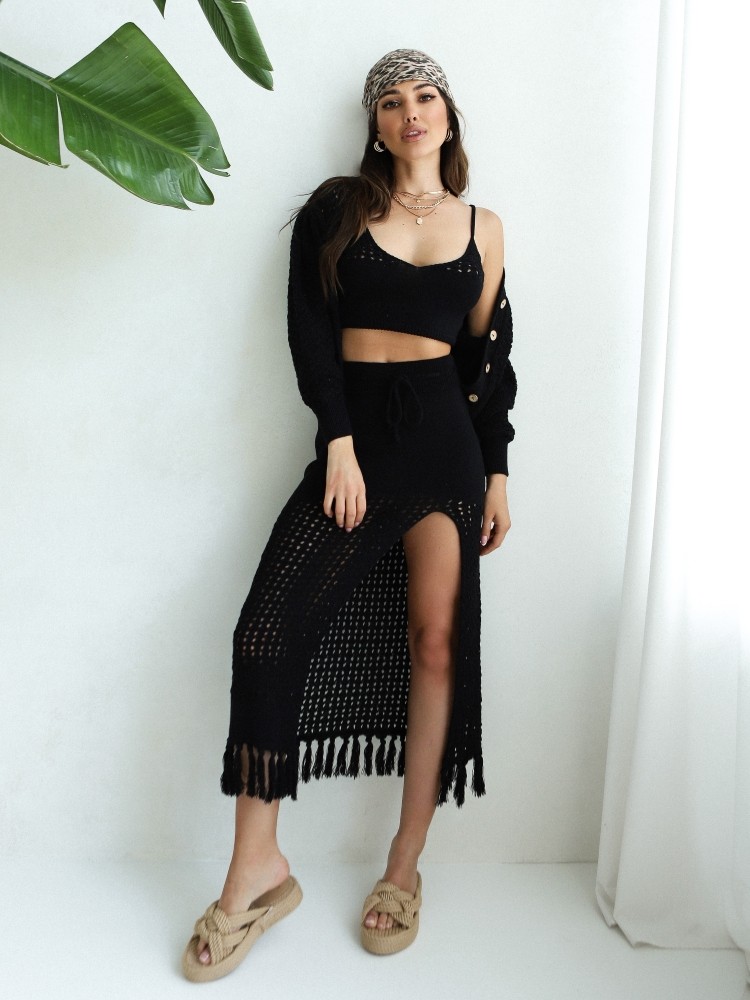 Świetny 3-częściowy komplet Luno w zestaw którego wchodzi sweter, spódnica i top. Spódnica o długości maxi, wykonana z ażurowego, sweterkowego materiału. Szyku dodaje rozcięcie na boku, które optycznie wydłuża sylwetkę. Dodatkowym atutem jest wiązanie na górze i szerokie frędzle na wykończeniach. Made in Poland.