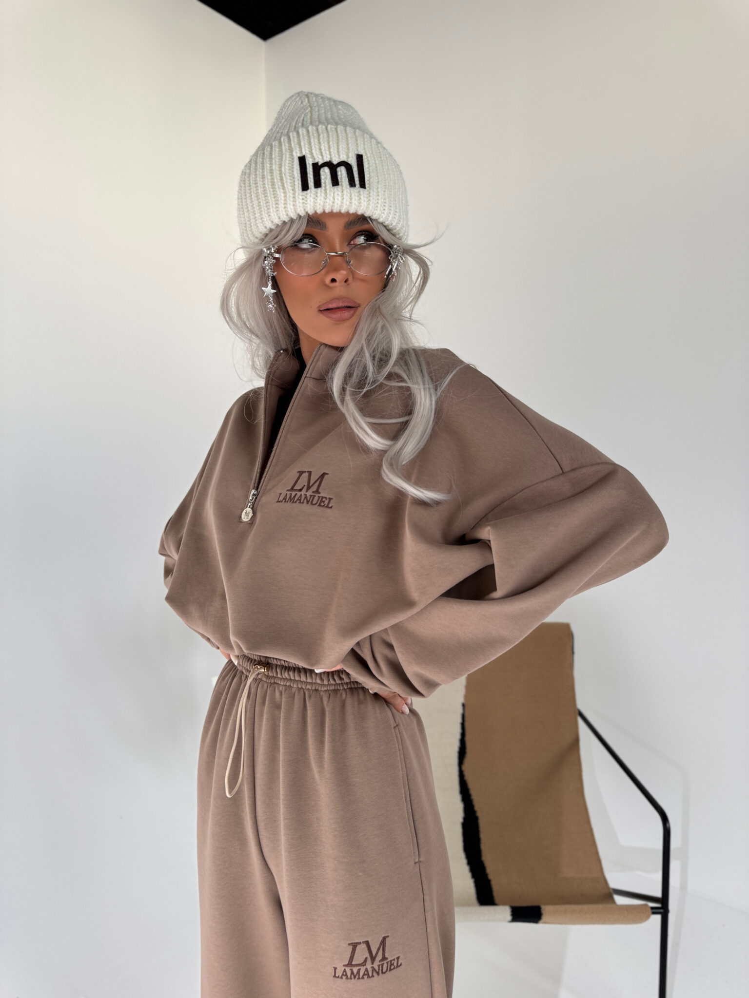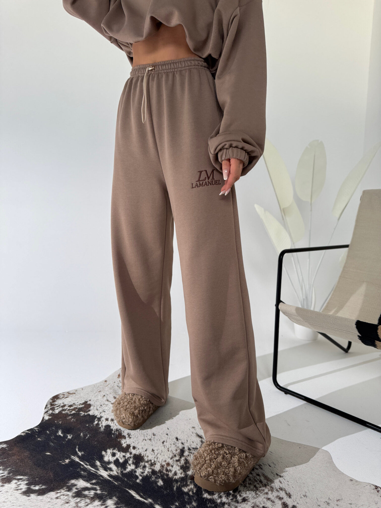 Bluza o swobodnym kroju, którą możesz nosić w dłuższej wersji lub ściągnąć w talii dzięki wszytemu sznurkowi. Suwak przy dekolcie i haftowane logo dopełniają całości. Uniwersalna, komfortowa, sprawdzi się w zestawie lub jako osobny element stylizacji. Luźne, wygodne spodnie z prostą nogawką i elastycznym pasem. Złoty detal w talii dodaje im lekkiego wyrafinowania, a haft z logo podkreśla charakter marki. Idealne do noszenia na co dzień – solo albo w komplecie.