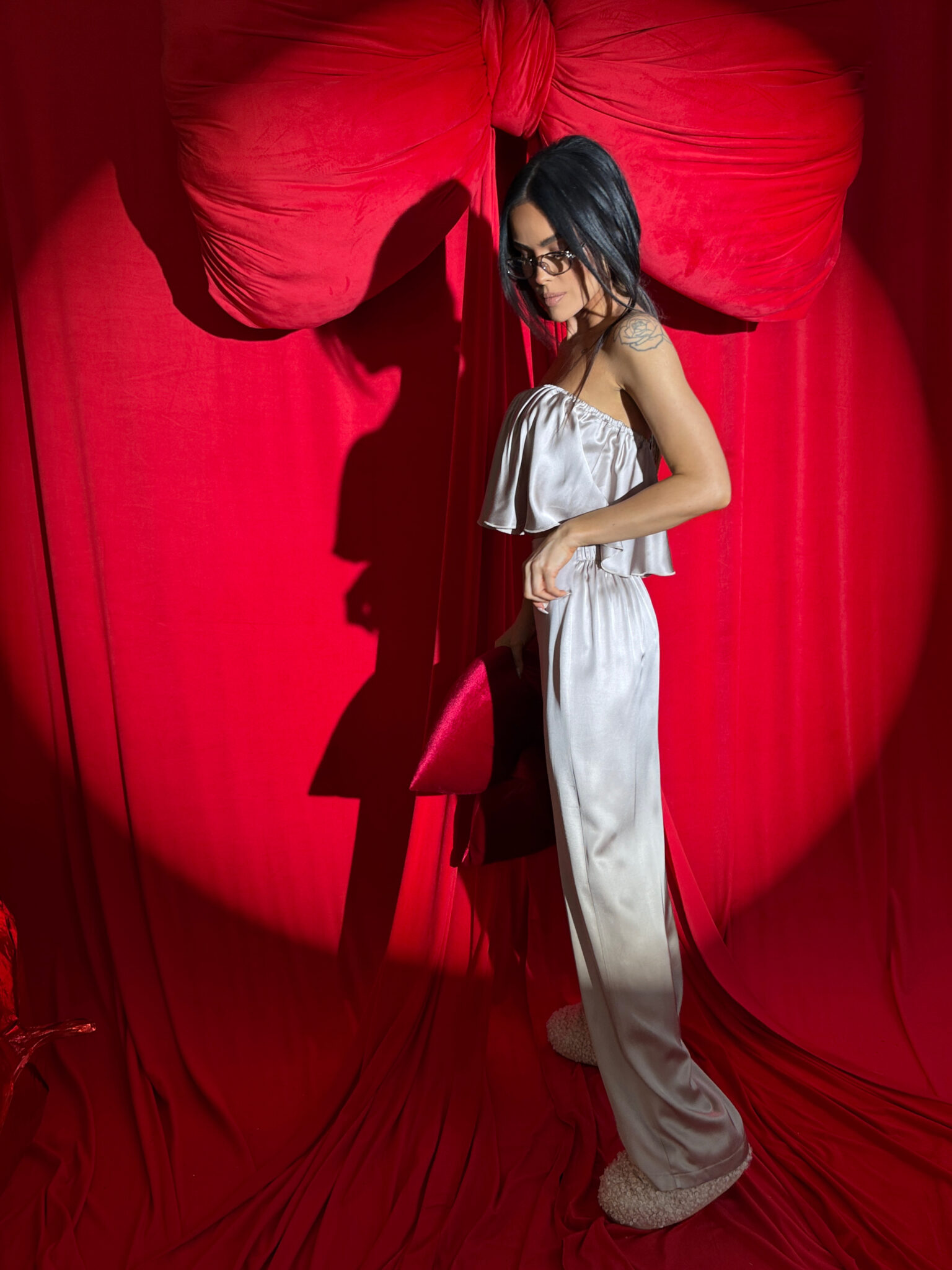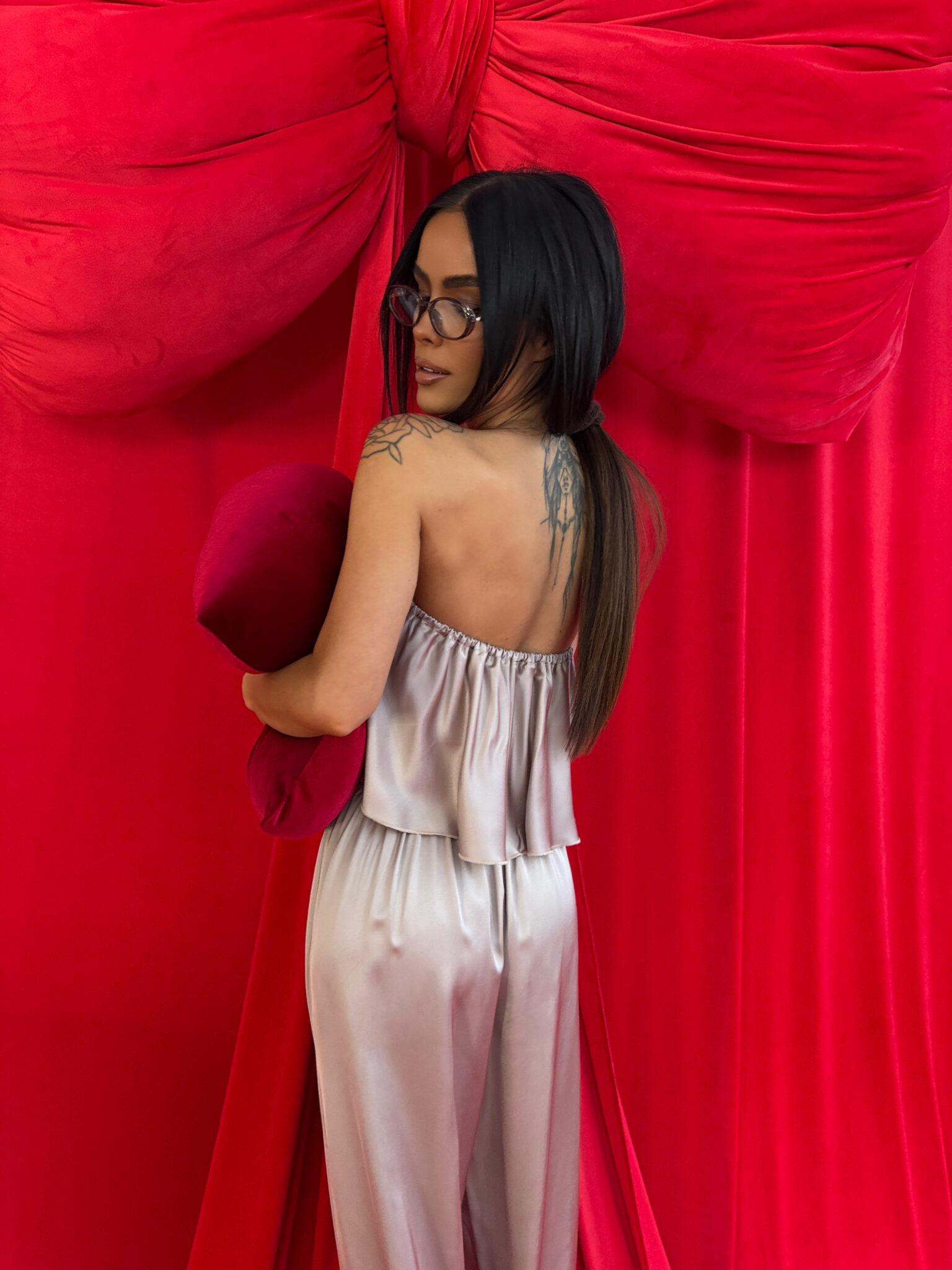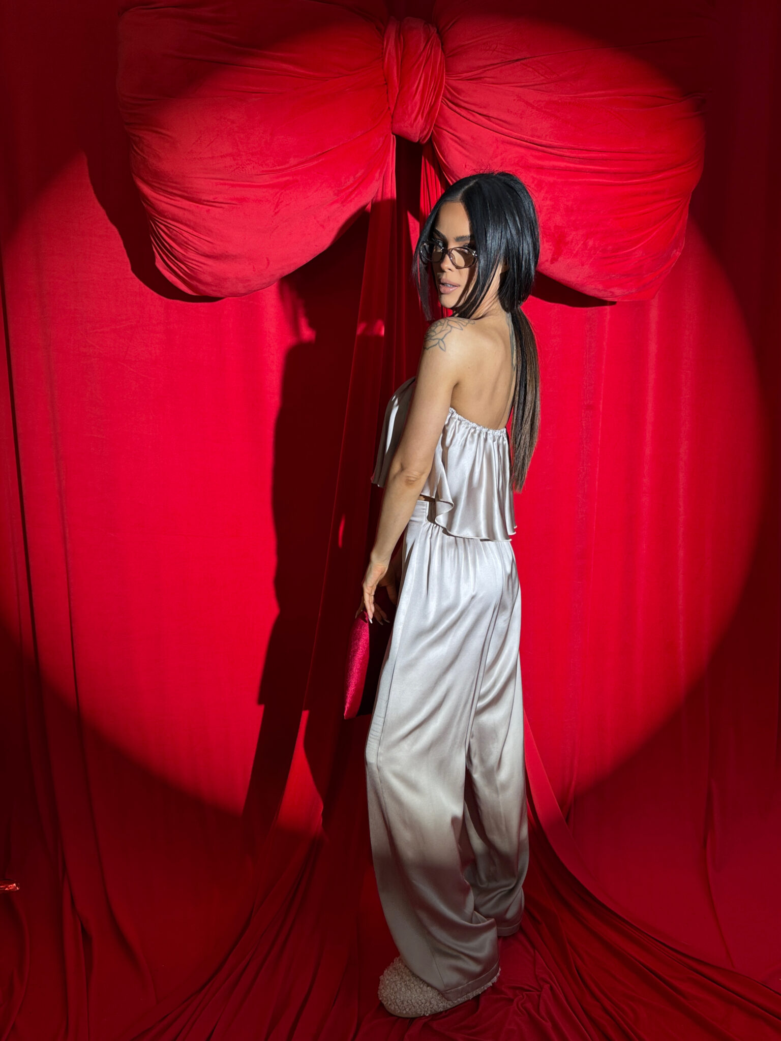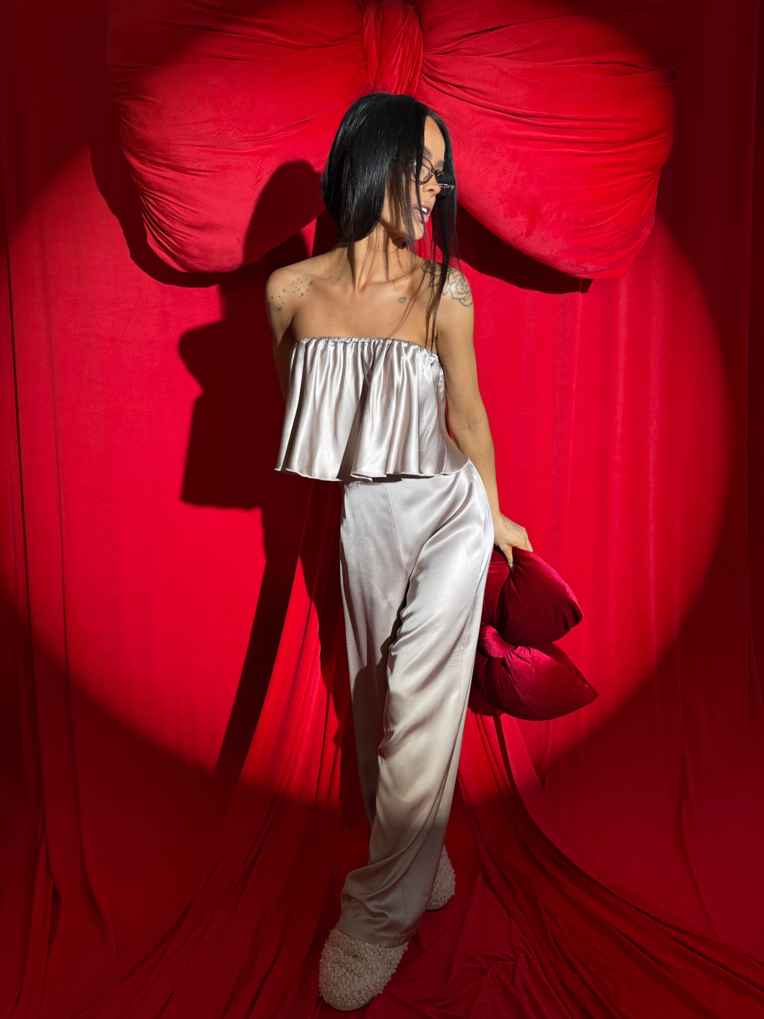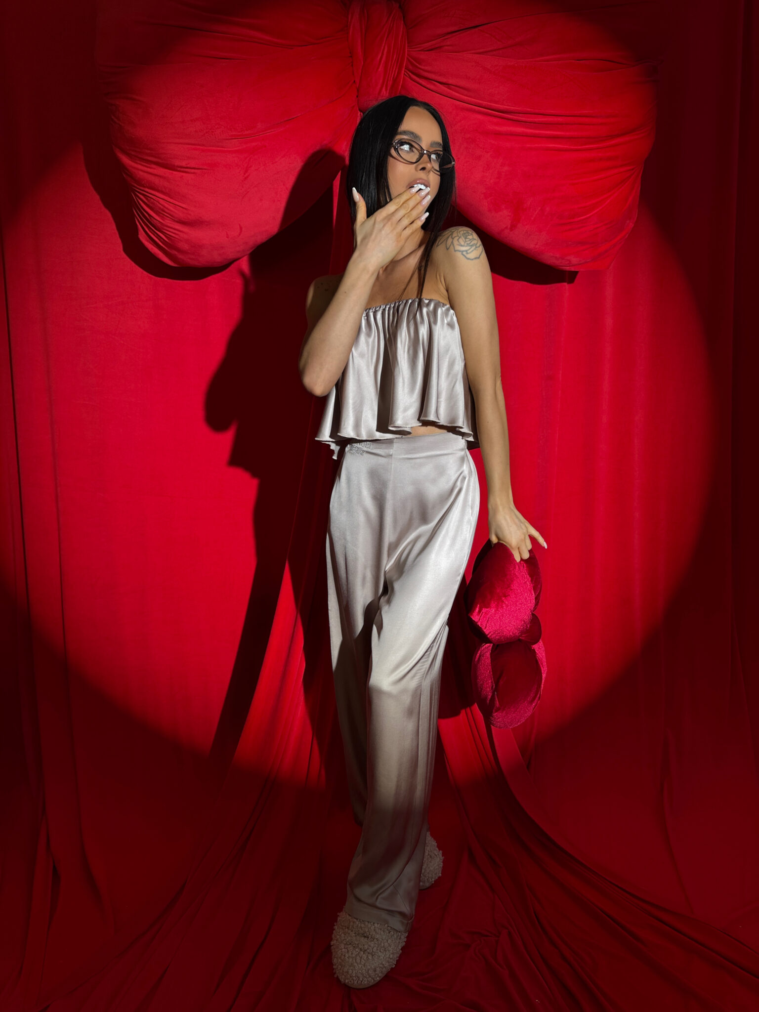 Ten komplet to kwintesencja luksusu w domowej odsłonie. Wykonany z naturalnej wiskozy o satynowym wykończeniu, zachwyca miękkością, subtelnym połyskiem i eleganckim ruchem tkaniny przy każdym kroku. Top bez ramiączek z falbaną delikatnie podkreśla ramiona, a szerokie spodnie z wysokim stanem i efektownym marszczeniem z tyłu pięknie układają się na sylwetce – zwłaszcza na biodrach i pośladkach.