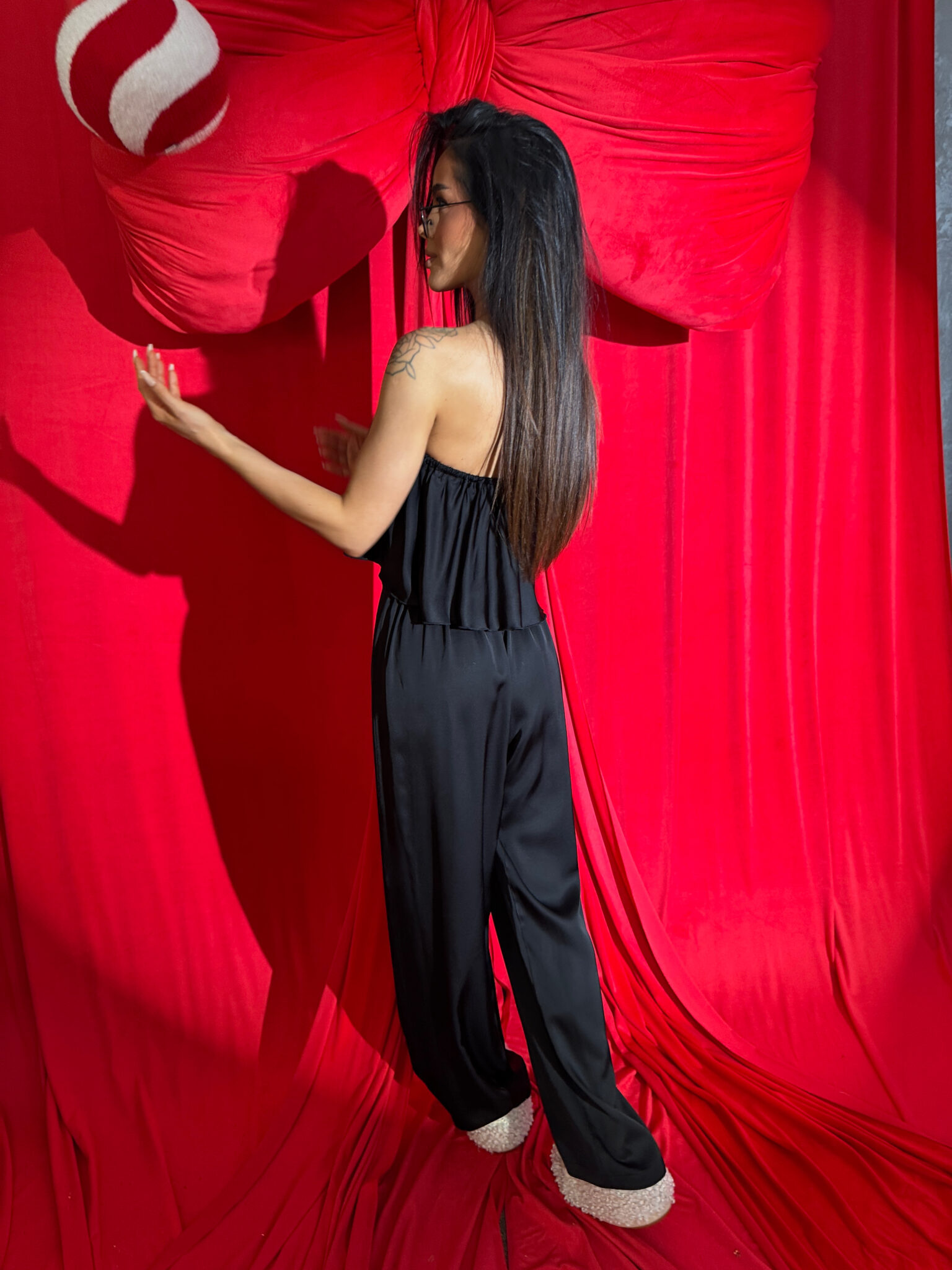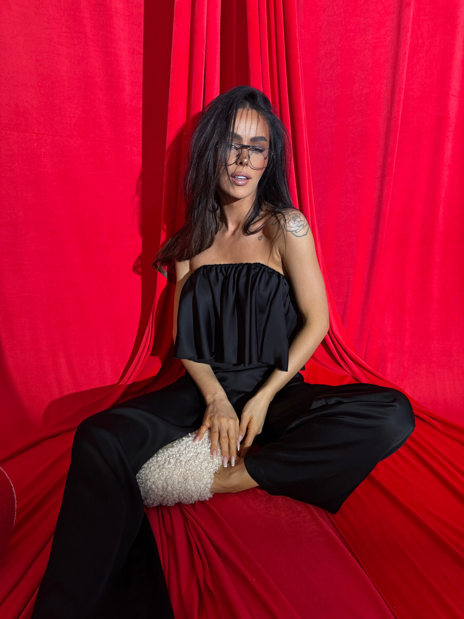Ten komplet to kwintesencja luksusu w domowej odsłonie. Wykonany z naturalnej wiskozy o satynowym wykończeniu, zachwyca miękkością, subtelnym połyskiem i eleganckim ruchem tkaniny przy każdym kroku. Top bez ramiączek z falbaną delikatnie podkreśla ramiona, a szerokie spodnie z wysokim stanem i efektownym marszczeniem z tyłu pięknie układają się na sylwetce – zwłaszcza na biodrach i pośladkach.