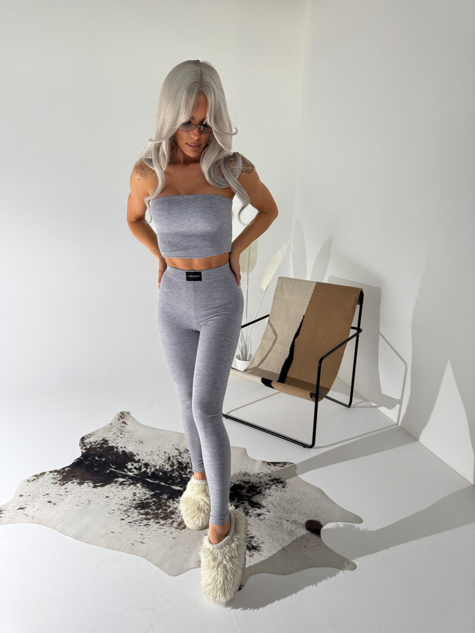 Komplet z prążkowanej dzianiny, który łączy wygodę z dopracowaną prostotą. Top bez ramiączek i legginsy z wysokim stanem tworzą zestaw, który idealnie układa się na sylwetce i sprawdza się zarówno w domu, jak i poza nim. Elastyczny materiał pracuje z ciałem, a minimalistyczne metki z logo dodają całości spójności i charakteru. Nonszalancki, ale przemyślany – dokładnie taki, jak lubimy.