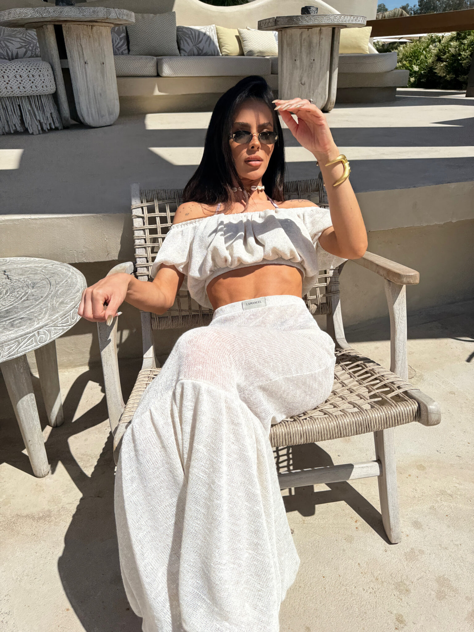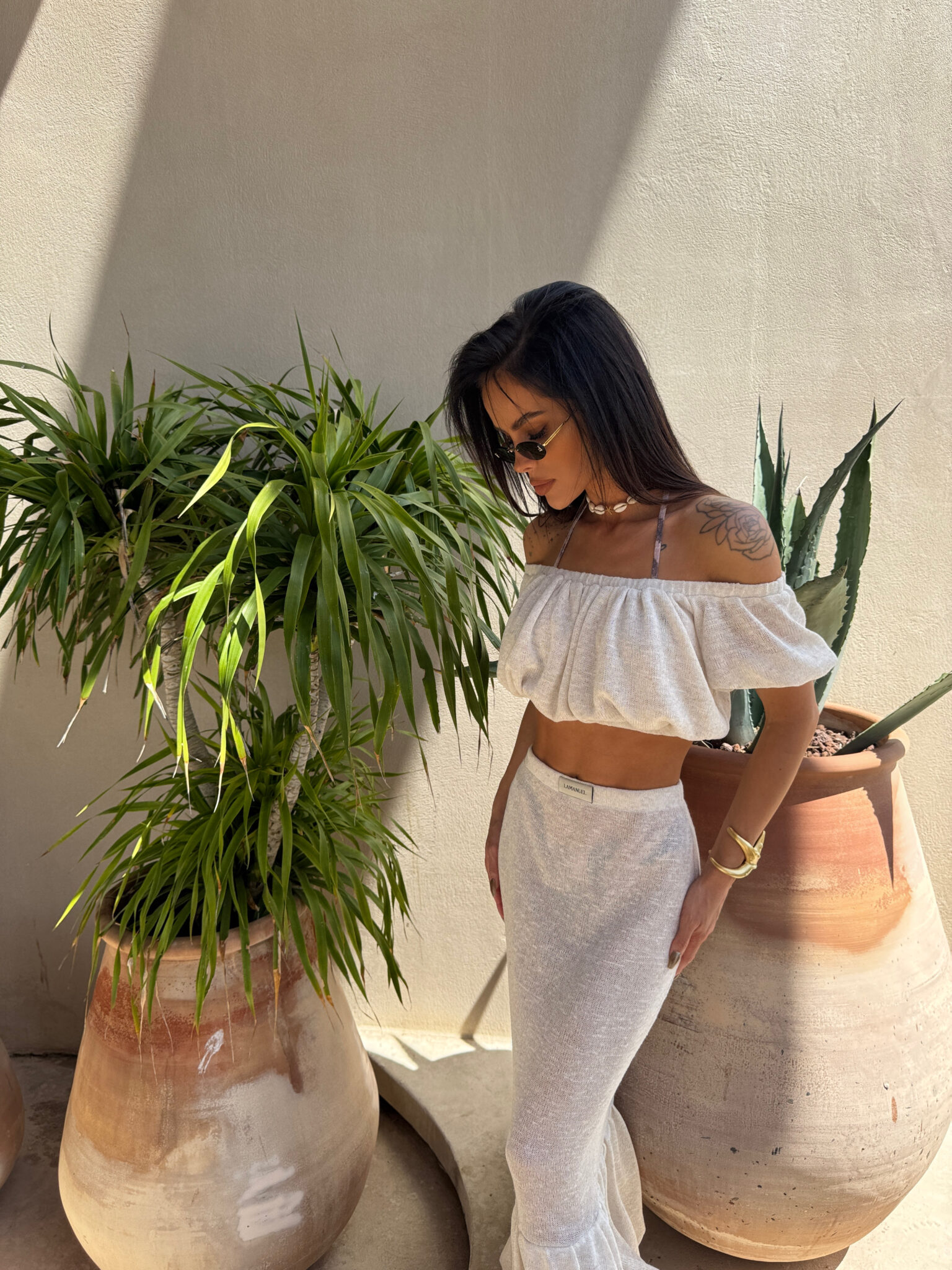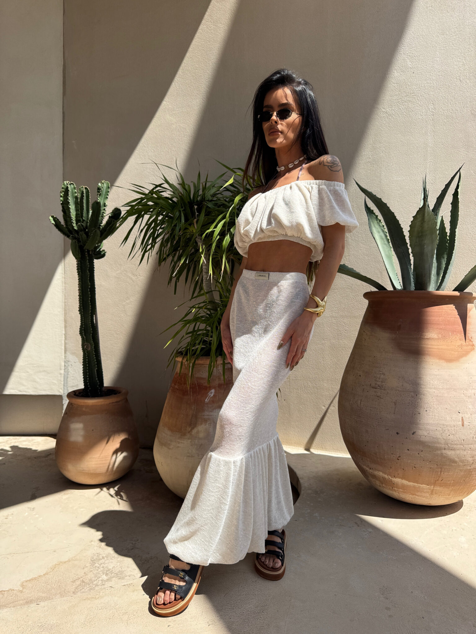 Komplet składa się z krótkiego topu z opuszczanymi rękawami uszytego podwójnie dla większego komfortu i lepszego dopasowania oraz długiej, dopasowanej spódnicy z efektowną falbaną przy dolnej krawędzi która pięknie układa się w ruchu i podkreśla sylwetkę całość tworzy wyrazistą, a zarazem lekką stylizację idealną na lato wakacje lub wyjazdy w ciepłe miejsca świetnie komponuje się zarówno z płaskimi sandałami jak i bardziej eleganckimi dodatkami