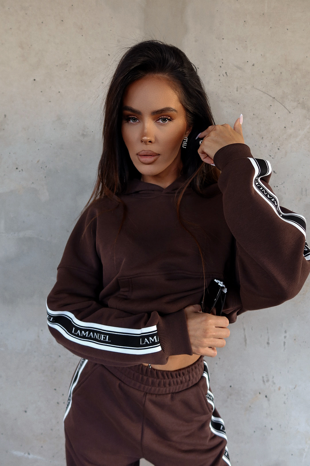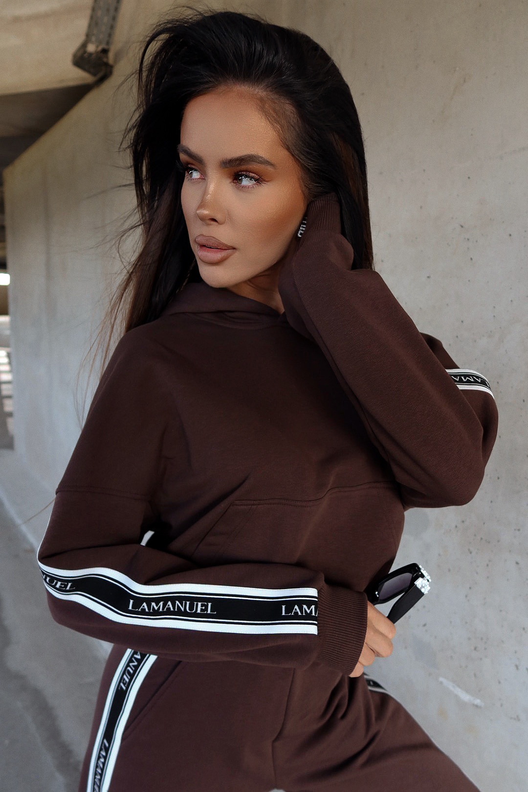 Bluza wykonana z dzianiny dresowej pętelkowej, o klasycznym, lekko oversize’owym kroju. Model z kapturem i kieszenią typu kangurka, ozdobiony szerokimi lampasami z logo LAMANUEL wszytymi wzdłuż rękawów. Ściągacze przy mankietach i dole zapewniają wygodne dopasowanie. Idealna propozycja na codzienne, swobodne stylizacje – zarówno w zestawie, jak i solo.