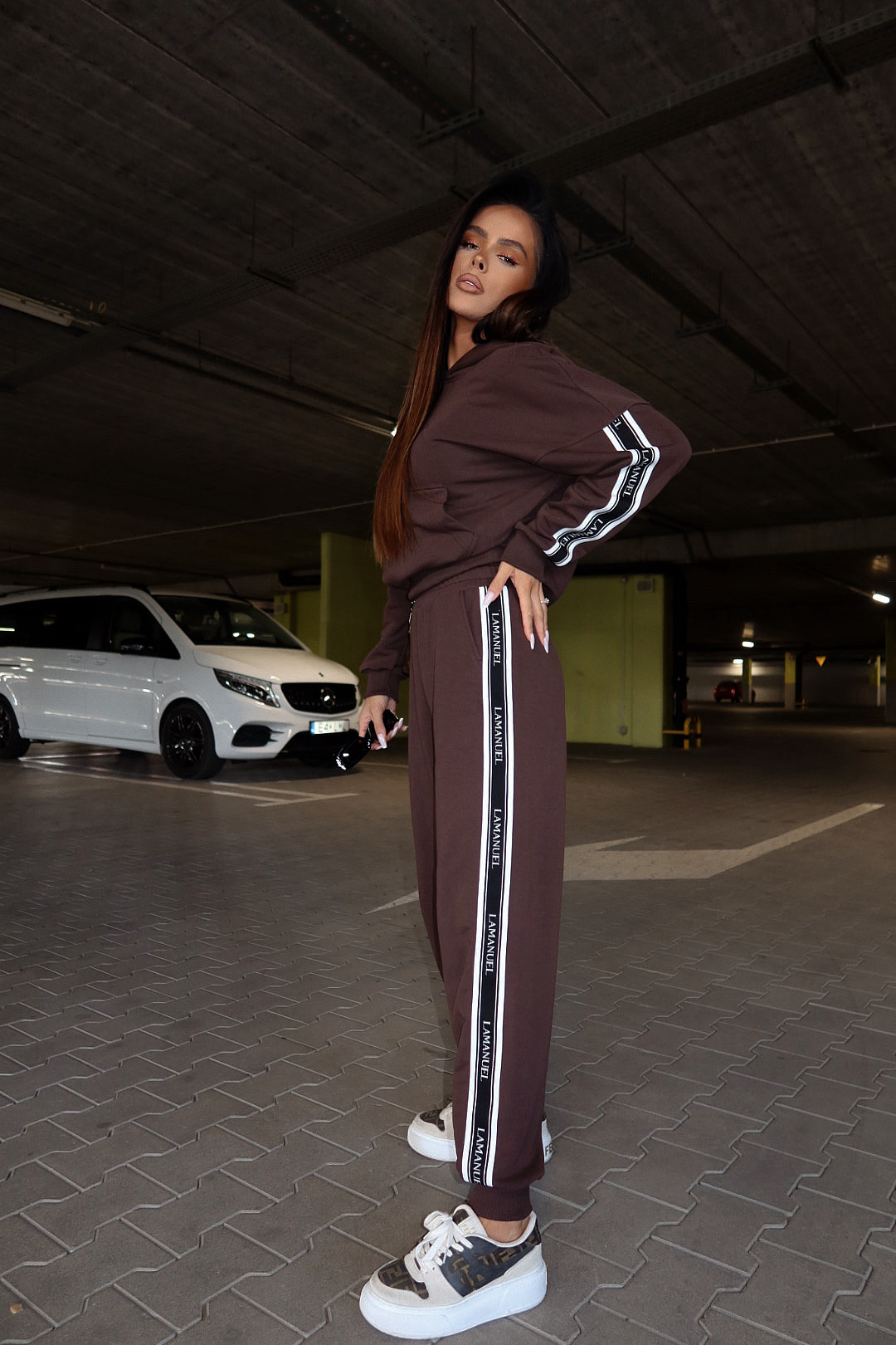 Spodnie z dzianiny dresowej pętelkowej, o swobodnym kroju z wyższym stanem. Elastyczny pas oraz nogawki zakończone ściągaczem zapewniają komfort i dopasowanie. Szerokie lampasy z logo LAMANUEL wzdłuż nogawek podkreślają charakter modelu. Boczne kieszenie zwiększają funkcjonalność. Spodnie świetnie sprawdzą się w duecie z bluzą lub jako element miejskiej stylizacji.
