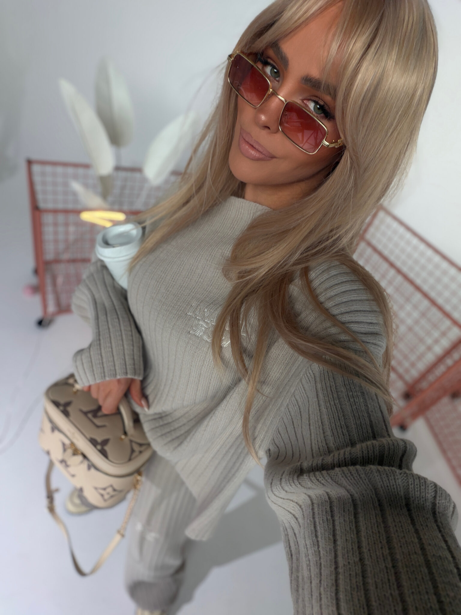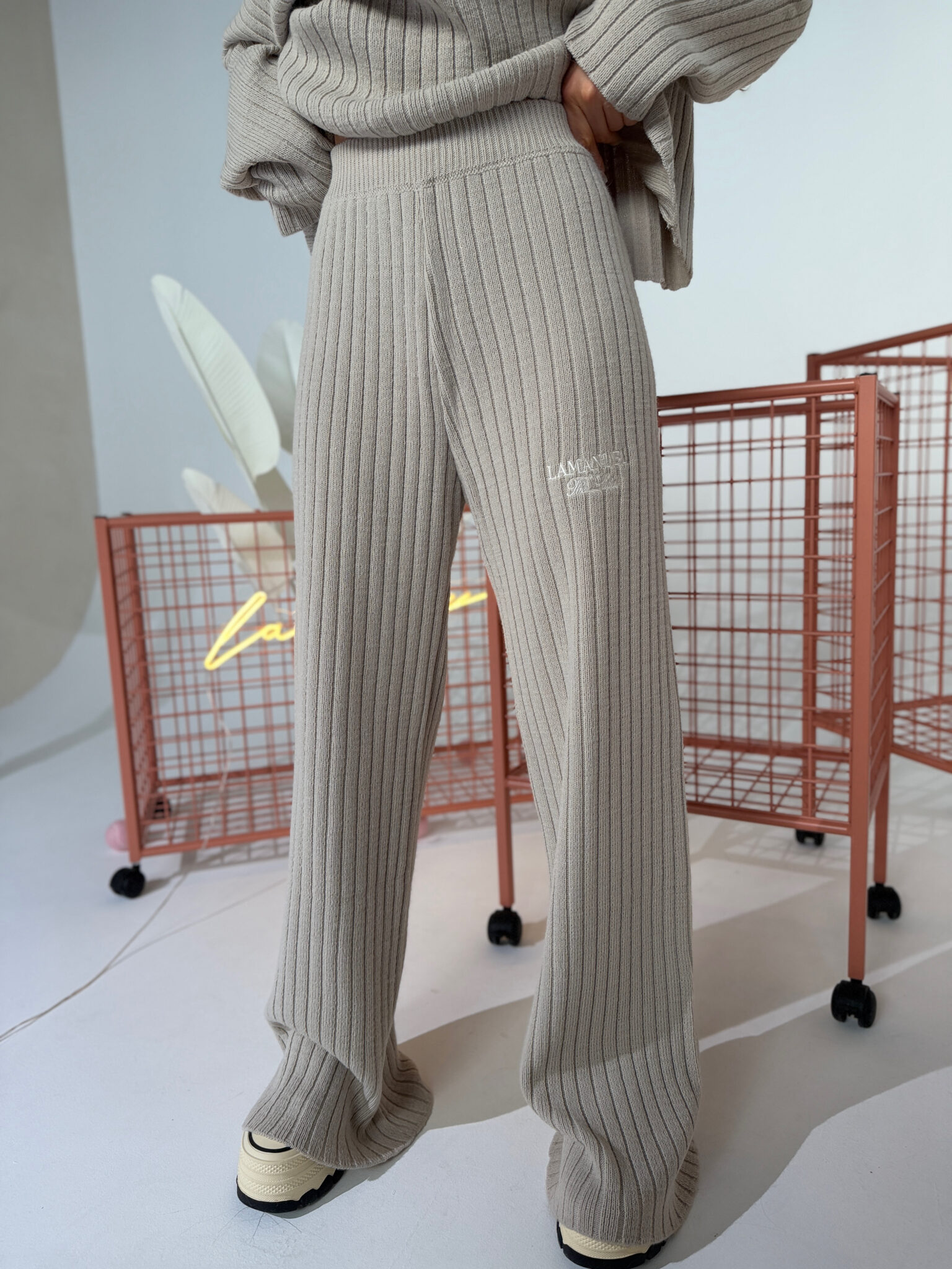 Dzianina o wyraźnym, pionowym prążku – miękka, elastyczna, dobrze układająca się w ruchu. Góra z opuszczoną linią ramion, szerokim rękawem i lekko oversize’owym krojem. Można nosić klasycznie lub opuścić na jedno ramię. Spodnie z wysokim stanem i prostą nogawką. Pas szeroki, elastyczny – bez widocznych sznurków czy zapięć. Na piersi i biodrze haftowane logo w minimalistycznym stylu. Całość tworzy sylwetkę, ale nie opina. Miękkość dzianiny + struktura prążka = zestaw, który nie wygląda jak homewear, ale nosi się jak homewear.