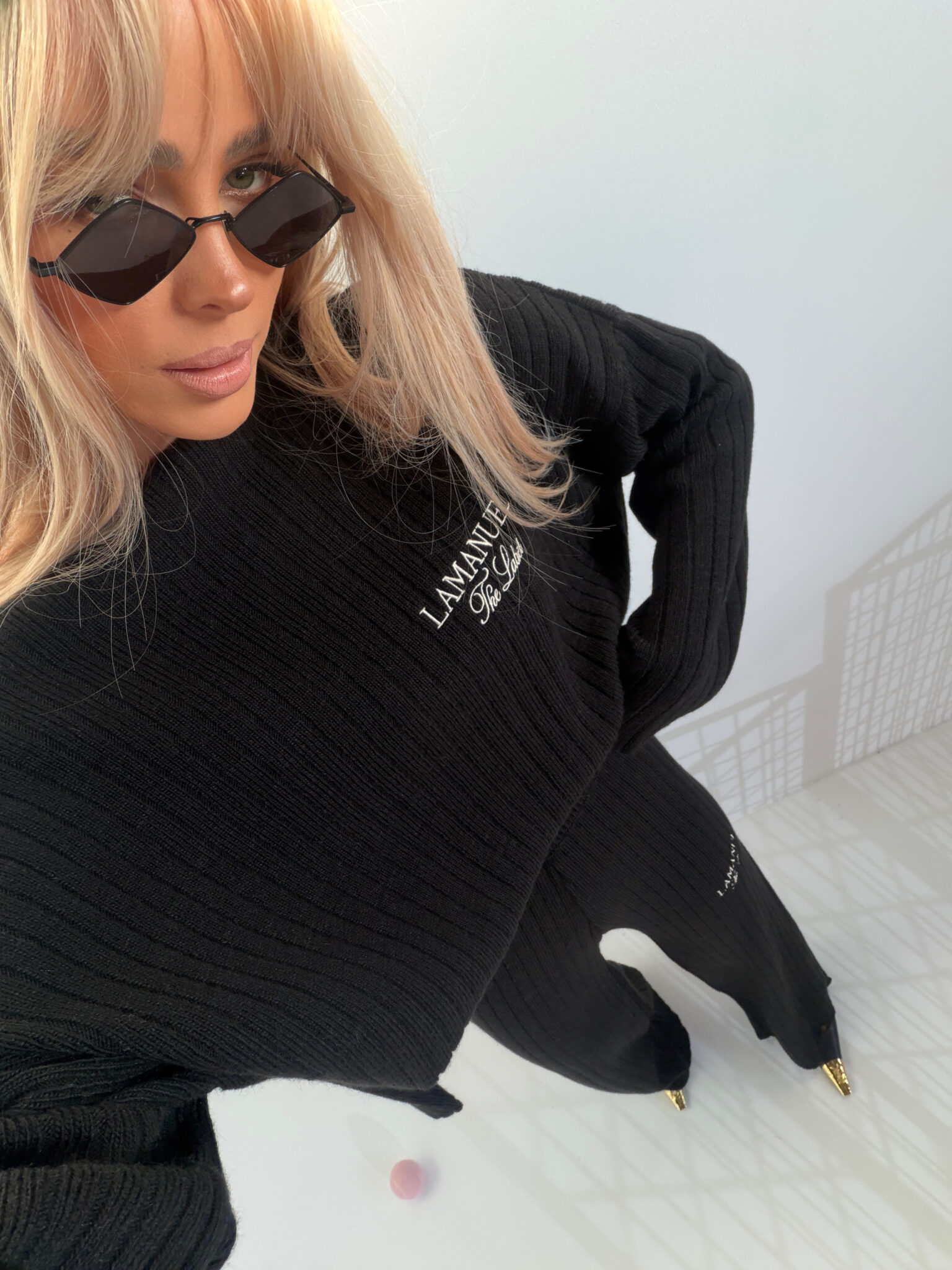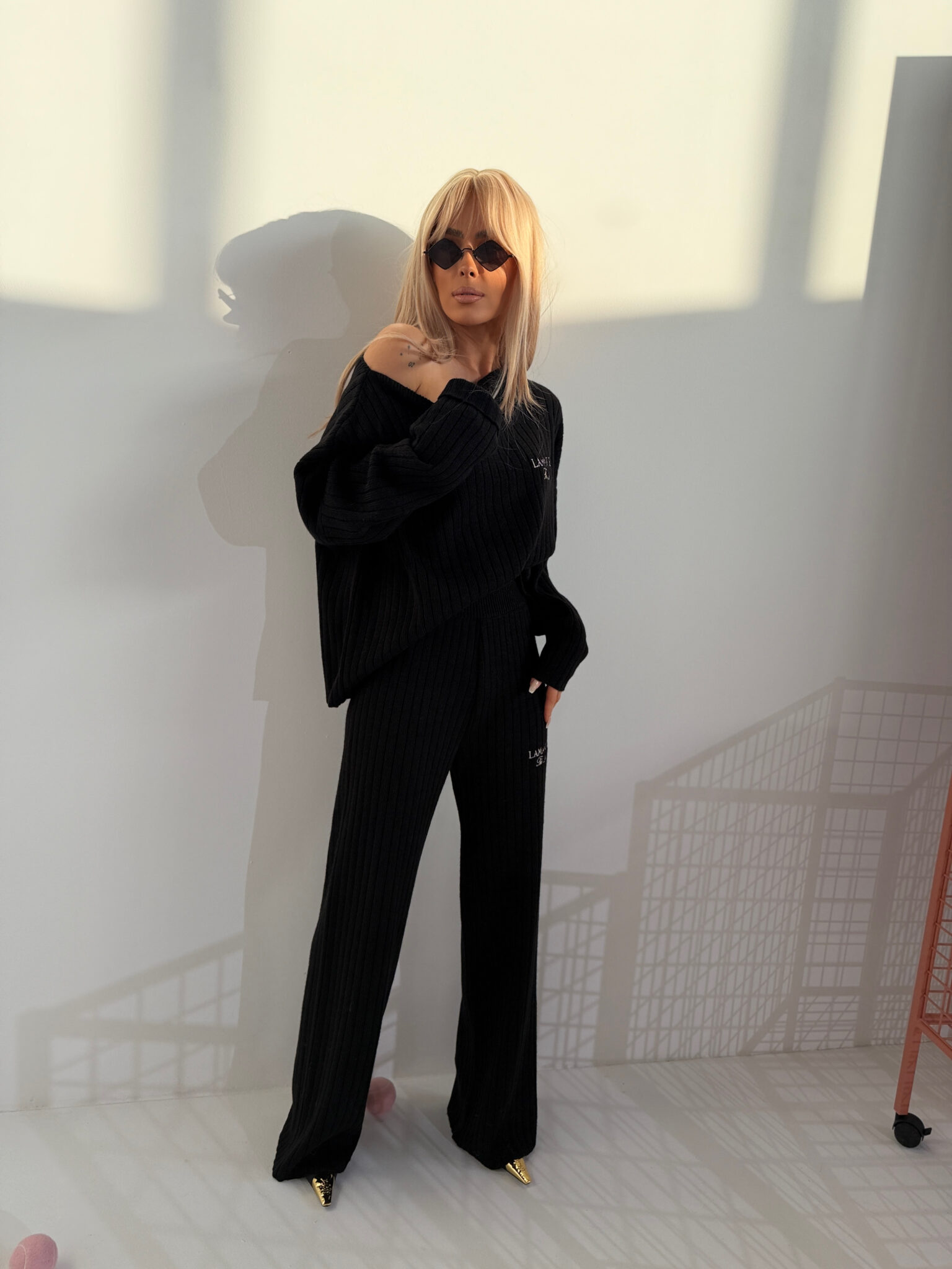 Dzianina o wyraźnym, pionowym prążku – miękka, elastyczna, dobrze układająca się w ruchu. Góra z opuszczoną linią ramion, szerokim rękawem i lekko oversize’owym krojem. Można nosić klasycznie lub opuścić na jedno ramię. Spodnie z wysokim stanem i prostą nogawką. Pas szeroki, elastyczny – bez widocznych sznurków czy zapięć. Na piersi i biodrze haftowane logo w minimalistycznym stylu. Całość tworzy sylwetkę, ale nie opina. Miękkość dzianiny + struktura prążka = zestaw, który nie wygląda jak homewear, ale nosi się jak homewear.