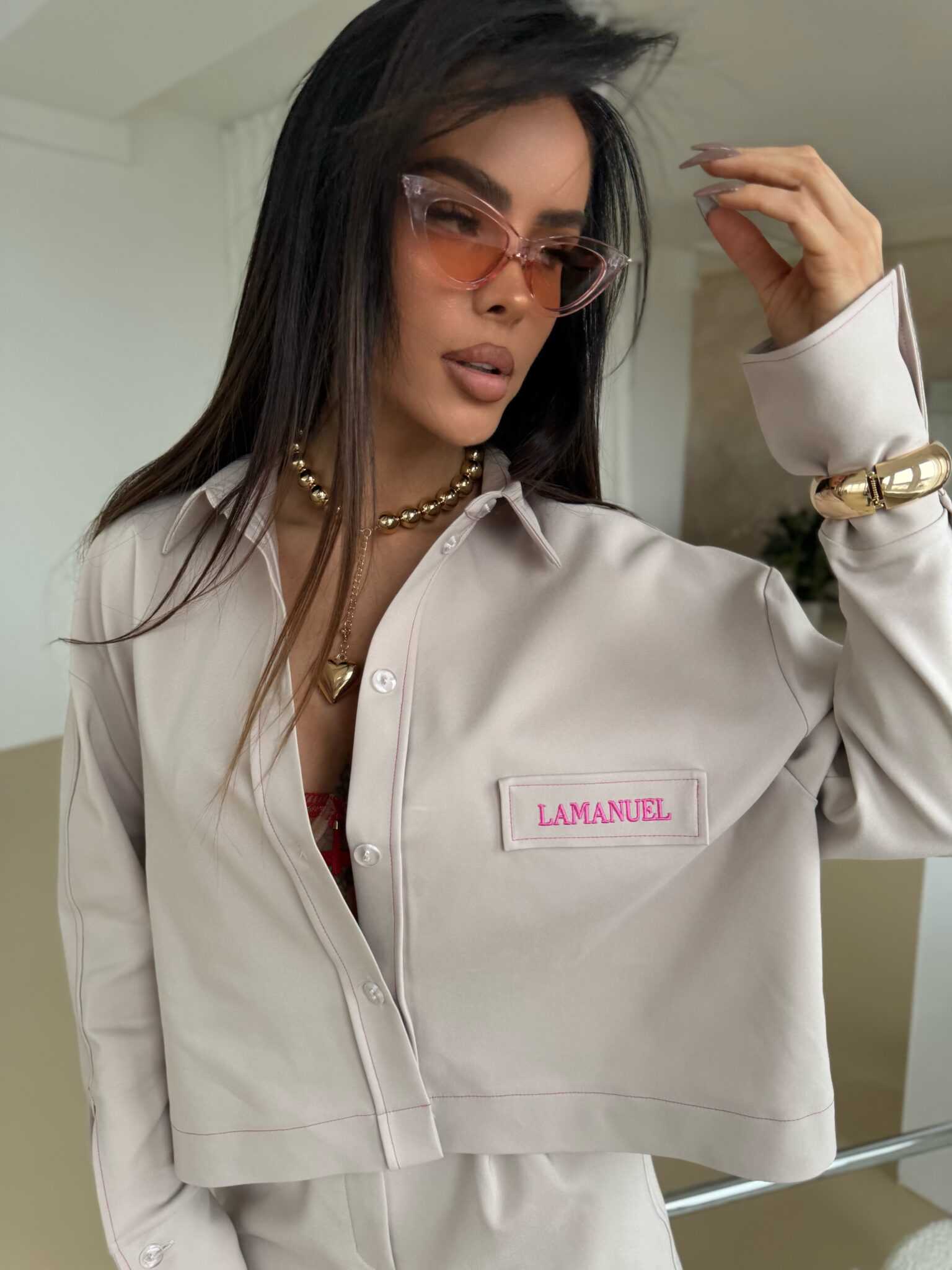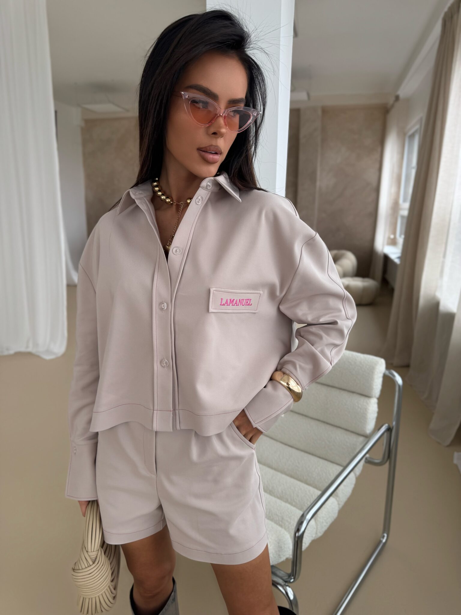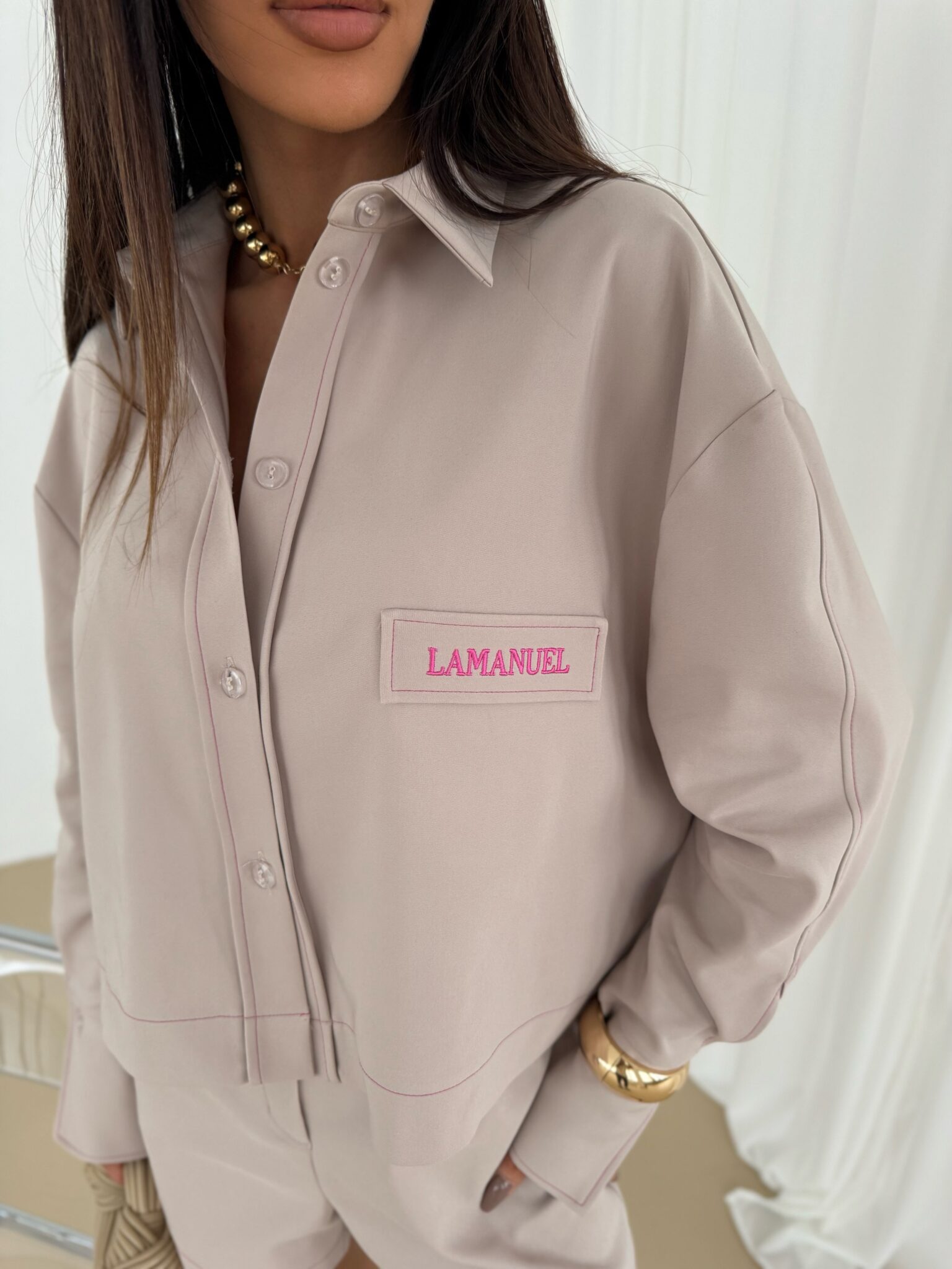 Koszula o luźnym, nowoczesnym kroju z klasycznym kołnierzem i obniżoną linią ramion. Wykonana z wysokiej jakości tkaniny, zapewniającej komfort noszenia i elegancki wygląd. Charakterystycznym elementem koszuli są kontrastowe przeszycia wykonane kolorową nicią, które podkreślają jej konstrukcję i nadają oryginalnego charakteru. Model posiada zapinanie na guziki, szerokie mankiety z rozcięciem oraz ozdobną naszywkę z logo na piersi, co dodaje całości sportowej elegancji. Dzięki swojemu uniwersalnemu fasonowi sprawdzi się zarówno w eleganckich stylizacjach, jak i w codziennych zestawieniach. Może być noszona luźno lub wpuszczona w spodnie czy spódnicę, tworząc różnorodne efekty stylizacyjne.