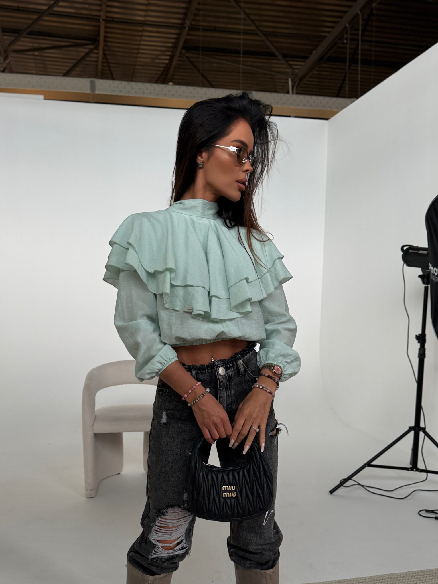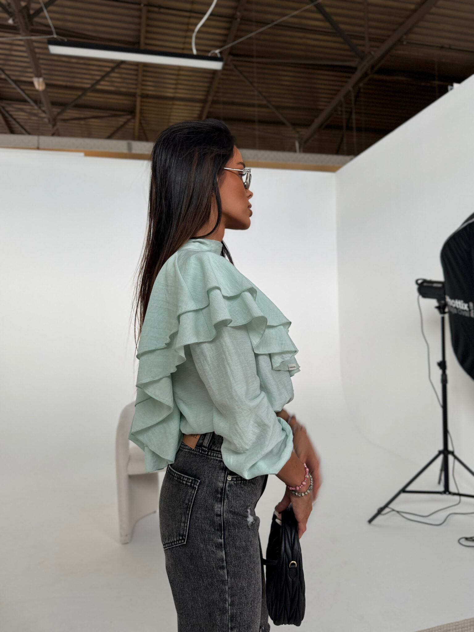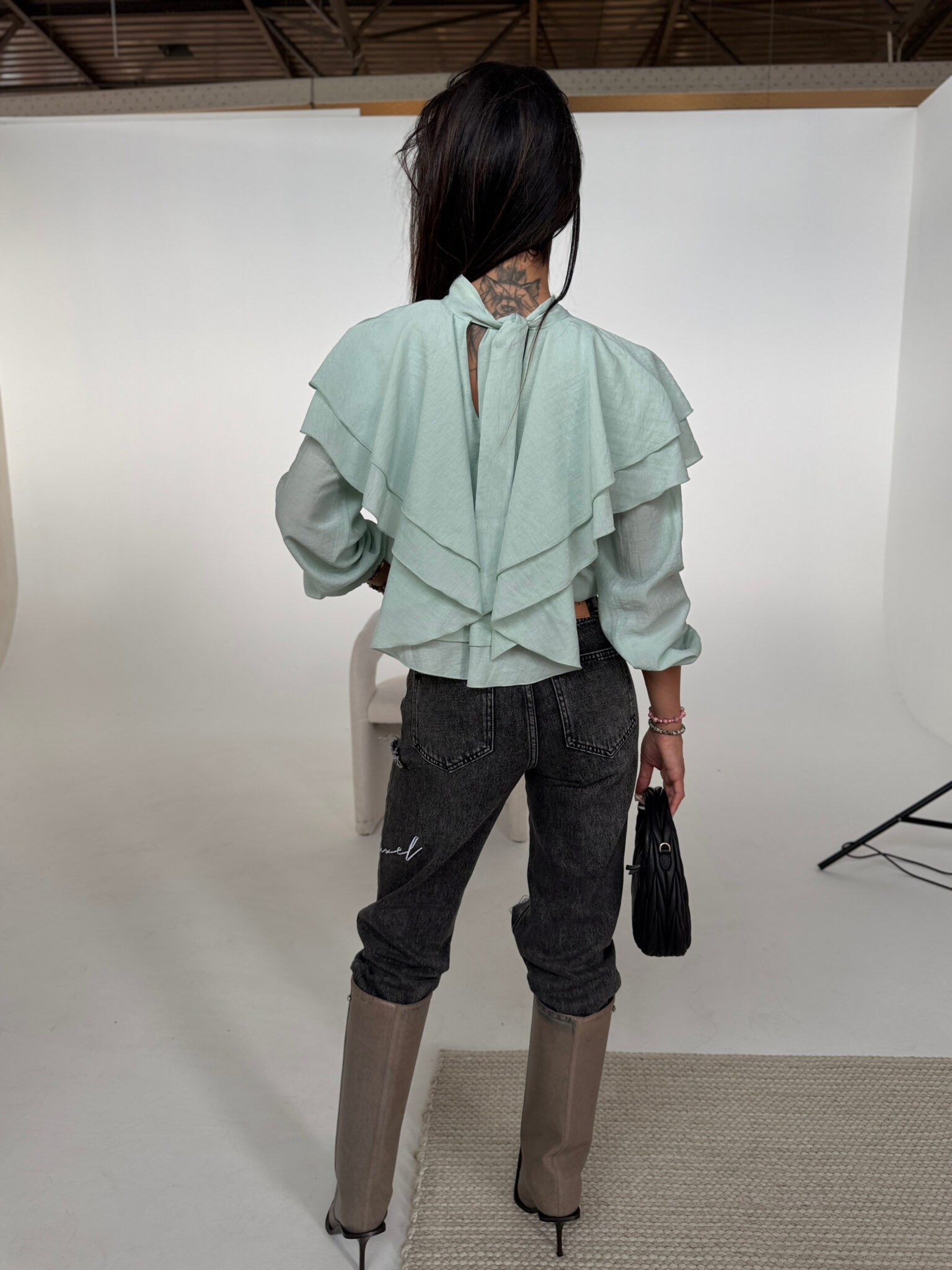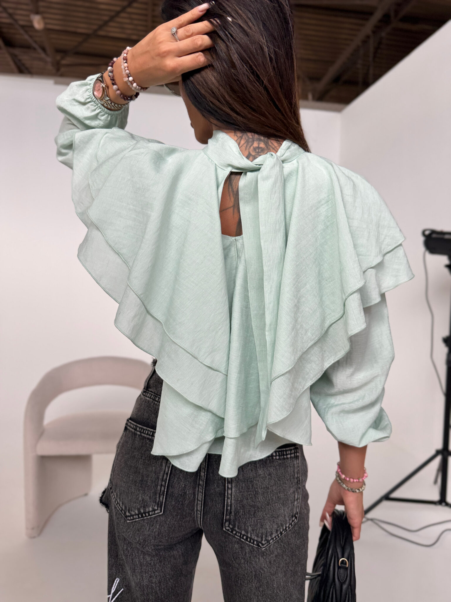 Zwiewna koszula z delikatnej, lejącej tkaniny z dekoracyjnymi falbanami na ramionach i plecach, które nadają całości romantyczny, ale nowoczesny charakter. Model wiązany z tyłu na szyi, co subtelnie eksponuje kark i dodaje lekkości sylwetce. W talii wszyta elastyczna gumka, dzięki której możesz nosić ją wyżej lub niżej – dopasowując fason do swojej figury i stylizacji. Idealna do jeansów, szortów lub eleganckich spodni – to ten typ koszuli, który robi całą robotę.