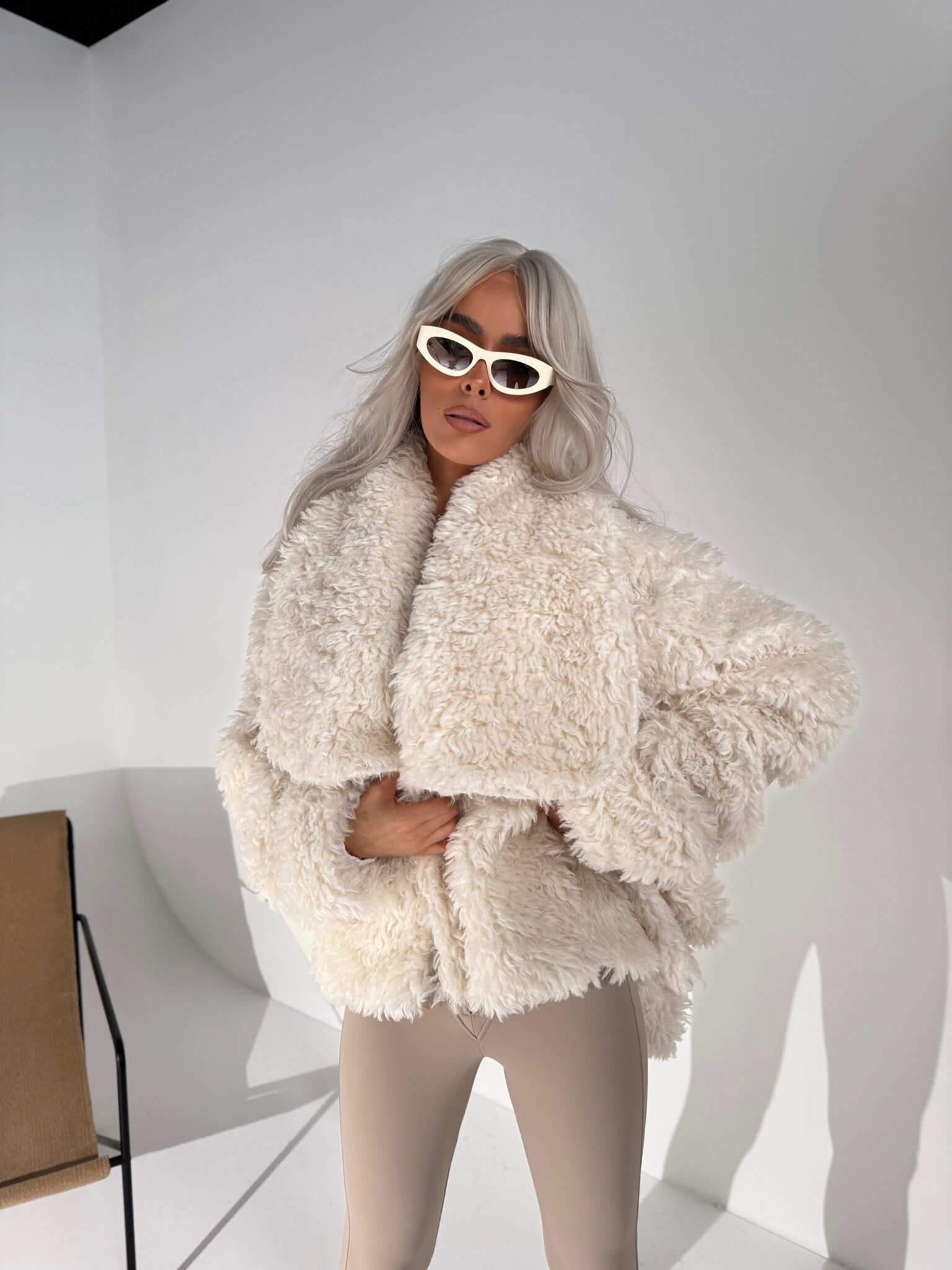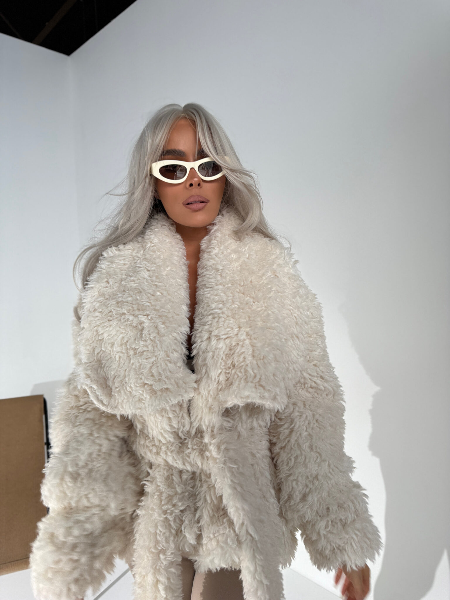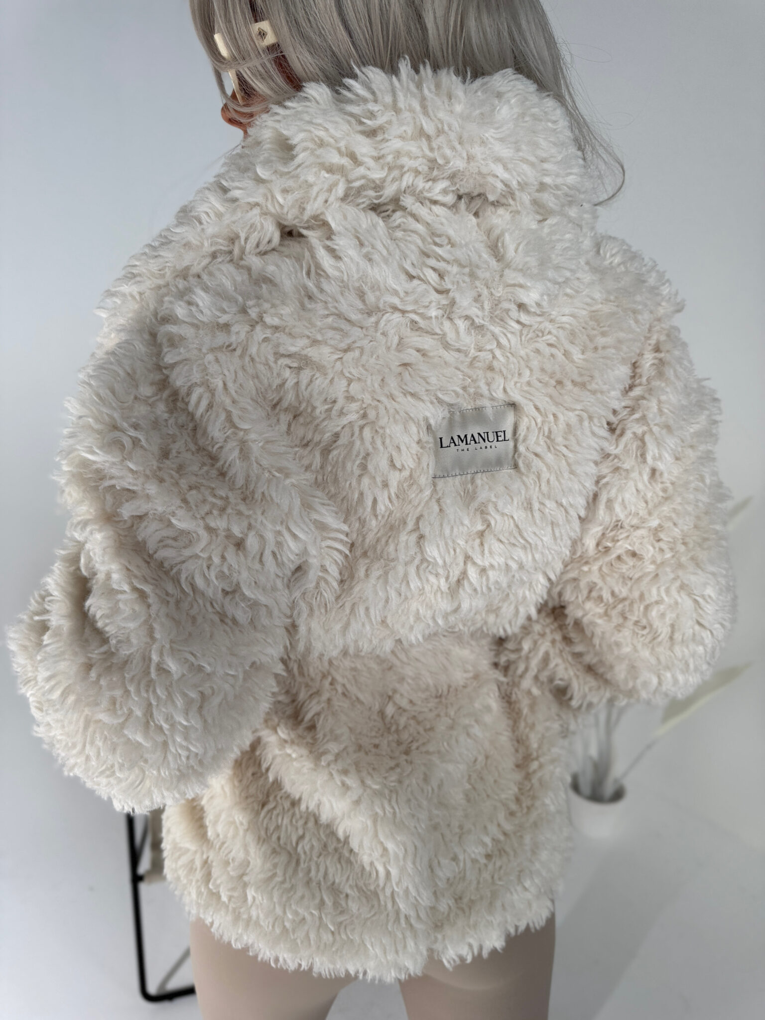 Futro, które mówi samo za siebie. Mięsiste, puszyste, z szerokim kołnierzem i nonszalanckim fasonem – wygląda jak luksus, czuje się jak koc. Pasek w talii pozwala nosić je swobodnie lub bardziej zdefiniowanie, w zależności od nastroju. Na plecach naszywka LAMANUEL, która dyskretnie przypomina, że styl ma znaczenie. To nie jest kolejna zimowa narzutka – to statement piece, który robi całą stylizację.