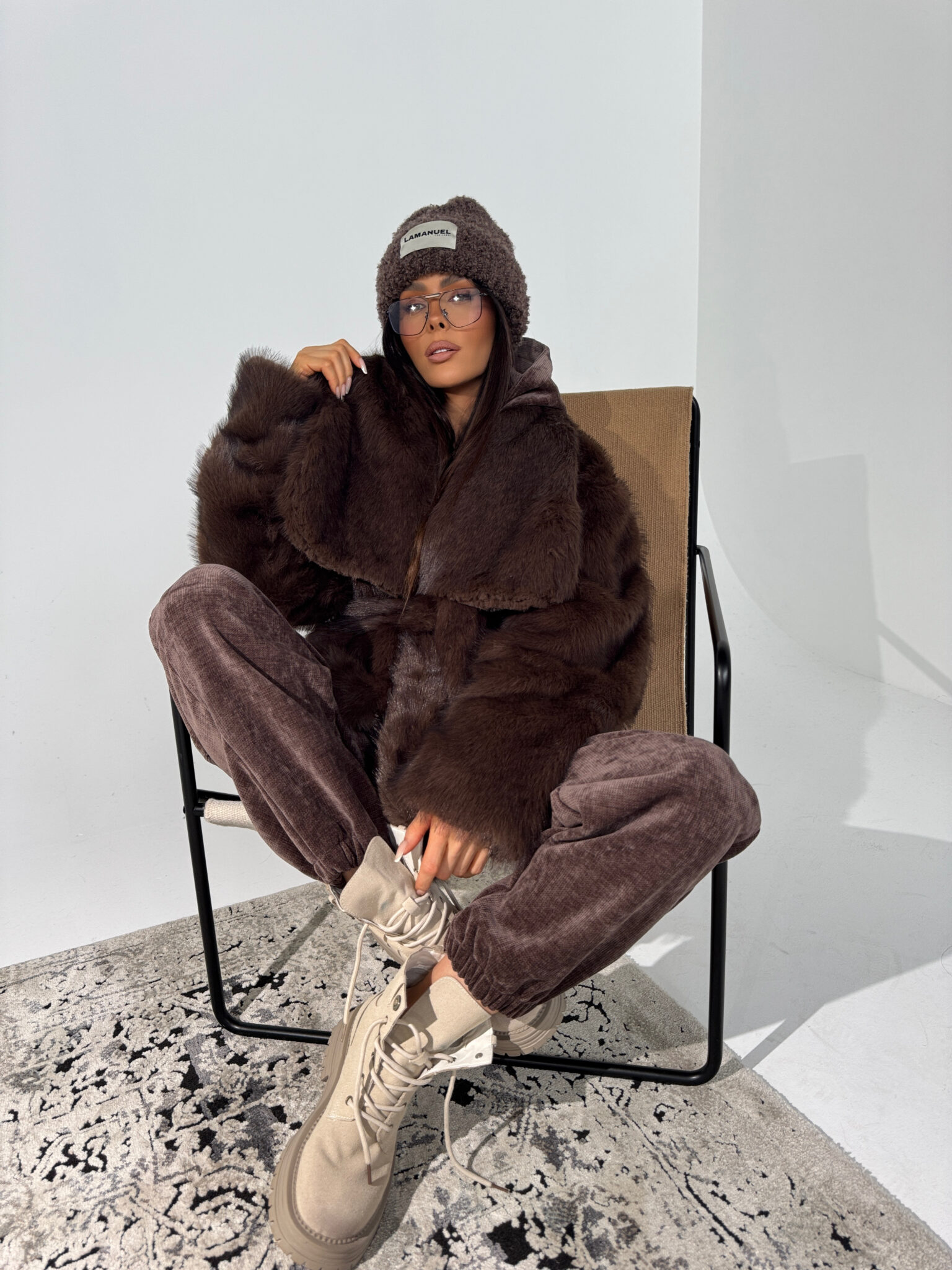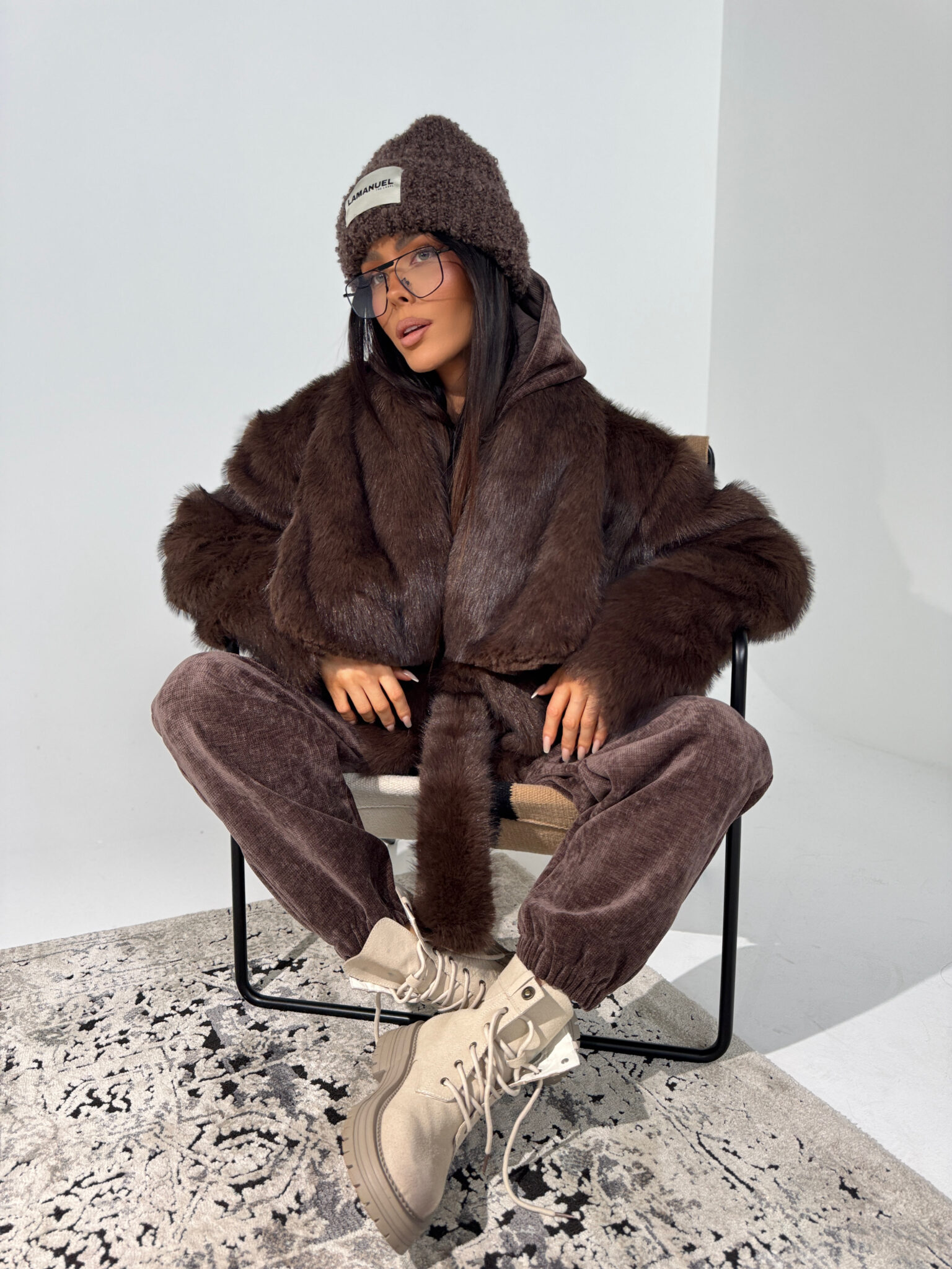 Wyjątkowe futro o luksusowym wyglądzie i kobiecej formie. Mięsista, gęsta tkanina imitująca naturalne futro nadaje całości elegancji, a przy tym skutecznie chroni przed chłodem. Model z obszernym kołnierzem, lekko opuszczoną linią ramion i wiązaniem w pasie, które pięknie podkreśla sylwetkę. Długość do bioder sprawia, że pasuje zarówno do spodni, jak i sukienek. Wygodne, wsuwane rękawy i przemyślany krój zapewniają komfort noszenia i modowy efekt bez wysiłku. Must-have sezonu dla kobiet, które cenią styl, wygodę i jakość wykonania.