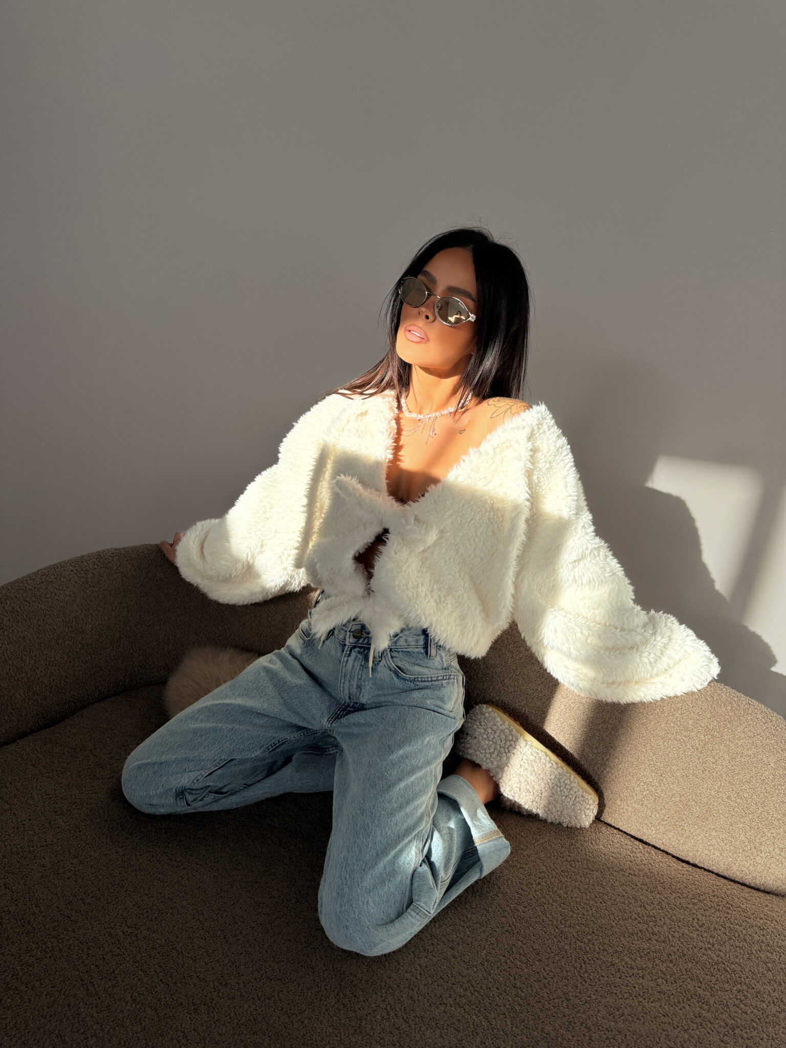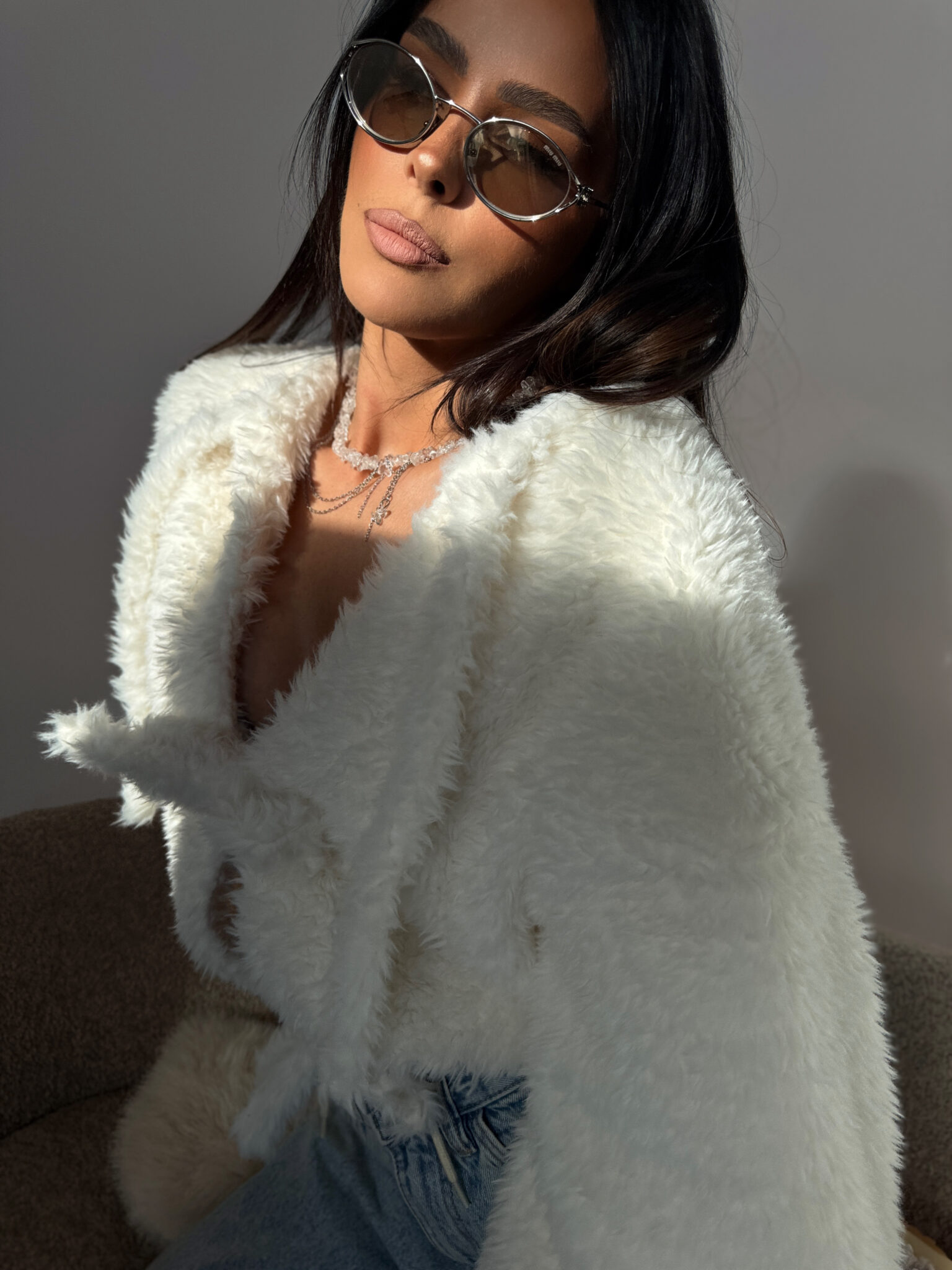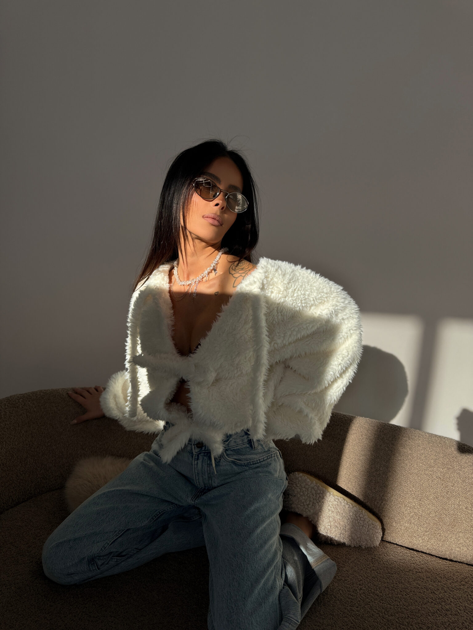 Kurtka z miękkim, puszystym wykończeniem i przyjemną podszewką daje po prostu fajne poczucie komfortu, otula bez przesady, a luźny krój i wiązanie z przodu sprawiają, że wygląda lekko, ale wciąż robi wrażenie – zakładasz ją i od razu czujesz, że to ten element, który spina całą stylówkę bez większego kombinowania.