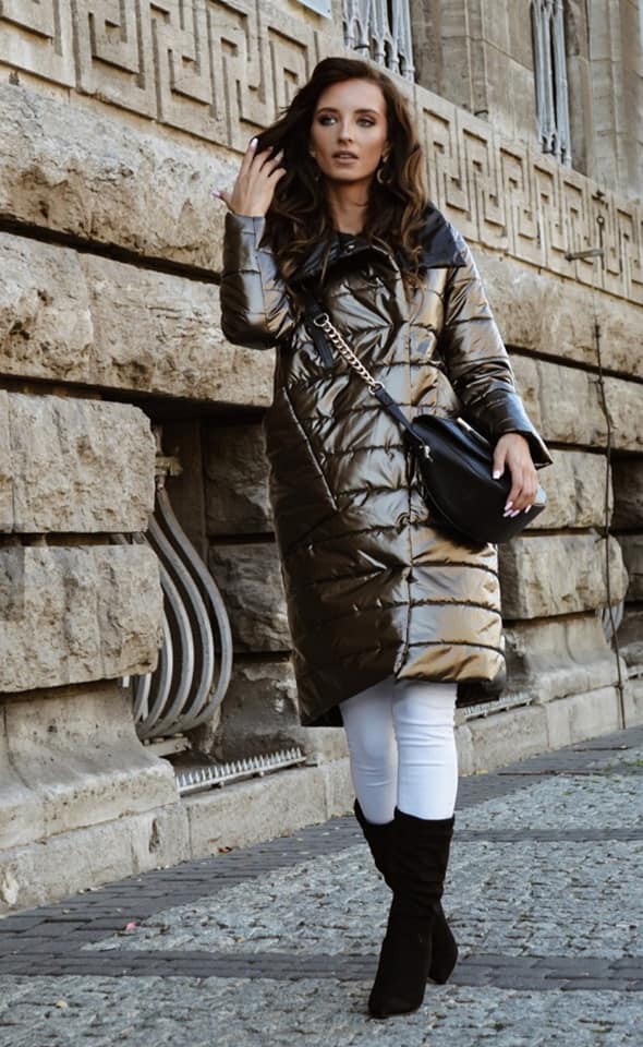 Efektowna, ocieplana kurtka Pinko w metalicznym kolorze. Zapinana na praktyczne napy. Pod spodem znajduje się modna, czarna podszewka. Dodatkowym atutem jest tarcza z logo i praktyczne pojemne kieszenie po bokach. Model ocieplany watoliną. Made in Poland.