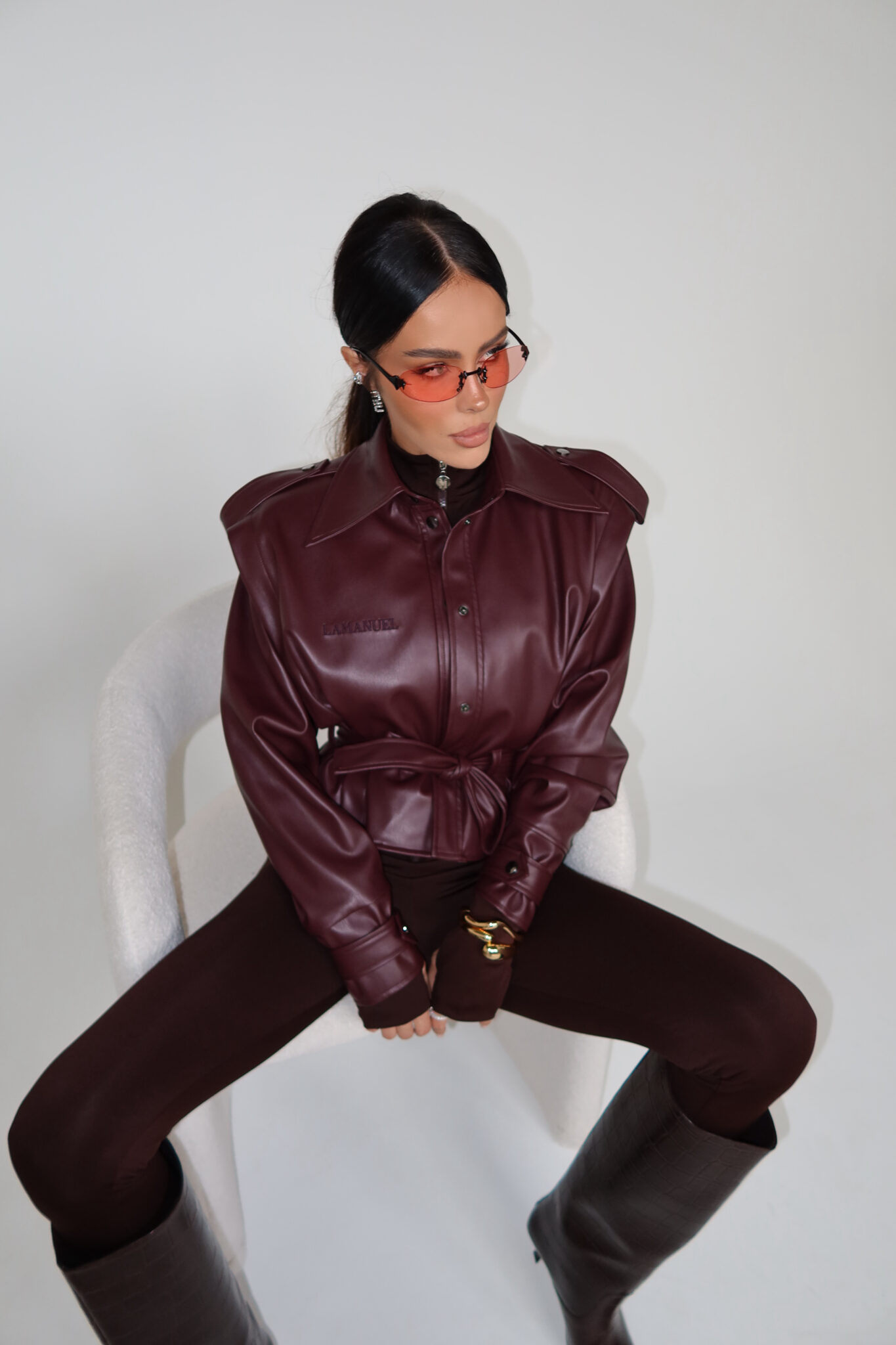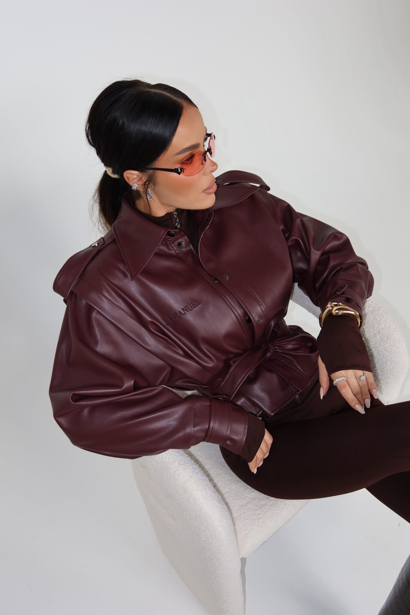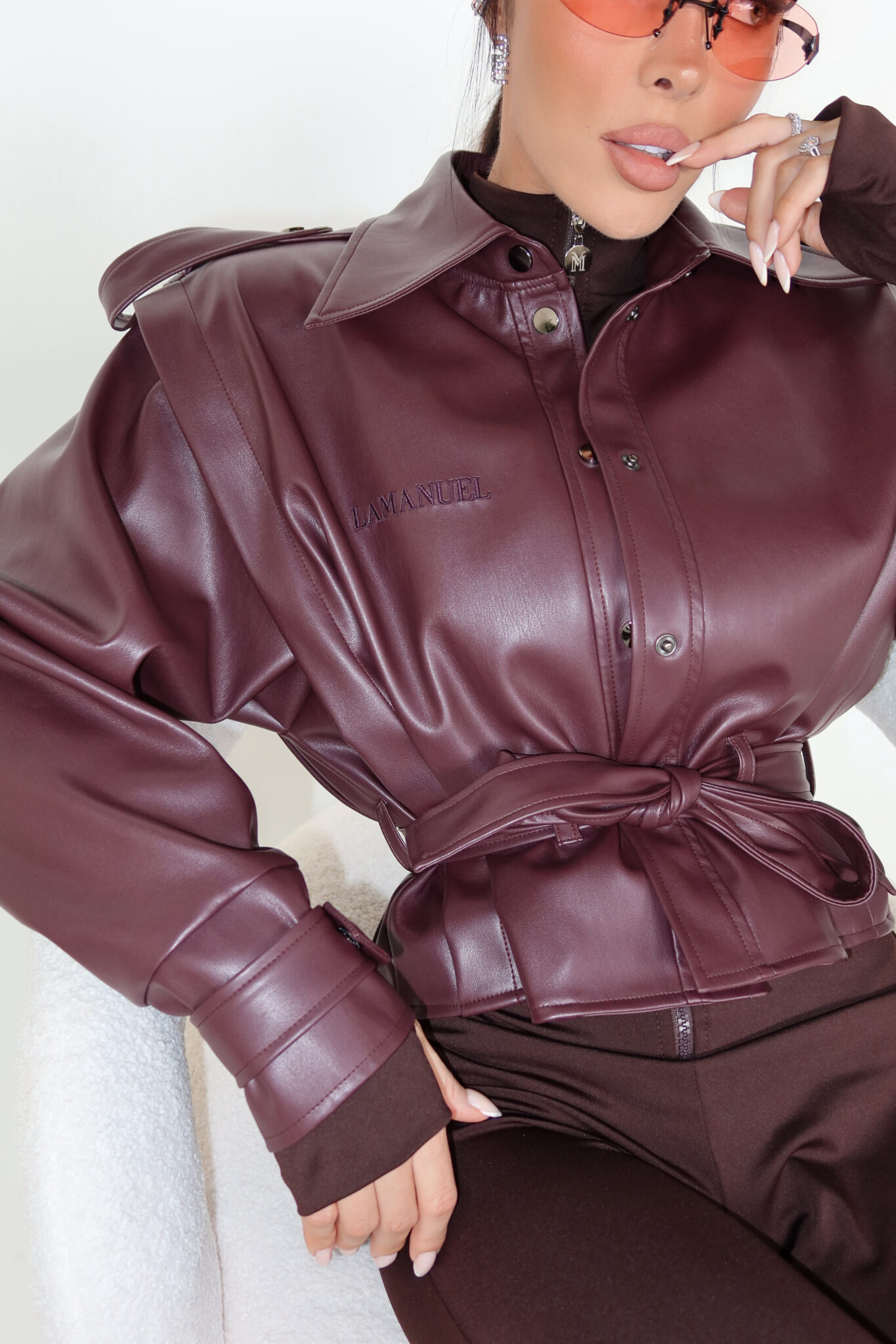 Kurtka z imitacji skóry o lekkim połysku i strukturalnym fasonie. Model zapinany na napy, z klasycznym kołnierzem i szerokimi rękawami zakończonymi mankietem z paskiem. Naramienniki i przeszycia nawiązują do formy trencza, a pasek w talii pozwala podkreślić sylwetkę lub nosić kurtkę na luzie. Na piersi wyhaftowane tonalne logo. Idealna do stylizacji total look, ale też jako mocny akcent w prostym outficie.
