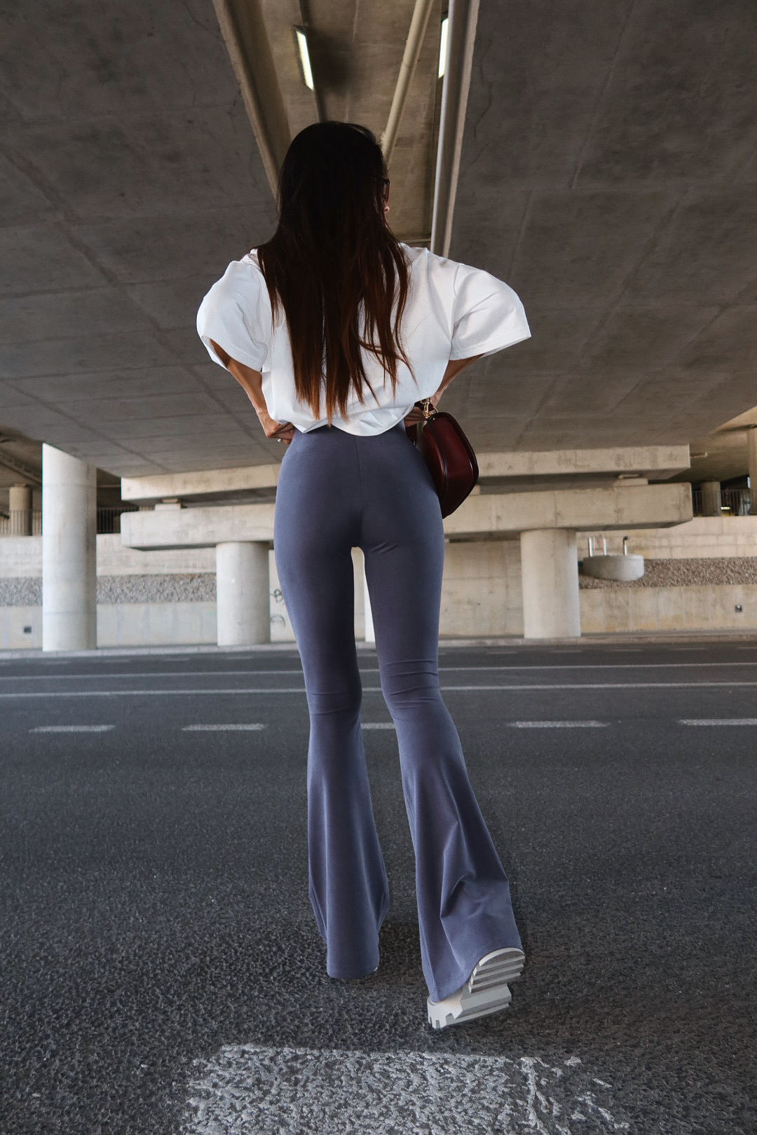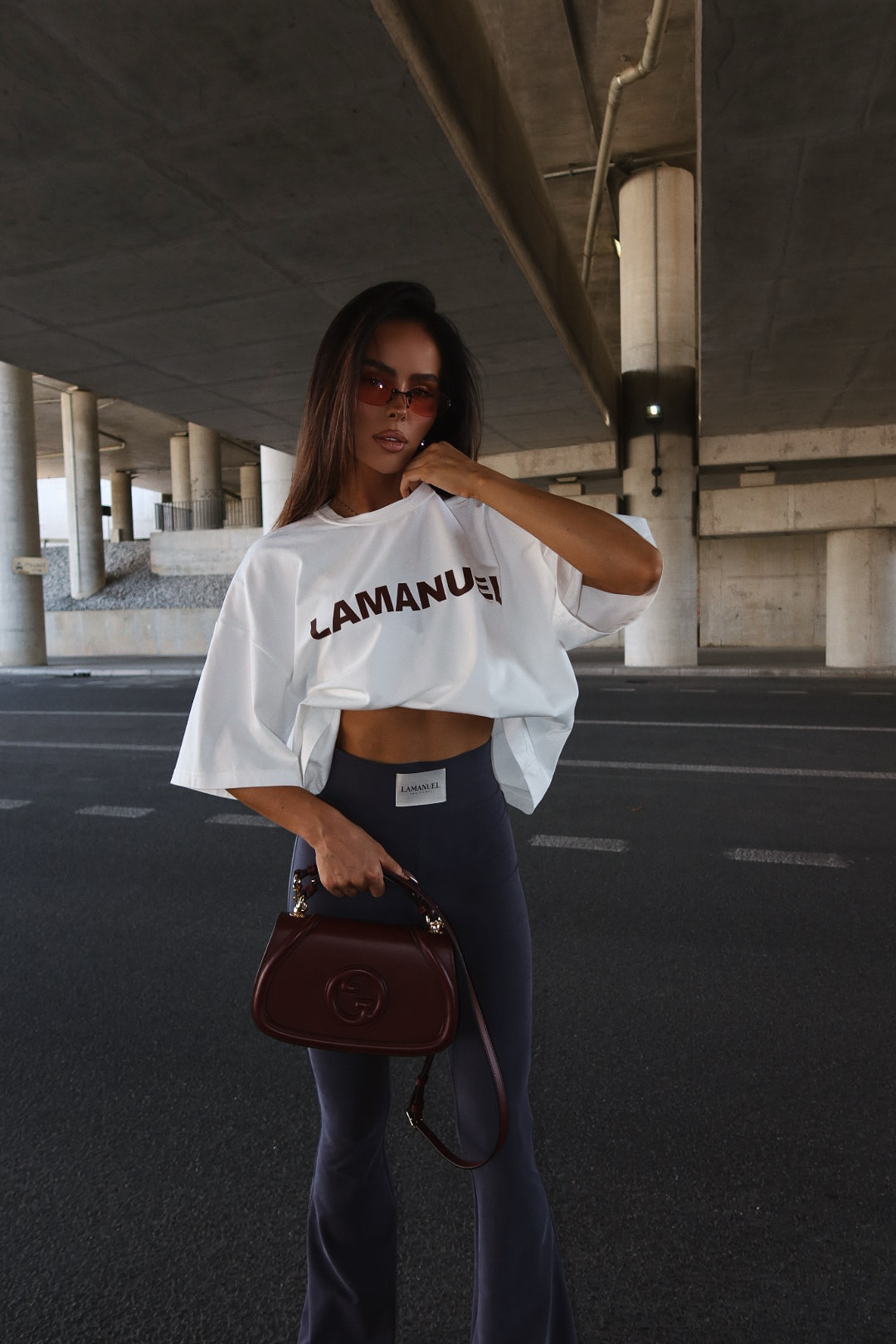 Spodnie o dopasowanym kroju z rozszerzaną nogawką, wykonane z miękkiej i elastycznej dzianiny. Wysoki stan podkreśla talię i zapewnia komfort noszenia, a rozszerzenie nogawek ku dołowi optycznie wydłuża sylwetkę. Szeroka guma w pasie z logo lamanuel dodaje wyrazistego charakteru i sprawia, że spodnie idealnie dopasowują się do ciała. Model doskonale sprawdzi się zarówno w codziennych stylizacjach, jak i w bardziej sportowym wydaniu.