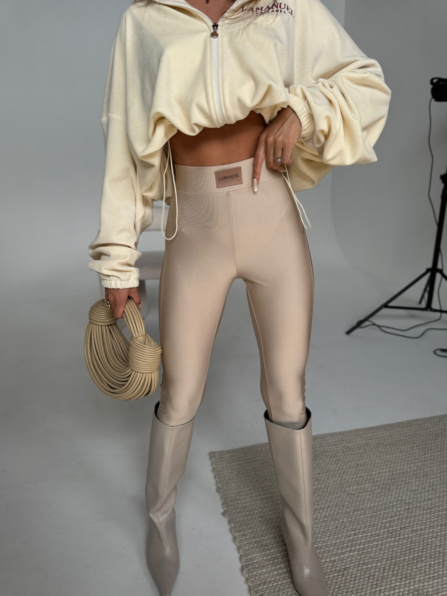 Legginsy z wysokim stanem uszyte z elastycznej lycry o subtelnym połysku, która idealnie przylega do ciała, podkreślając sylwetkę. Model wyróżnia się pionowymi przeszyciami z przodu i z tyłu, które optycznie wydłużają nogi i nadają całości bardziej dopracowanego charakteru. Z tyłu dodatkowe cięcia modelujące pośladki. Z przodu naszyta minimalistyczna metka z logo lamanuel. Nowoczesna forma, która łączy sportowy komfort z dopracowaną estetyką.