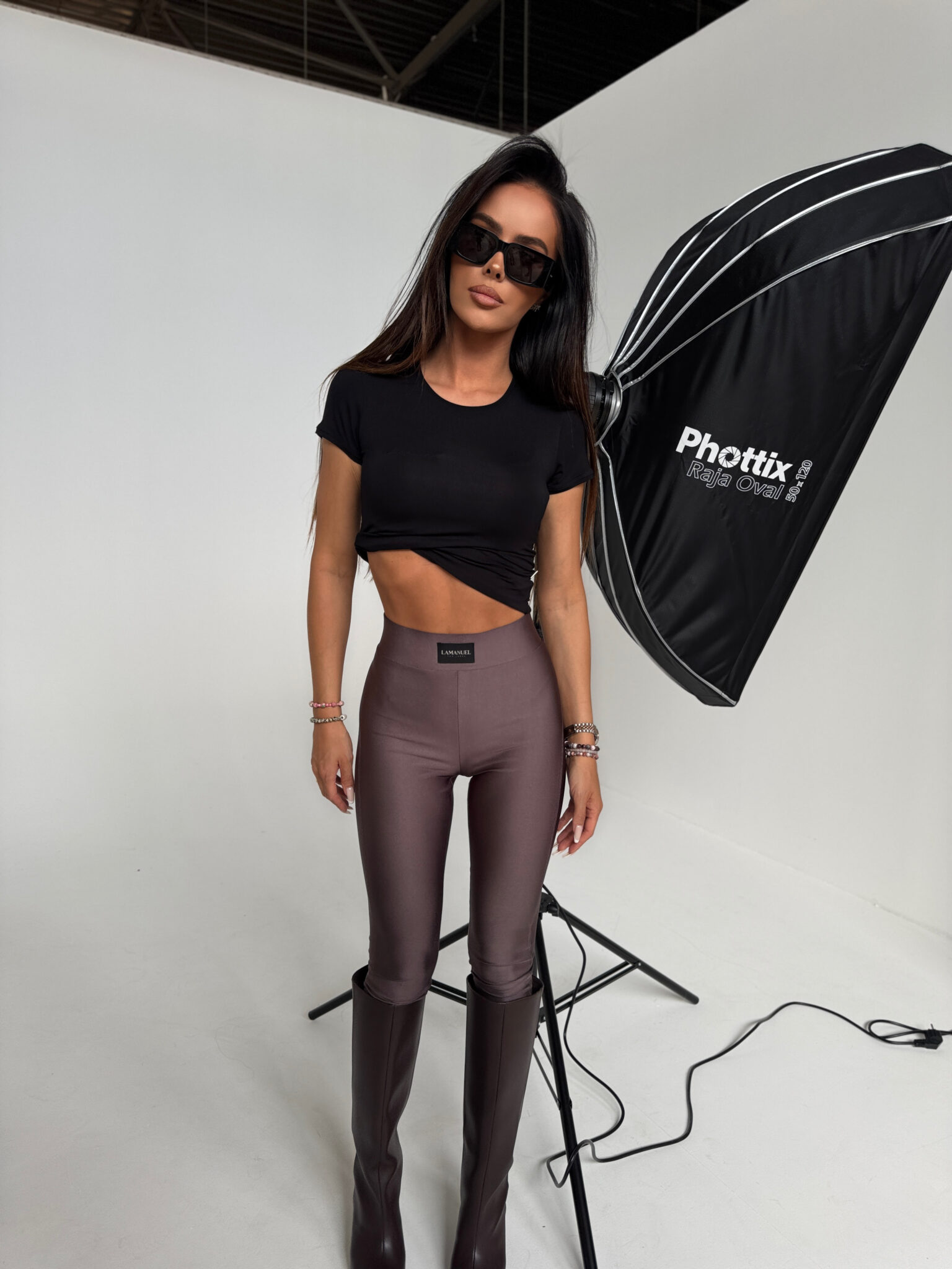 Legginsy z wysokim stanem uszyte z elastycznej lycry o subtelnym połysku, która idealnie przylega do ciała, podkreślając sylwetkę. Model wyróżnia się pionowymi przeszyciami z przodu i z tyłu, które optycznie wydłużają nogi i nadają całości bardziej dopracowanego charakteru. Z tyłu dodatkowe cięcia modelujące pośladki. Z przodu naszyta minimalistyczna metka z logo lamanuel. Nowoczesna forma, która łączy sportowy komfort z dopracowaną estetyką.