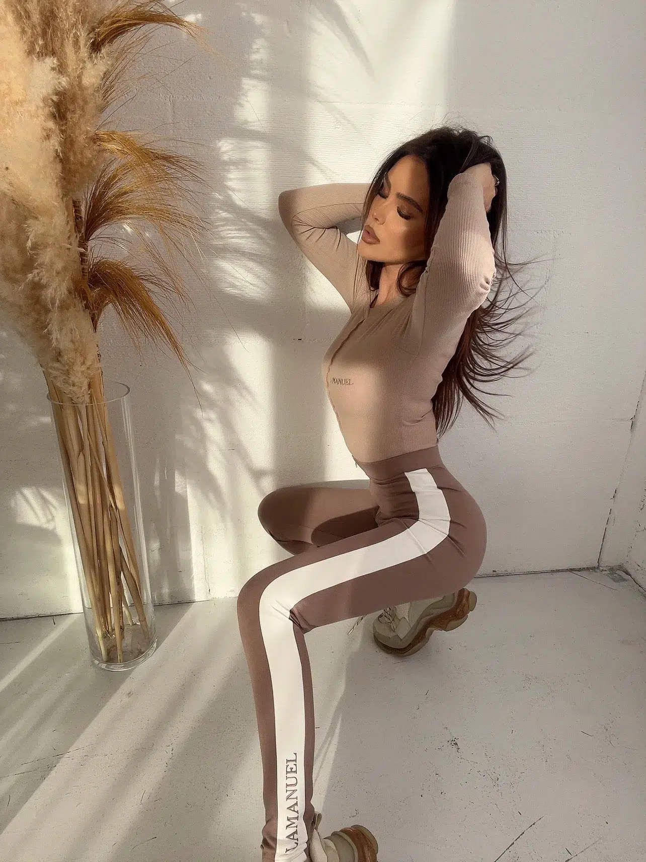 Legginsy damskie to jeden z najbardziej pożądanych elementów garderoby – zwłaszcza wiosną, gdy możemy zestawić je z body, bluzą, czy też bluzką i kurtką. Legginsy damskie idealnie podkreślają sylwetkę. Wykonane są z przyjemnego w dotyku materiału, a także posiadają wysoki stan. Wyróżniają je lampasy z subtelnym logo marki na łydce. Made in Poland .