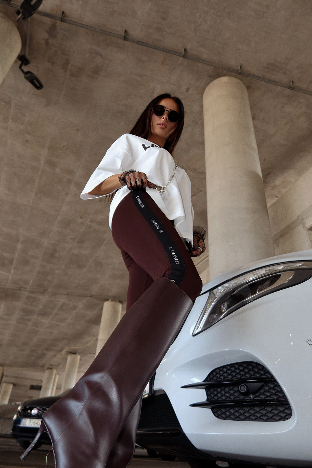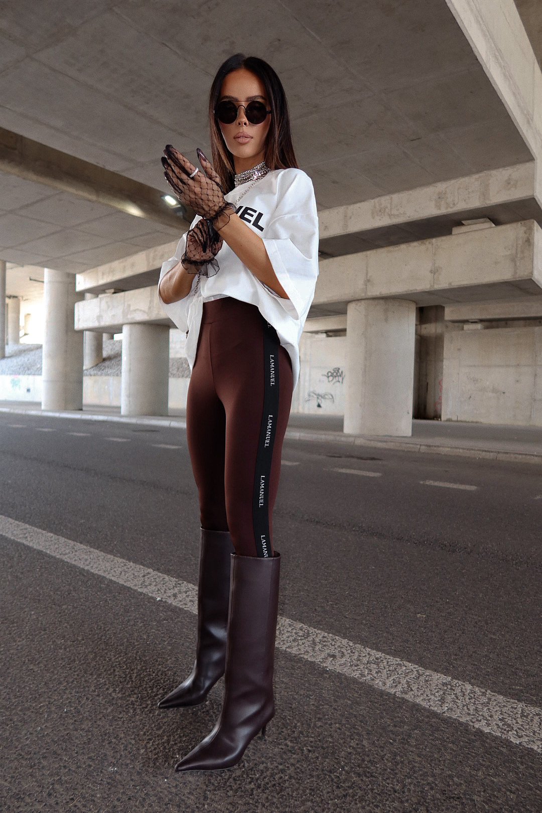 Modelujące legginsy z elastycznej lycry z charakterystyczną logowaną taśmą wzdłuż nogawek. Wysoki stan pięknie podkreśla talię, a mocno dopasowany krój akcentuje sylwetkę. Idealne do sportowych i miejskich stylizacji — noś je do oversize’owych t-shirtów, bluz czy marynarek.
