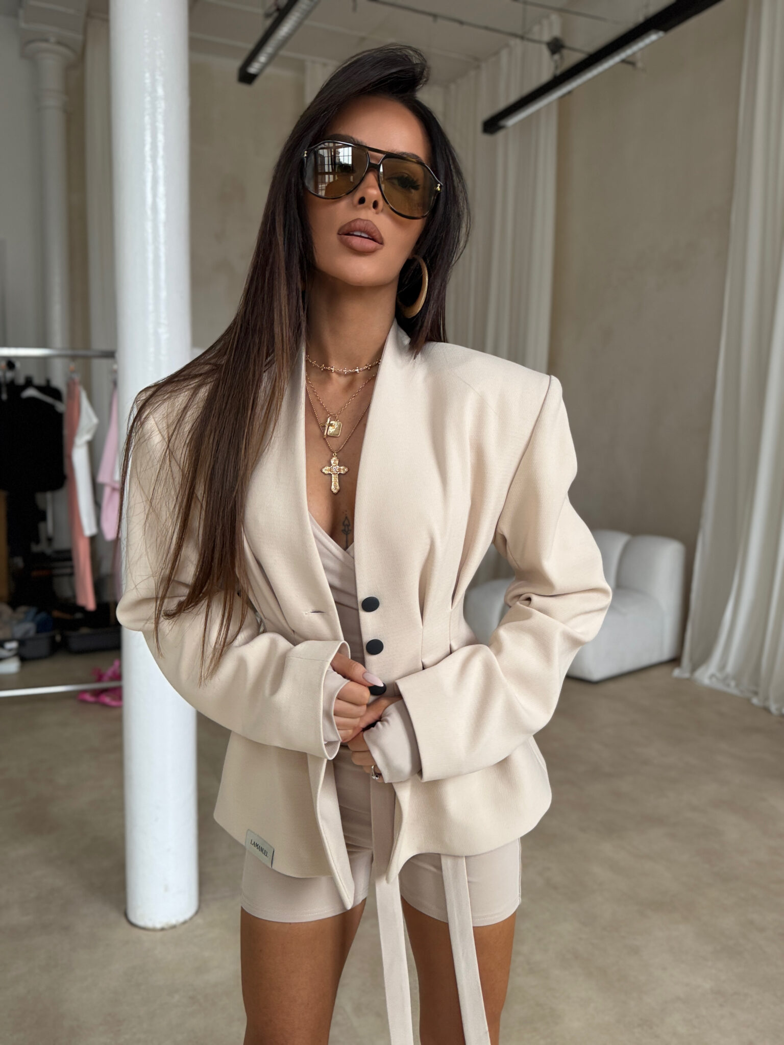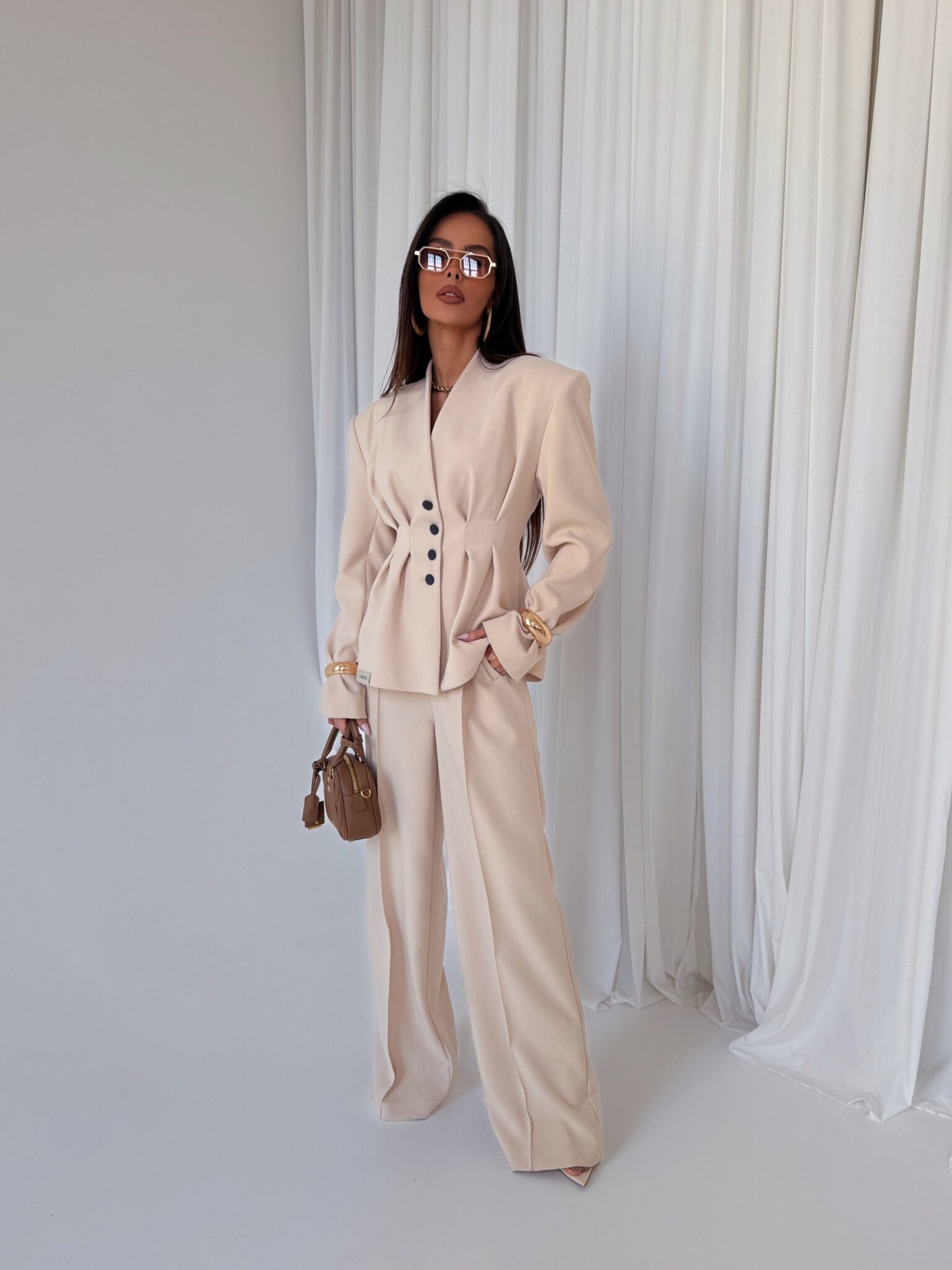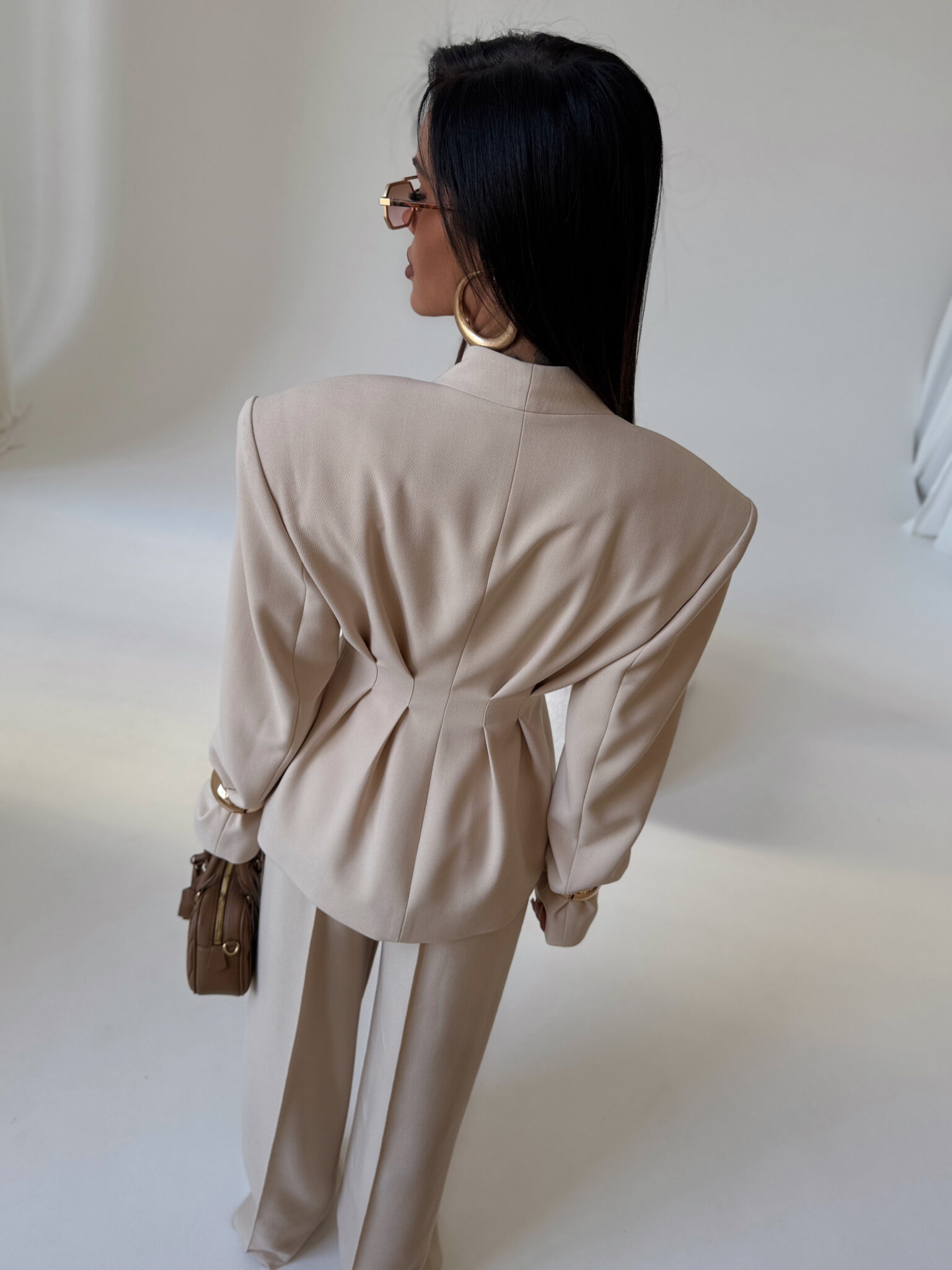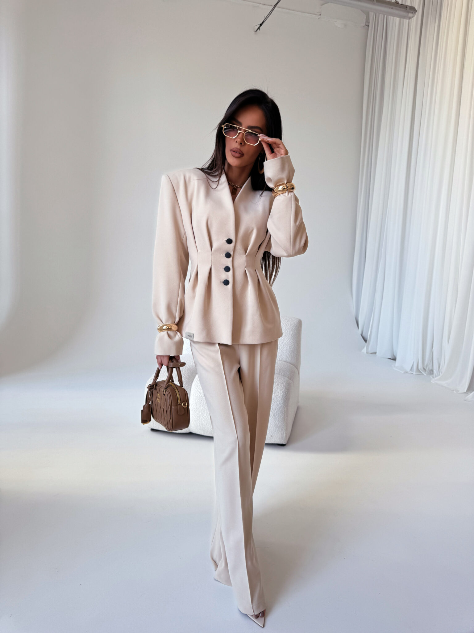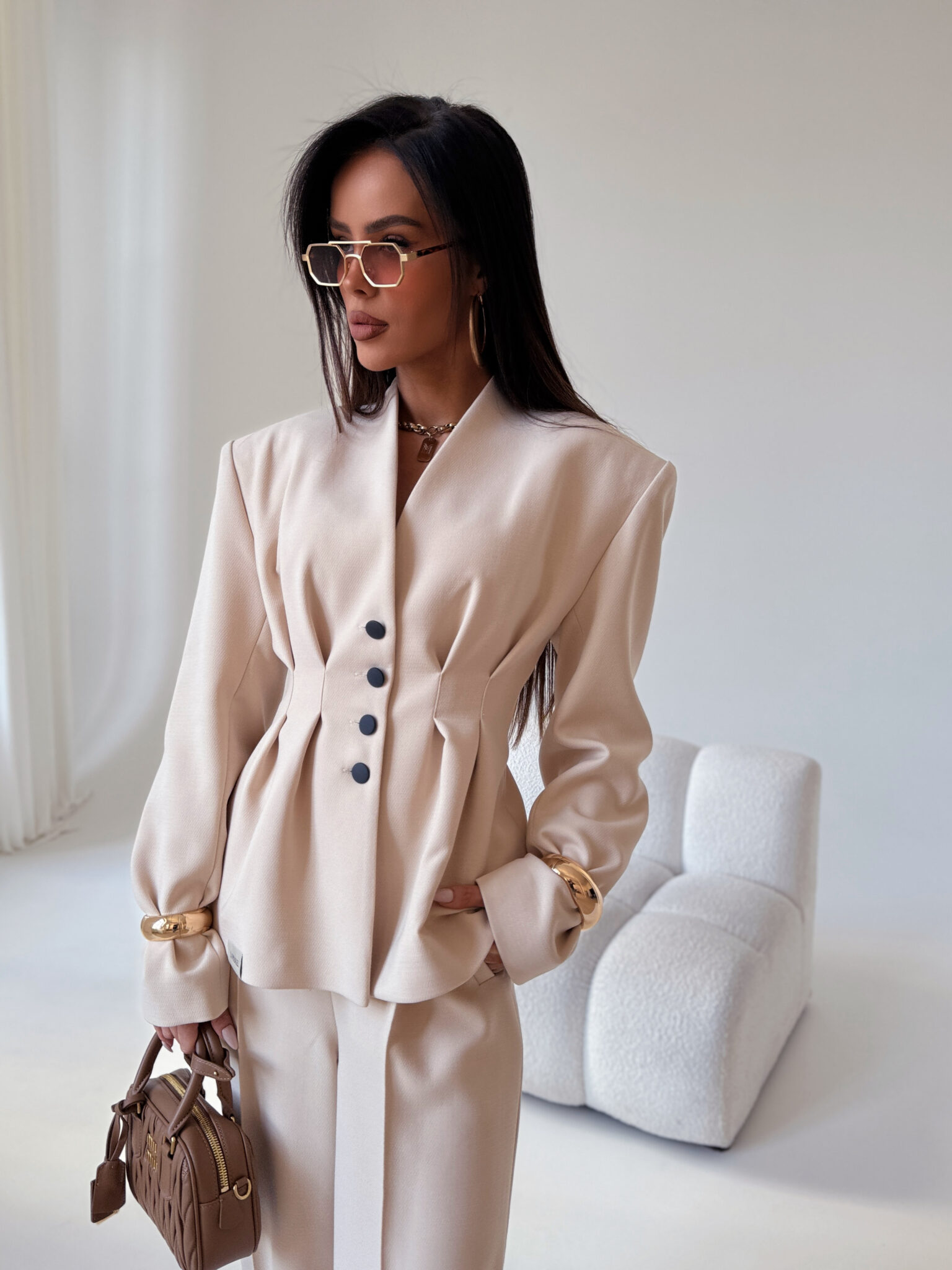 Marynarka o dopasowanym kroju z mocno zaznaczoną linią ramion i taliowaniem podkreślającym sylwetkę. Model zapinany na pionowo rozmieszczone guziki. Strukturalna tkanina nadaje jej elegancki charakter, a detale w postaci precyzyjnych przeszyć i zakładek z tyłu dodają nowoczesnego wyrazu. Doskonale sprawdzi się zarówno w klasycznych, jak i bardziej stylizowanych zestawach. Połącz ją do zestawu ze spodniami BUSINESS!