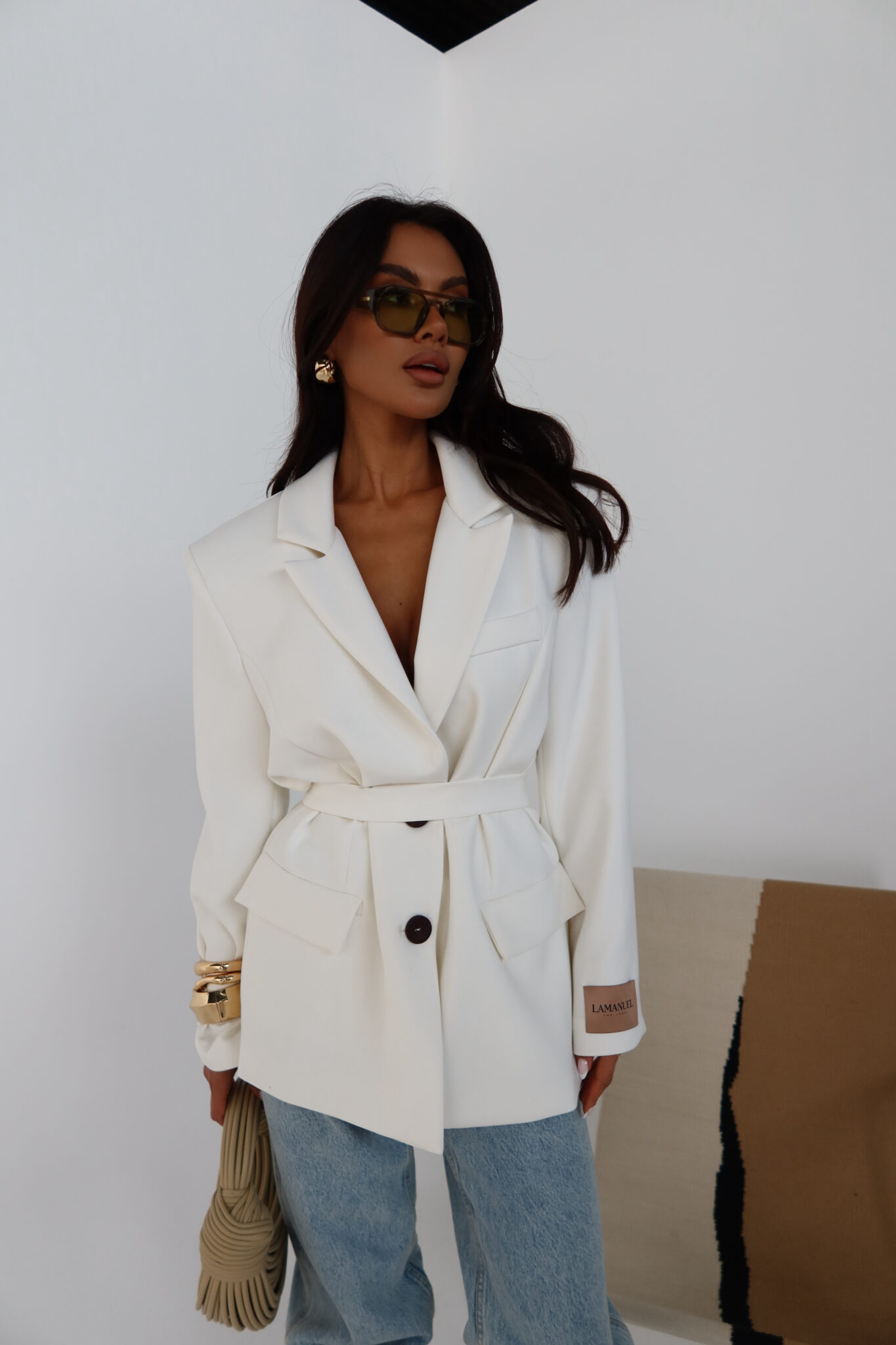 Marynarka o klasycznym kroju z dołączonym paskiem zapinanym na dekoracyjne guziki. Pasek można nosić zarówno z przodu, jak i z tyłu, podkreślając talię lub tworząc swobodniejszy look. Model z klapami, kieszeniami z patkami i subtelną metką z logo na rękawie. Idealna baza do eleganckich i casualowych stylizacji.
