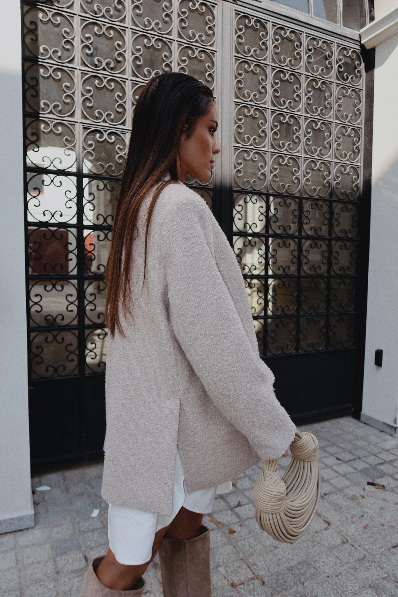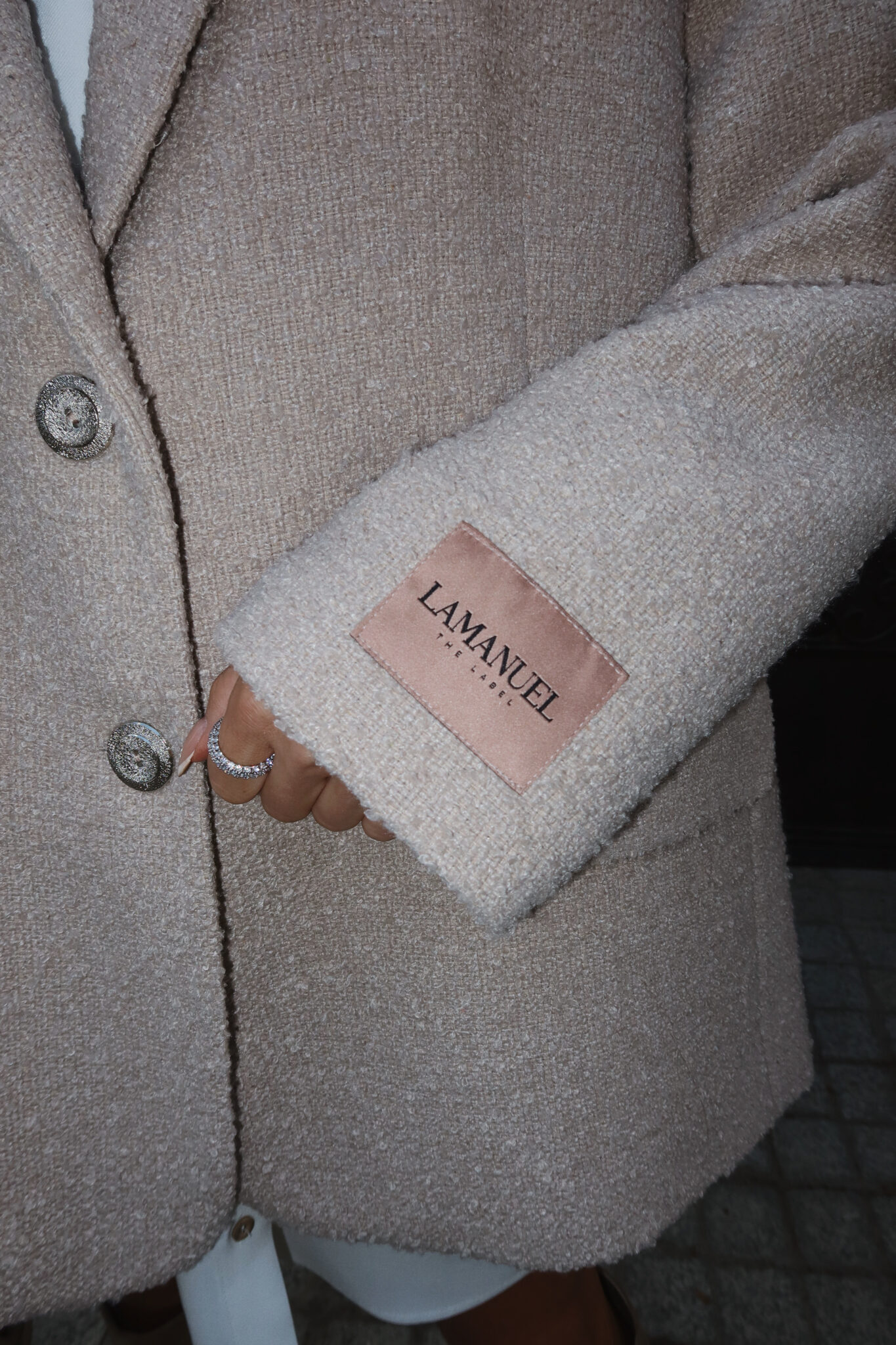 Marynarka o fakturze boucle z wyrazistą strukturą i dopracowanym krojem, który pozwala nosić ją jak lekki płaszcz. Miękka, ale trzymająca formę, z szerokimi klapami i ozdobnymi guzikami, sprawdzi się zarówno w eleganckich, jak i codziennych zestawieniach. Idealna do warstwowych stylizacji – narzucona na koszulę, sweter czy nawet cienką kurtkę. Stylowa alternatywa dla klasycznego okrycia wierzchniego.