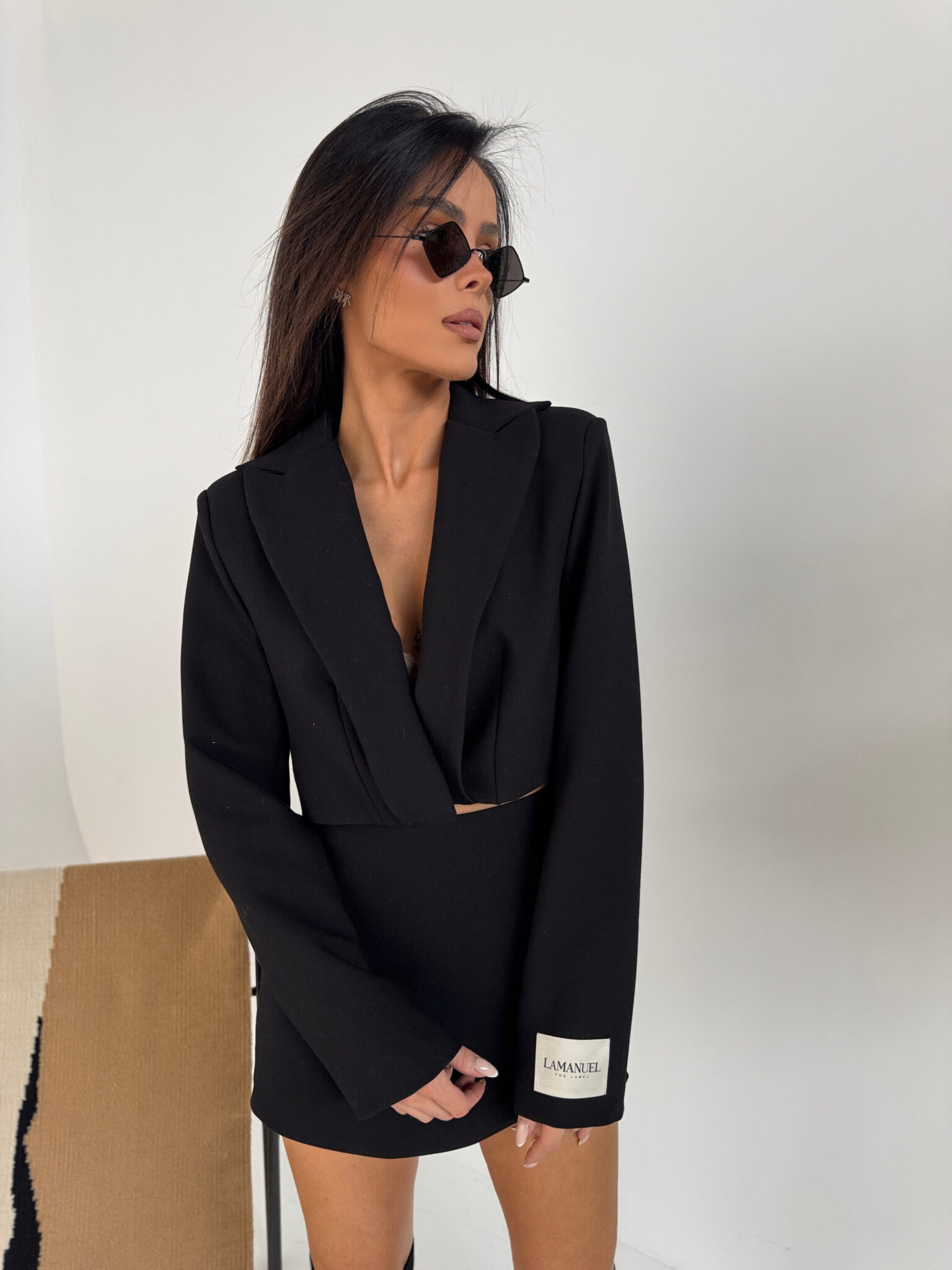 Krótka marynarka o nowoczesnym, pudełkowym kroju. Posiada głęboki dekolt, klasyczny kołnierz oraz długie rękawy zakończone metką z logo. Idealny do stylizacji wieczorowych i codziennych. Świetnie prezentuje się zarówno solo, jak i w komplecie z szortami.