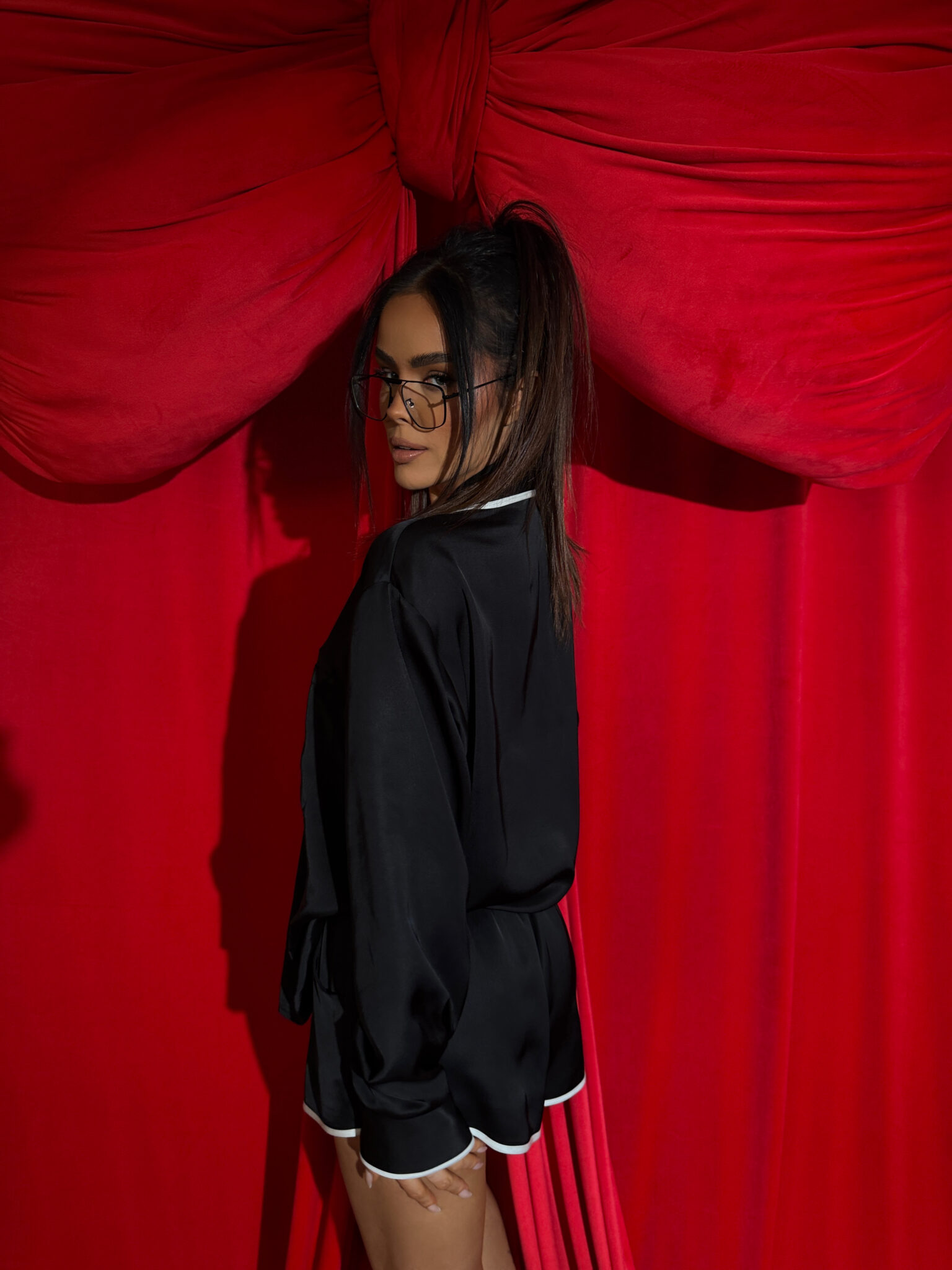 Klasyczny fason i luksusowe wykończenie – ten komplet to esencja elegancji w domowym wydaniu. Uszyty z naturalnej wiskozy o satynowym połysku, zachwyca lekkością, miękkością i tym, jak pięknie układa się na ciele. Koszula o luźnym kroju z kontrastową lamówką i krótkie szorty z elastyczną talią tworzą look kobiecy, wygodny i dopracowany w każdym detalu.