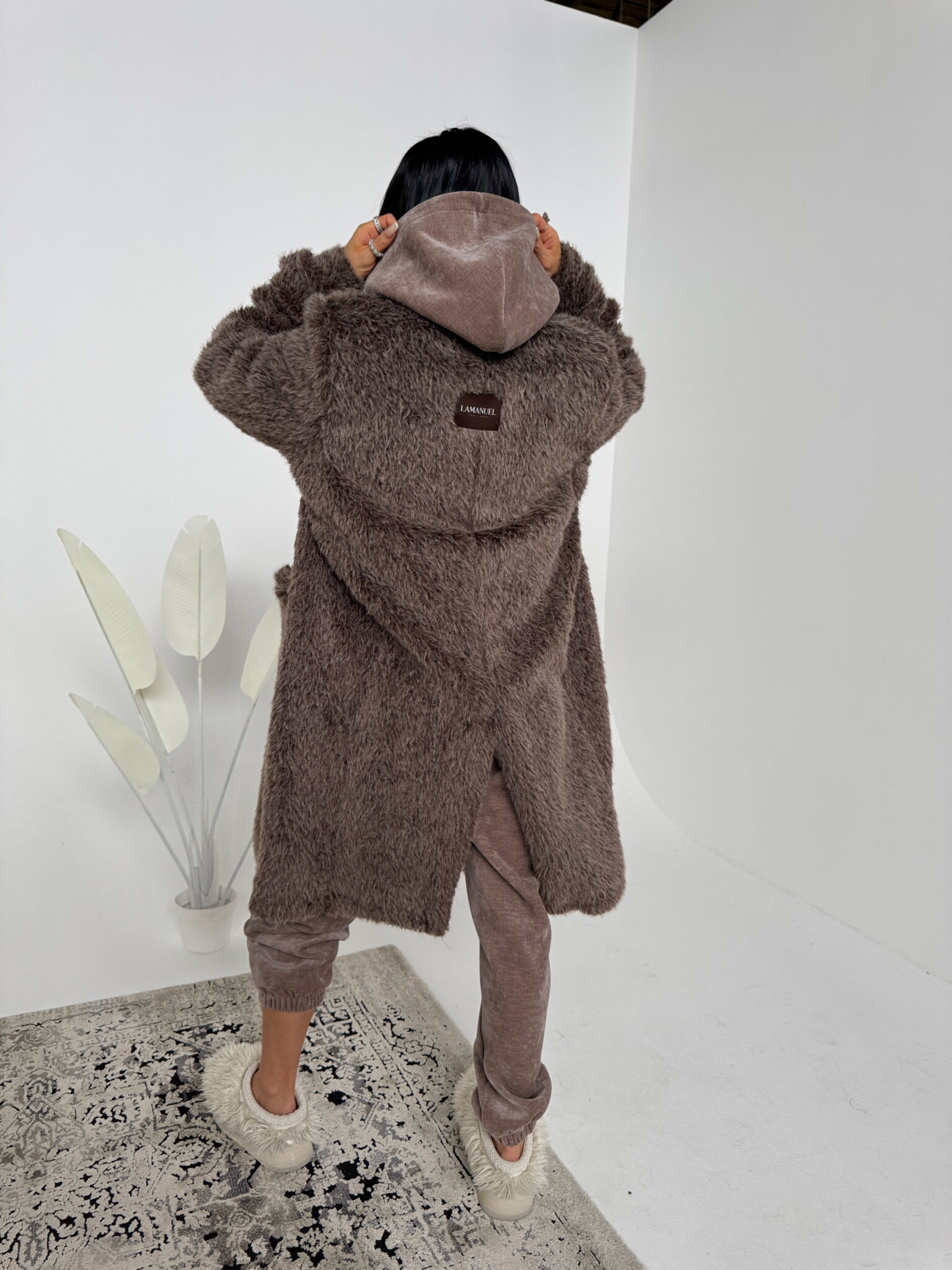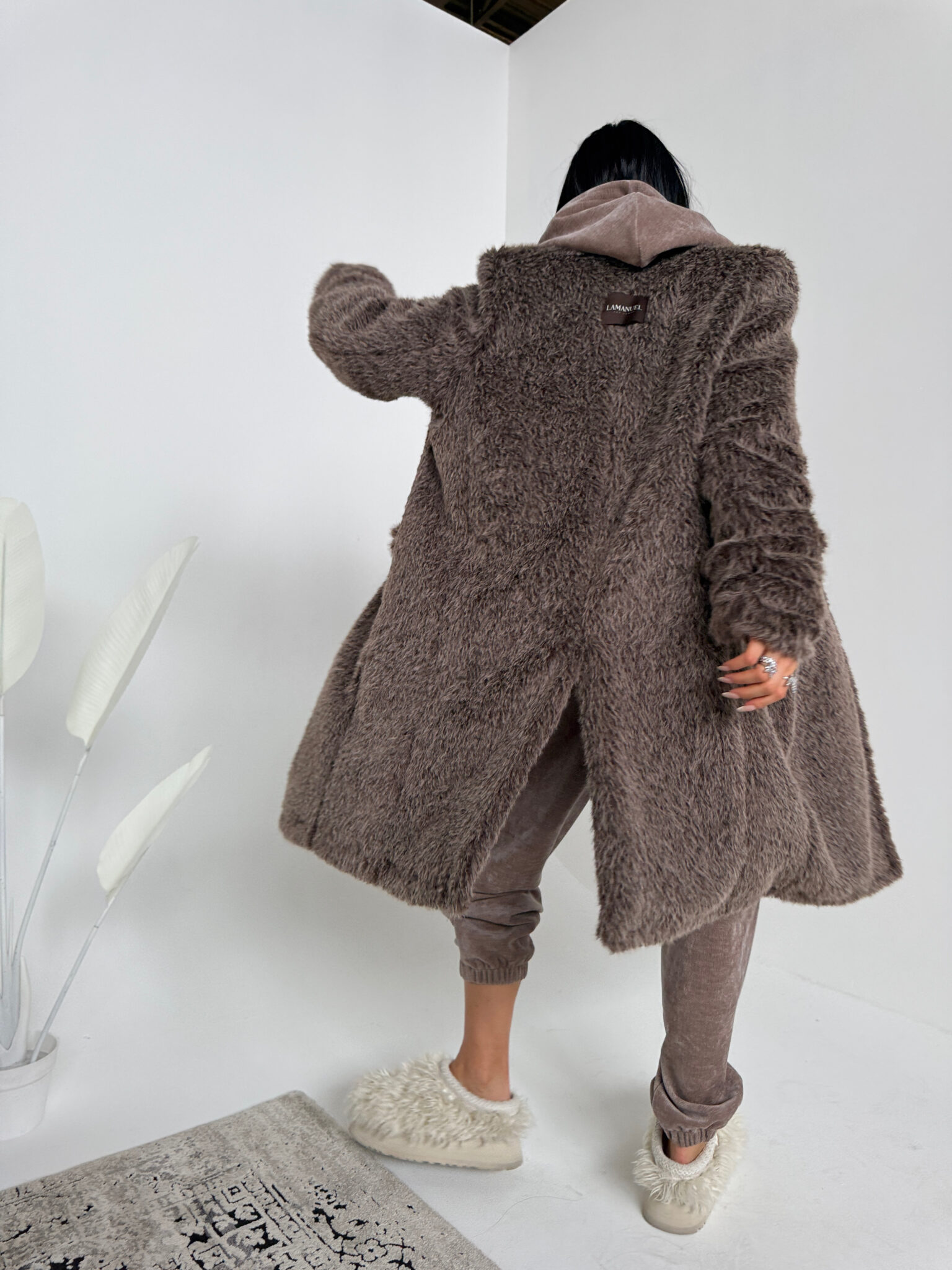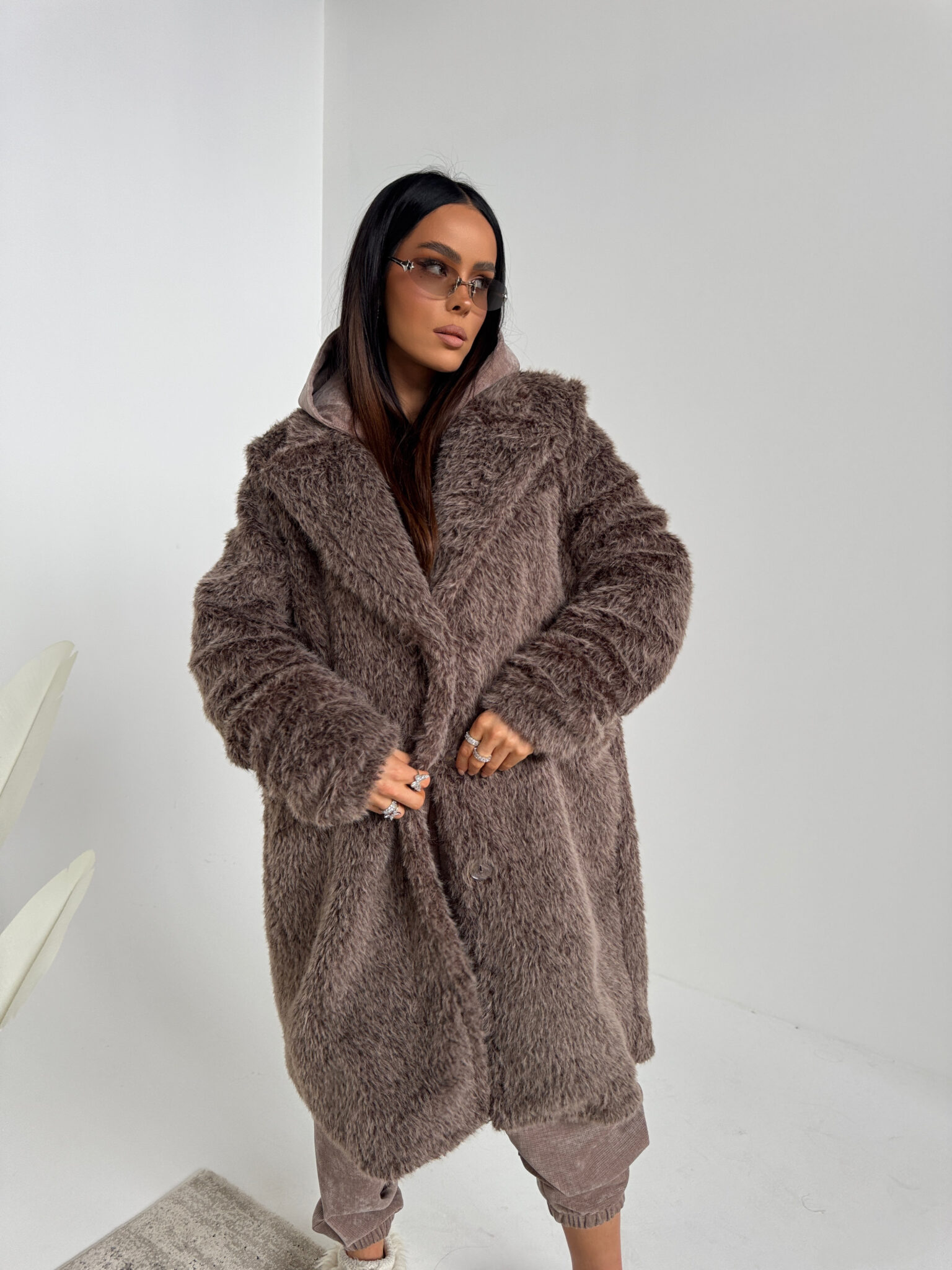 Ciepły, puszysty, spektakularny – ten płaszcz to zimowy statement piece, który łączy wygodę i styl na najwyższym poziomie. Wykonany z wyjątkowo mięsistego i miękkiego materiału typu miś, który od razu otula jak ciepły koc. Długość do kolan, luźny krój i podkreślone ramiona nadają mu modowego charakteru, a detal w postaci naszywki z logo z tyłu dodaje streetowego sznytu. Posiada umarszczone rękawy. To model, który sprawdzi się wszędzie: założysz go na spacer po mieście, wypad na kawę, zimowy city break czy nawet na luźne spotkanie z przyjaciółmi w stylu après-ski. Idealny do botków, kozaków, sneakersów – pasuje zarówno do joggerów, jak i dopasowanej sukienki. Stylowa alternatywa dla klasycznego płaszcza – komfort termiczny i modowy efekt gwarantowane.