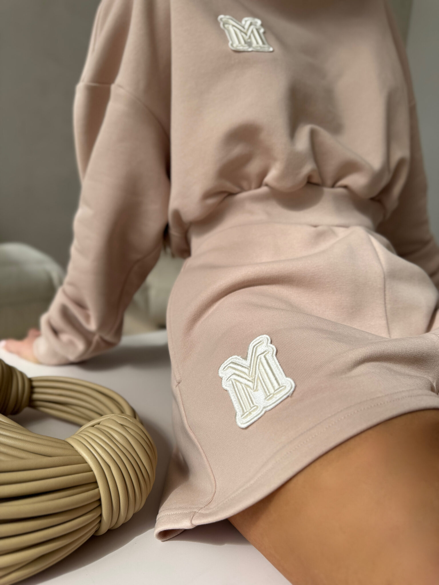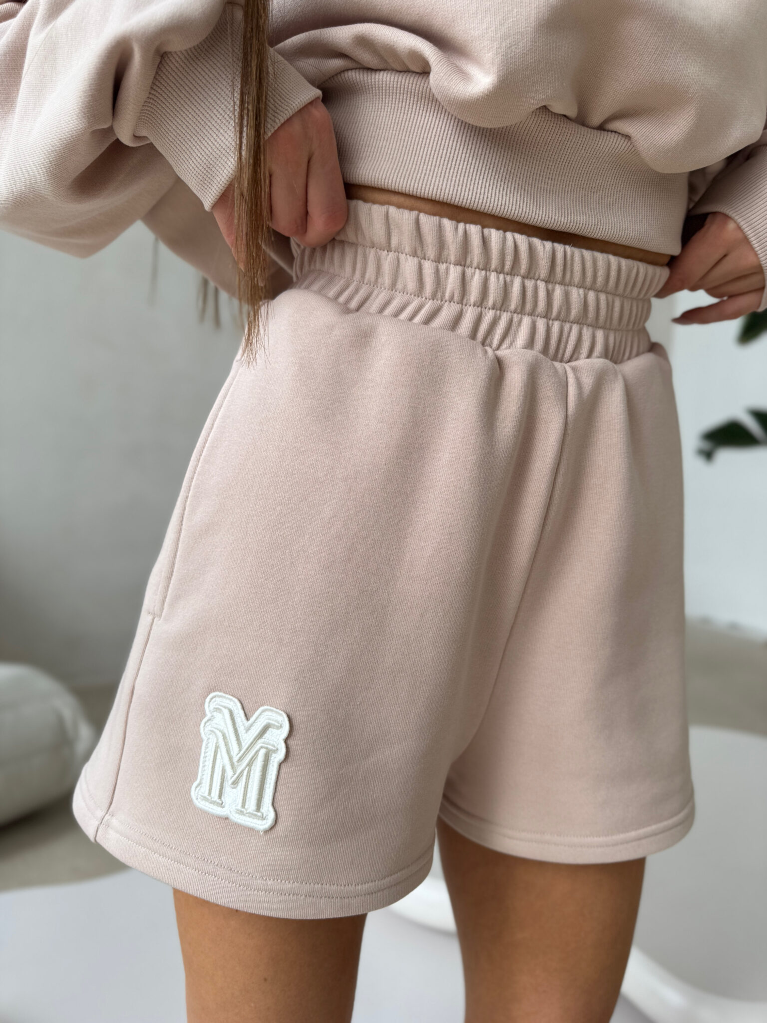 Damskie szorty wykonane z miękkiej i przyjemnej w dotyku dzianiny. Model o luźnym kroju z elastycznym, szerokim pasem, który zapewnia wygodne dopasowanie. Na nogawce znajduje się białe, wypukłe logo marki w formie litery M. Spodenki świetnie sprawdzą się zarówno w codziennych, jak i sportowych stylizacjach. Idealne do noszenia w komplecie z dopasowaną bluzą.