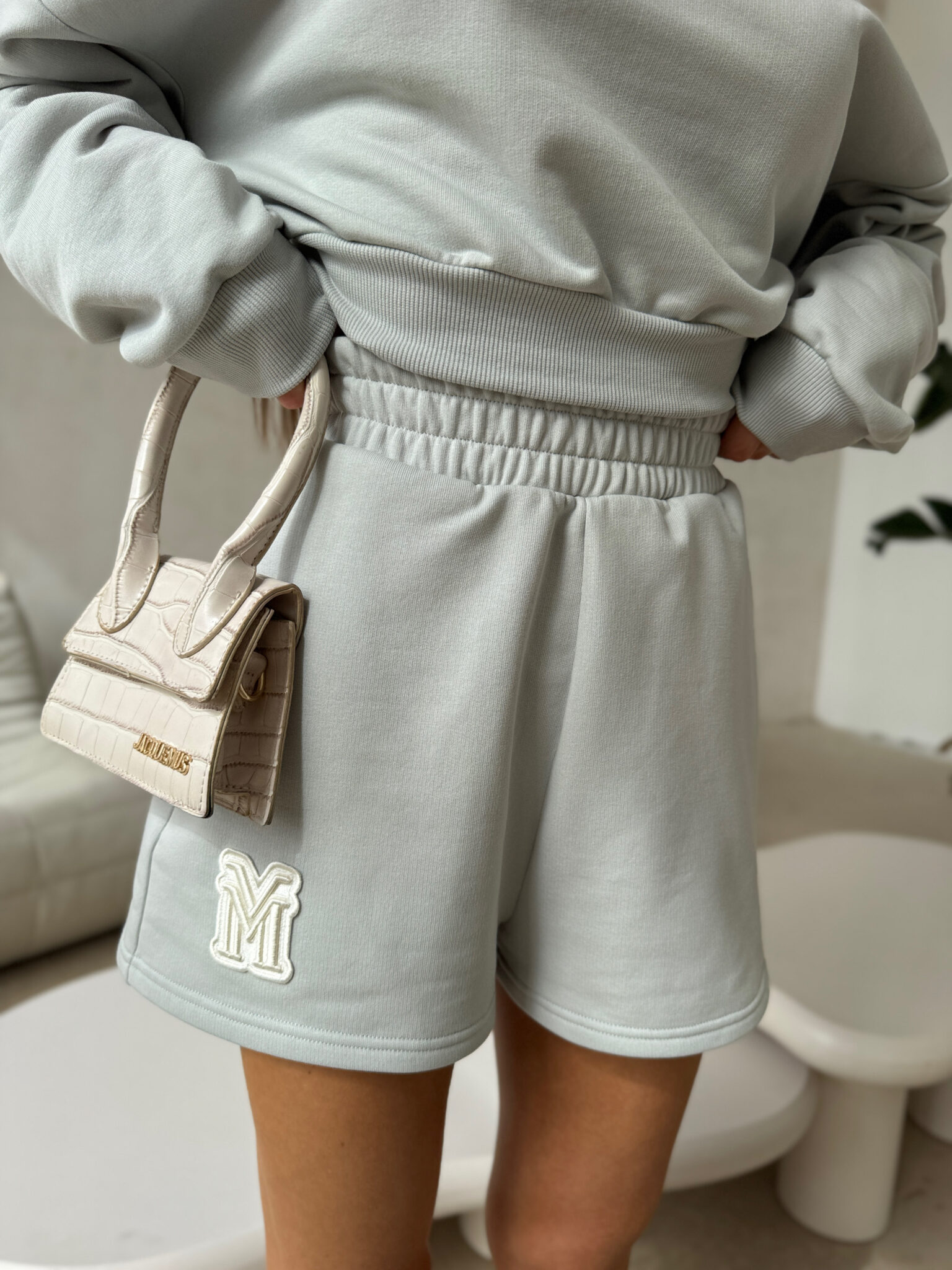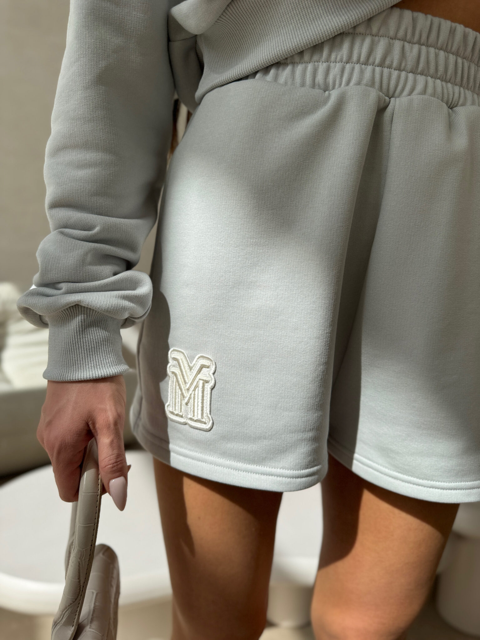 Damskie szorty wykonane z miękkiej i przyjemnej w dotyku dzianiny. Model o luźnym kroju z elastycznym, szerokim pasem, który zapewnia wygodne dopasowanie. Na nogawce znajduje się białe, wypukłe logo marki w formie litery M. Spodenki świetnie sprawdzą się zarówno w codziennych, jak i sportowych stylizacjach. Idealne do noszenia w komplecie z dopasowaną bluzą.