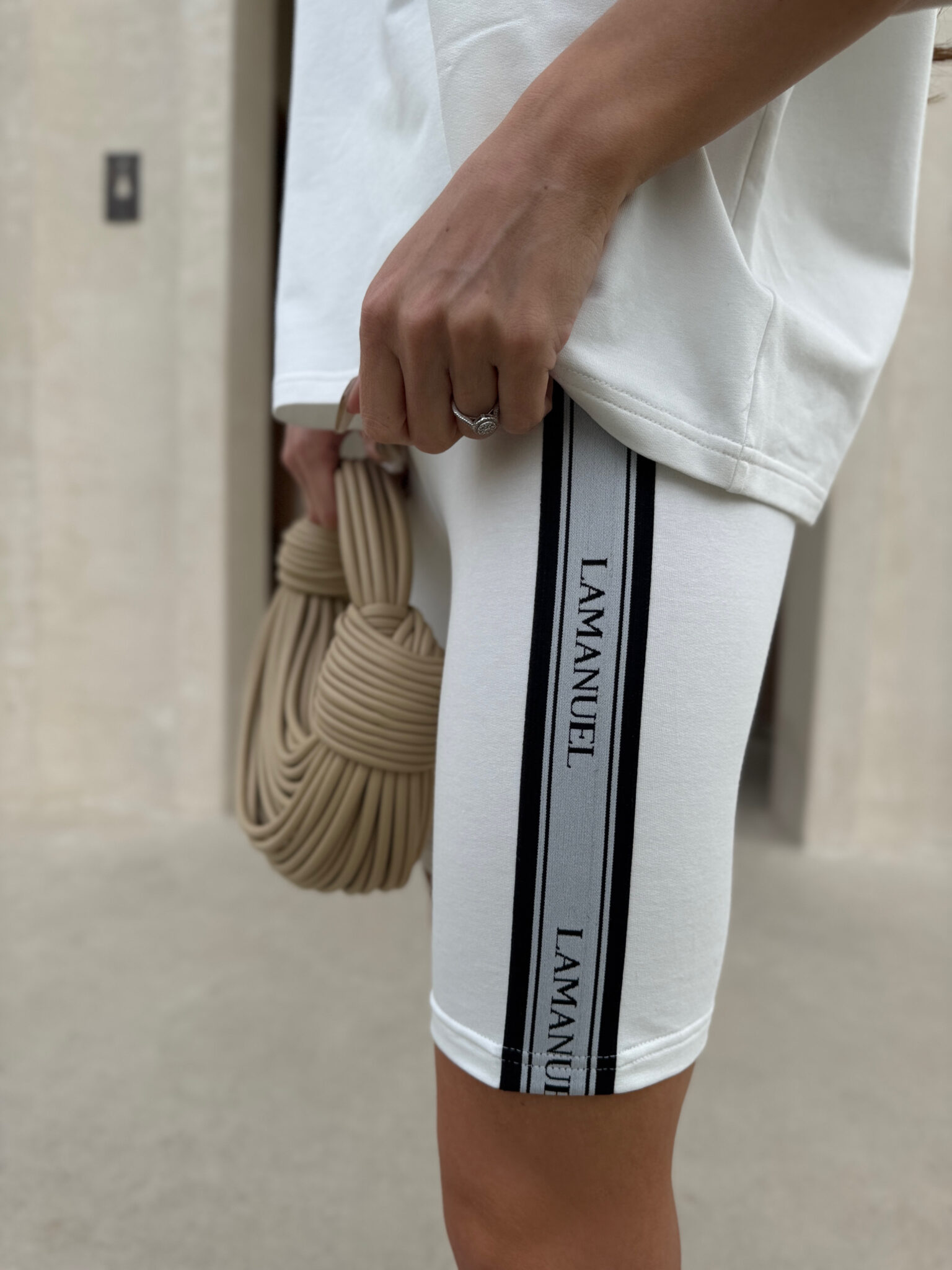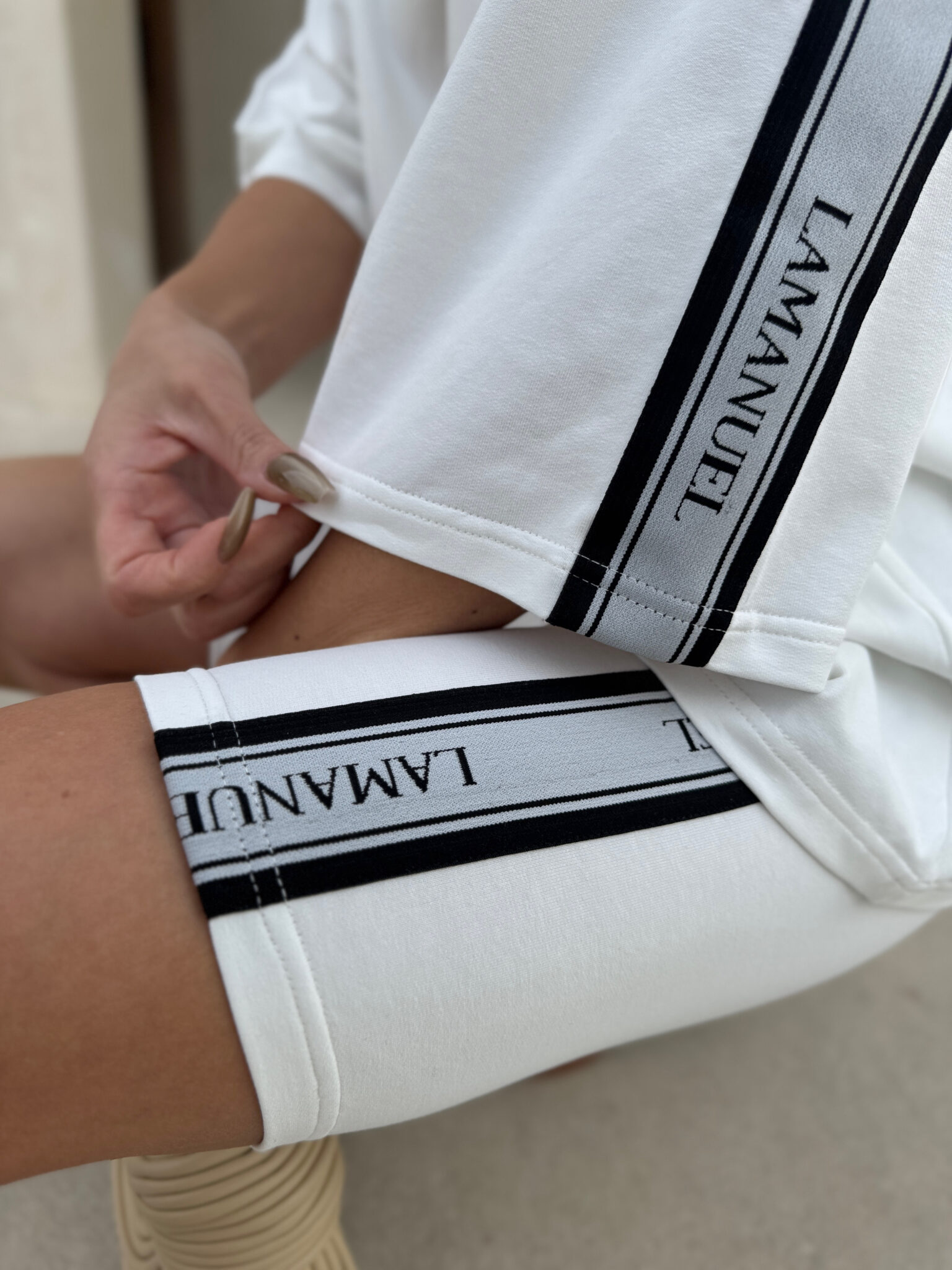 Kolarki z elastycznej, miękkiej bawełny o dopasowanym kroju, idealnie przylegające do sylwetki. Model wyposażony w szeroką, komfortową gumę w pasie, zapewniającą dobre podtrzymanie i wygodę noszenia. Po bokach nogawek wszyto taśmy z logotypem LAMANUEL, które nadają całości sportowego, ale stylowego charakteru. Świetna baza do codziennych i aktywnych stylizacji.