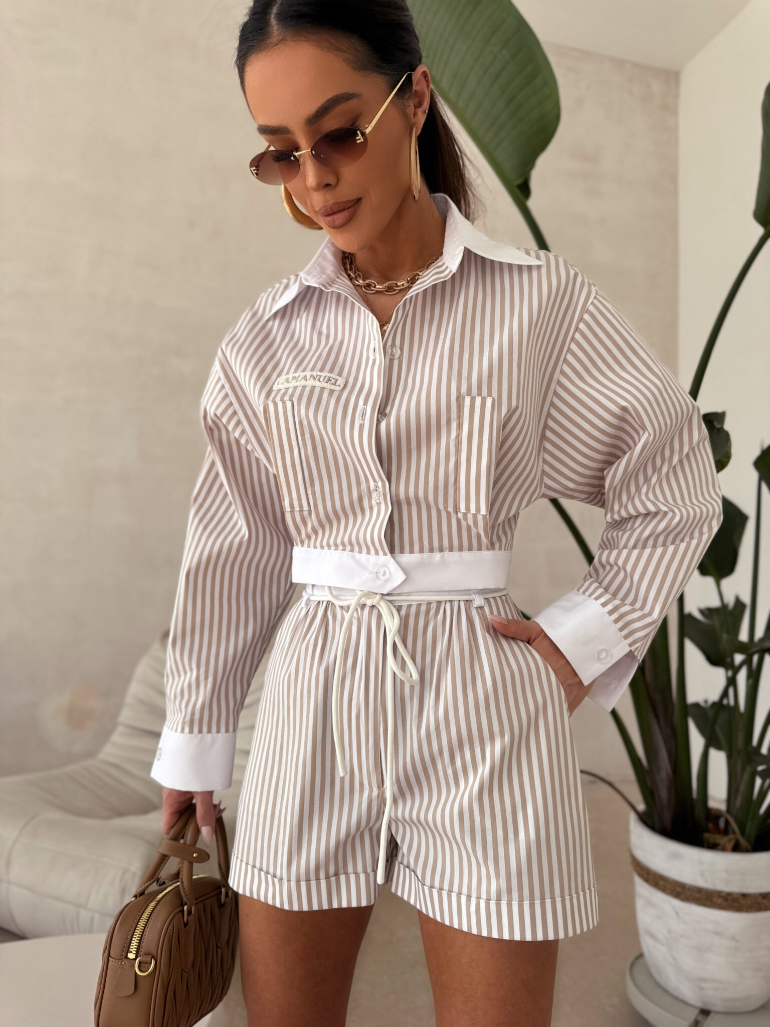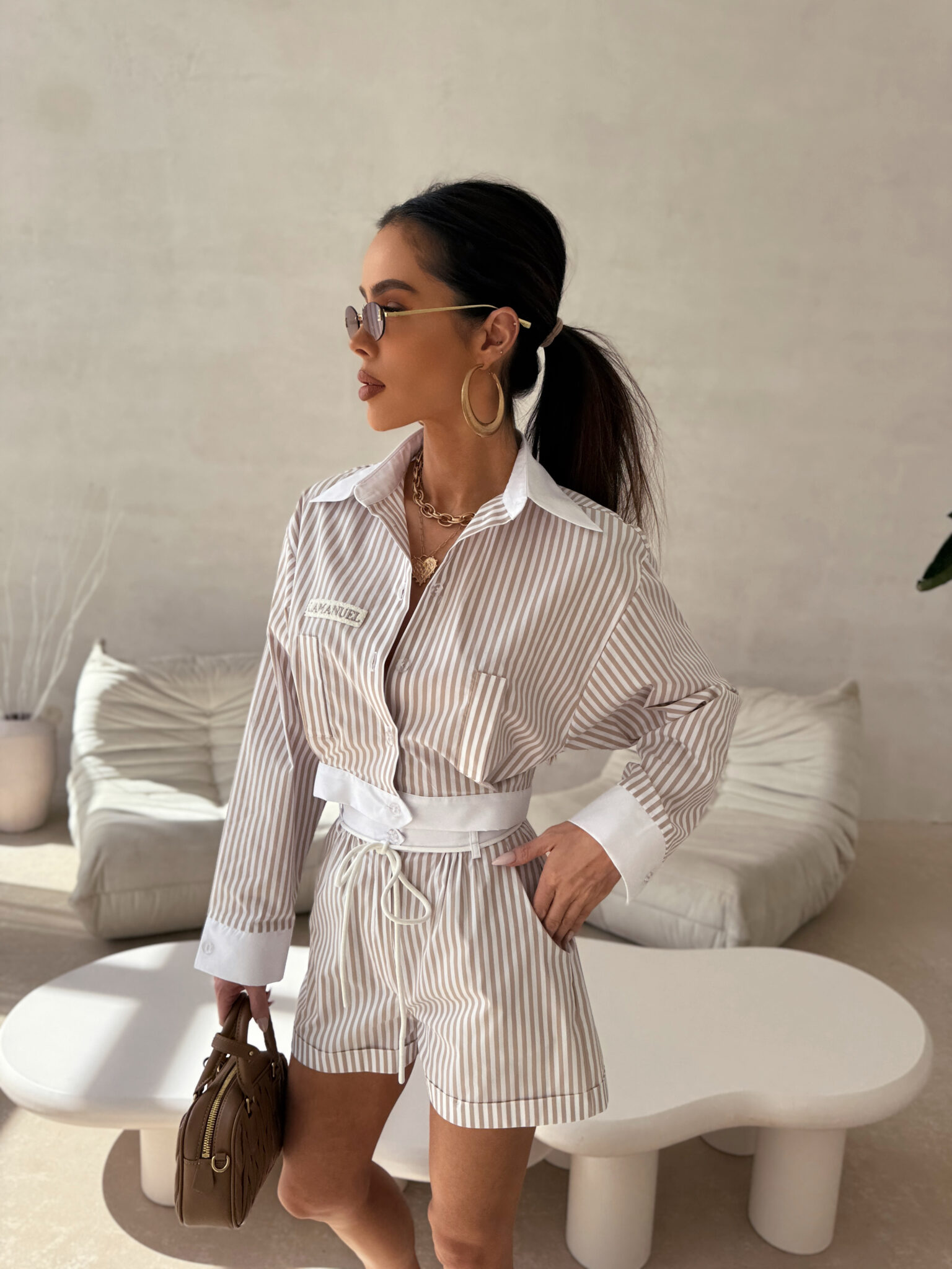 Spodenki wykonane z tej samej tkaniny w paski co koszula YACHT tworzą idealne dopełnienie. Posiadają szeroki, gładki pas z ozdobnym wiązaniem, który podkreśla talię. Nogawki są krótkie, proste, nieopinające, co sprawia, że całość prezentuje się lekko i nowocześnie. Świetnie sprawdzą się zarówno jako element kompletu, jak i w zestawieniu z bardziej casualowymi górami.