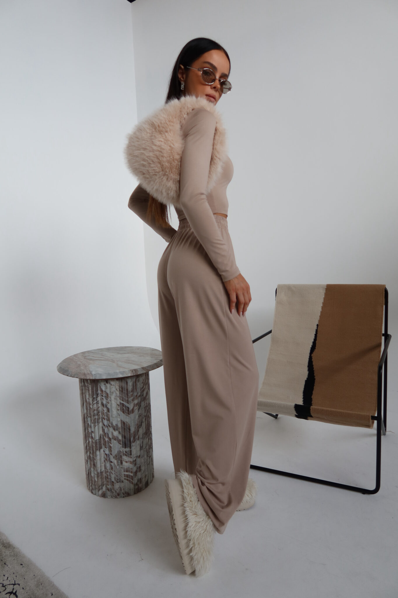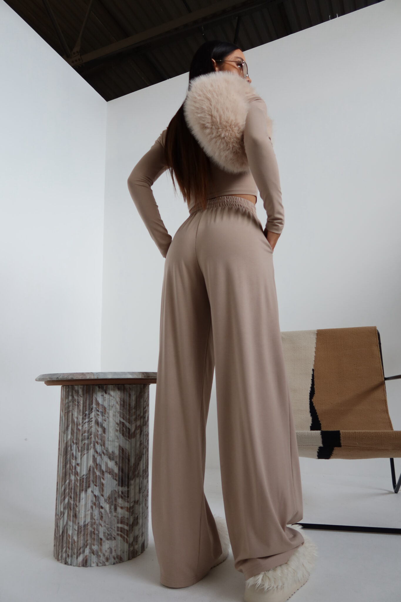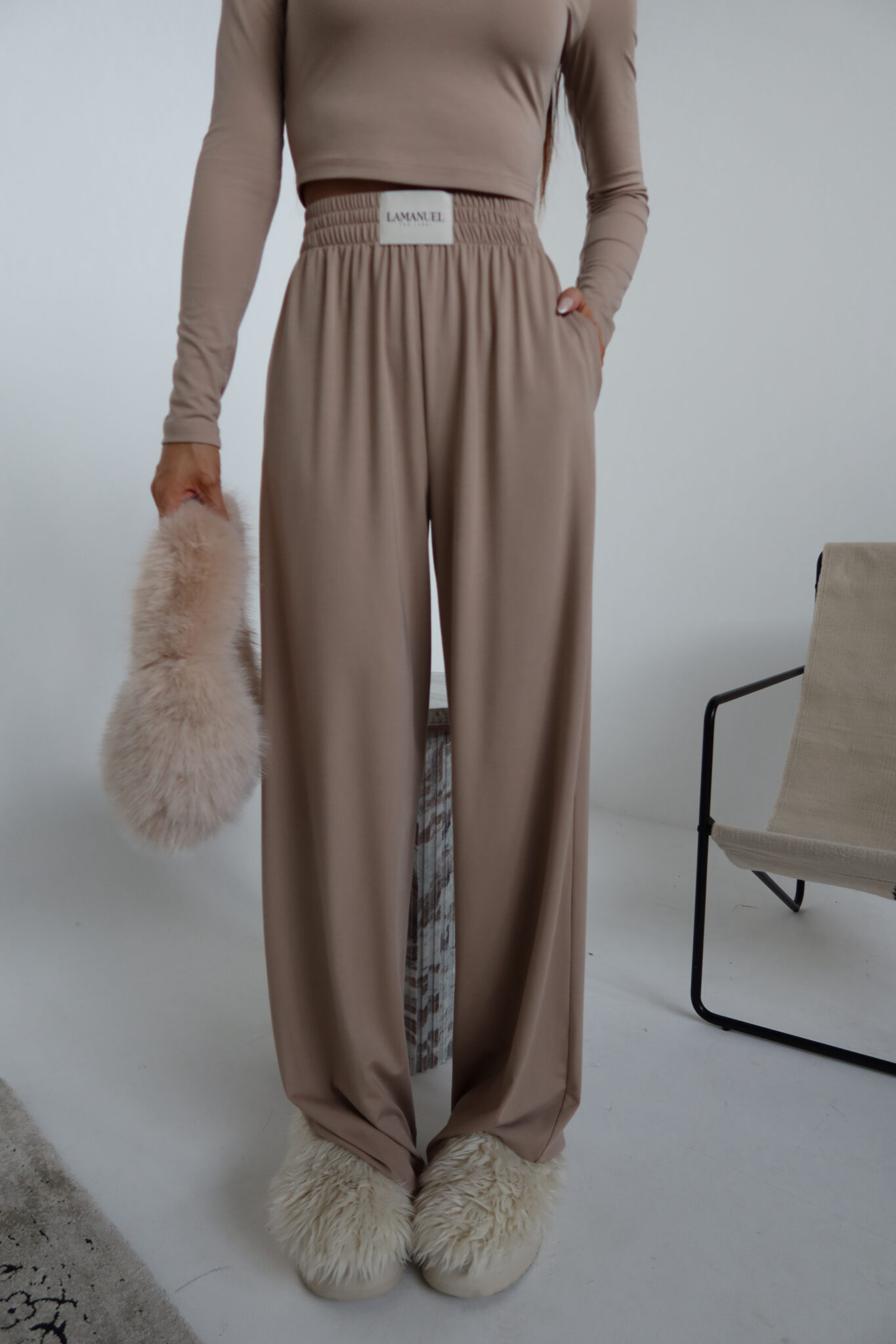 Luźne spodnie z modalu z wysokim, elastycznym stanem wykończonym szeroką gumą i metką z logo. Miękka, lejąca tkanina pięknie układa się na sylwetce i zapewnia pełną swobodę ruchów. Model z kieszeniami. Idealne zarówno do stylizacji domowych, jak i codziennych.