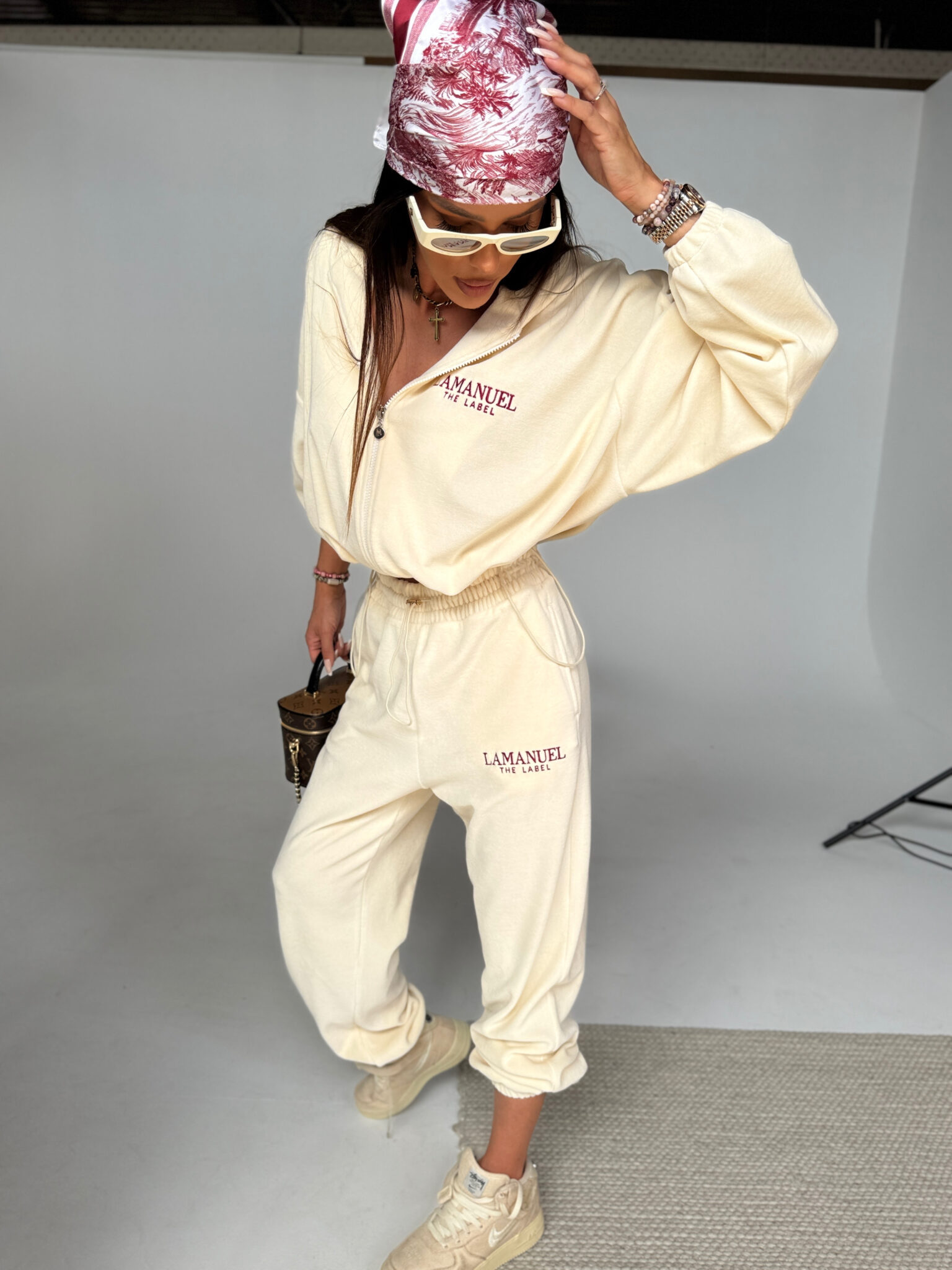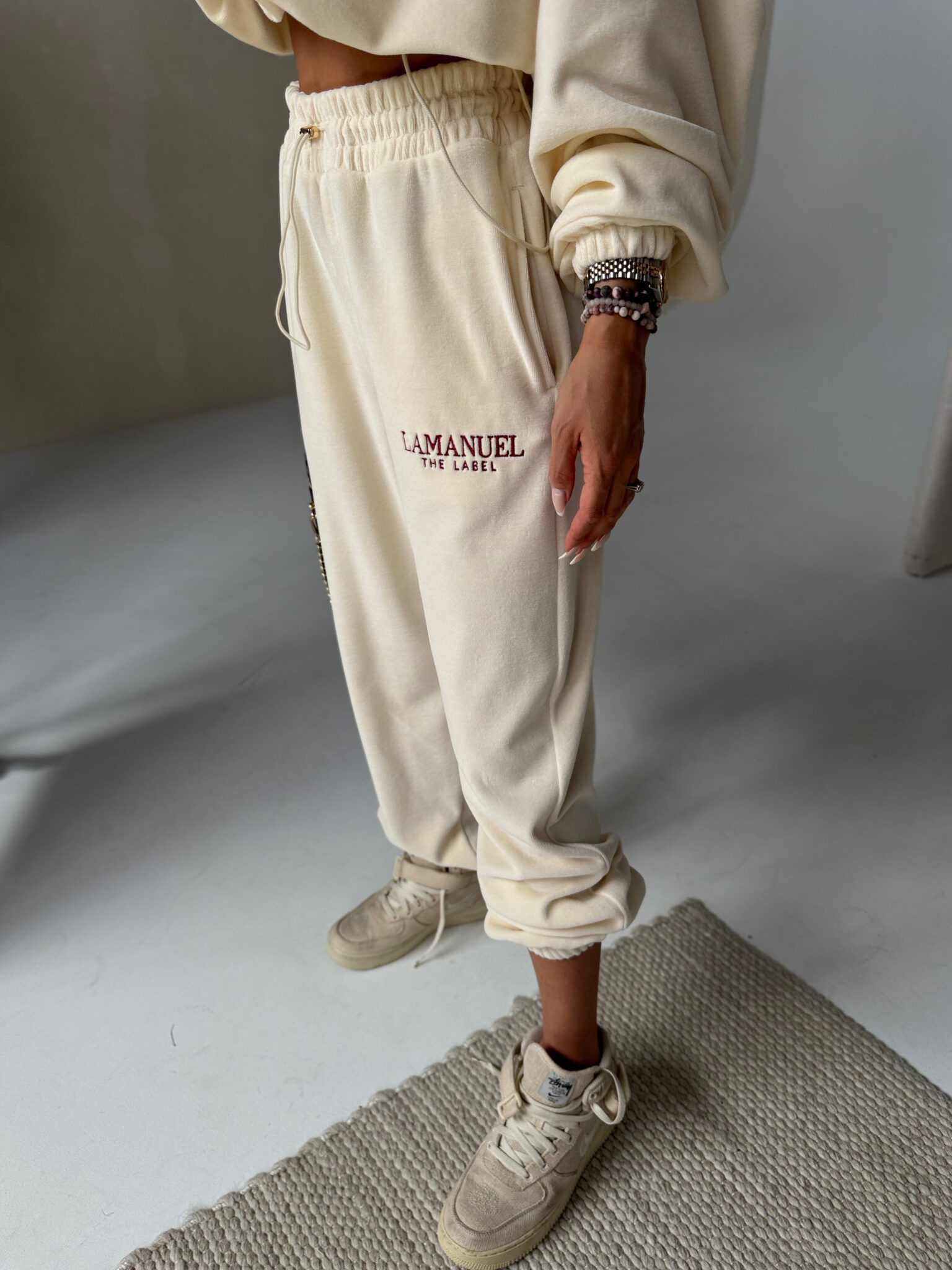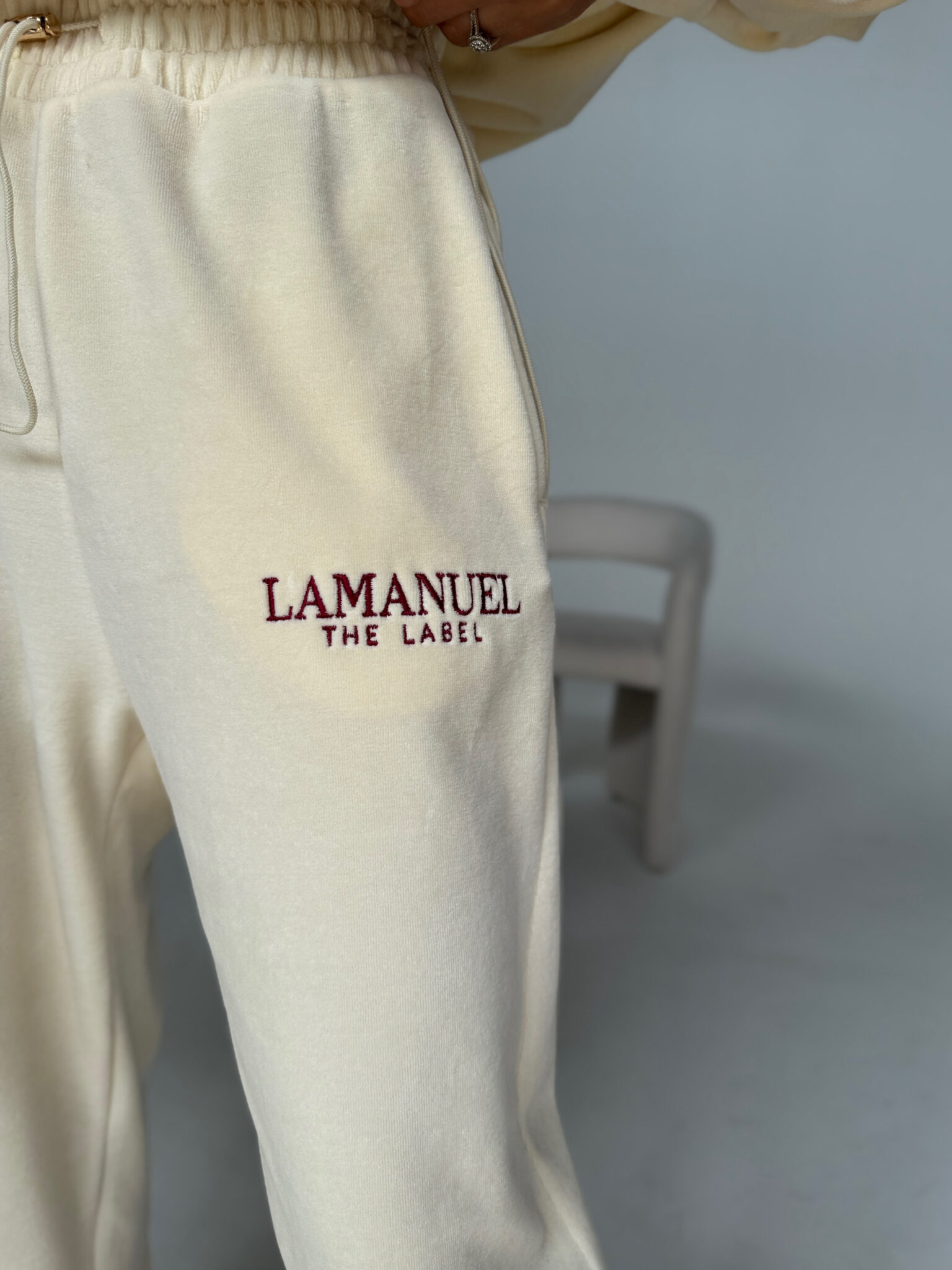 Luźne spodnie dresowe o zwężanym kroju i elastycznym wykończeniu w pasie oraz przy kostkach. Po lewej stronie wyhaftowane logo lamanuel w kontrastowym kolorze. Ściągacz w pasie z troczkami pozwala idealnie dopasować je do sylwetki. Casual, który wcale nie wygląda zwyczajnie. Spodnie mimo, że są szerokie pasują idealnie od rozmiaru XS-L.