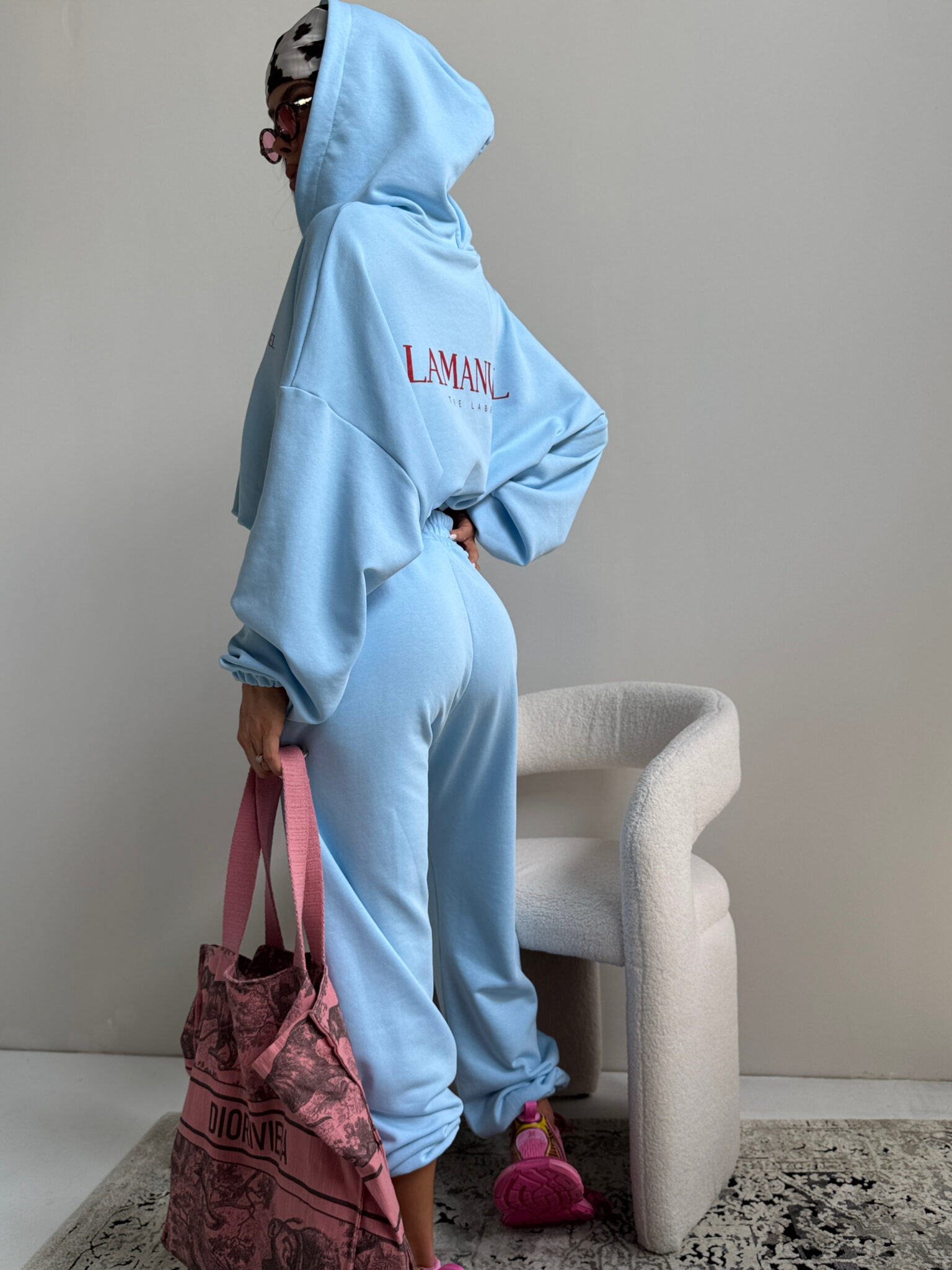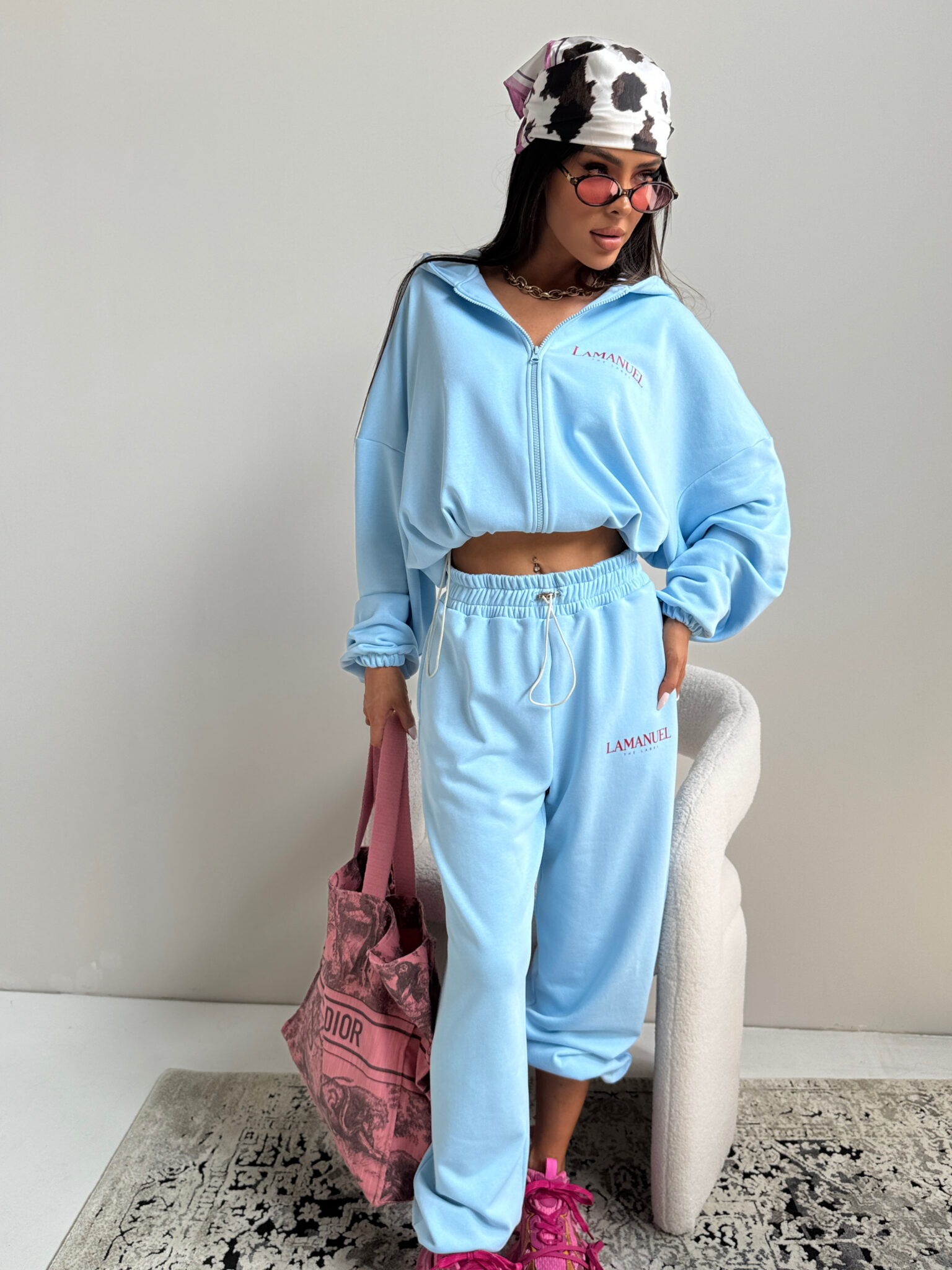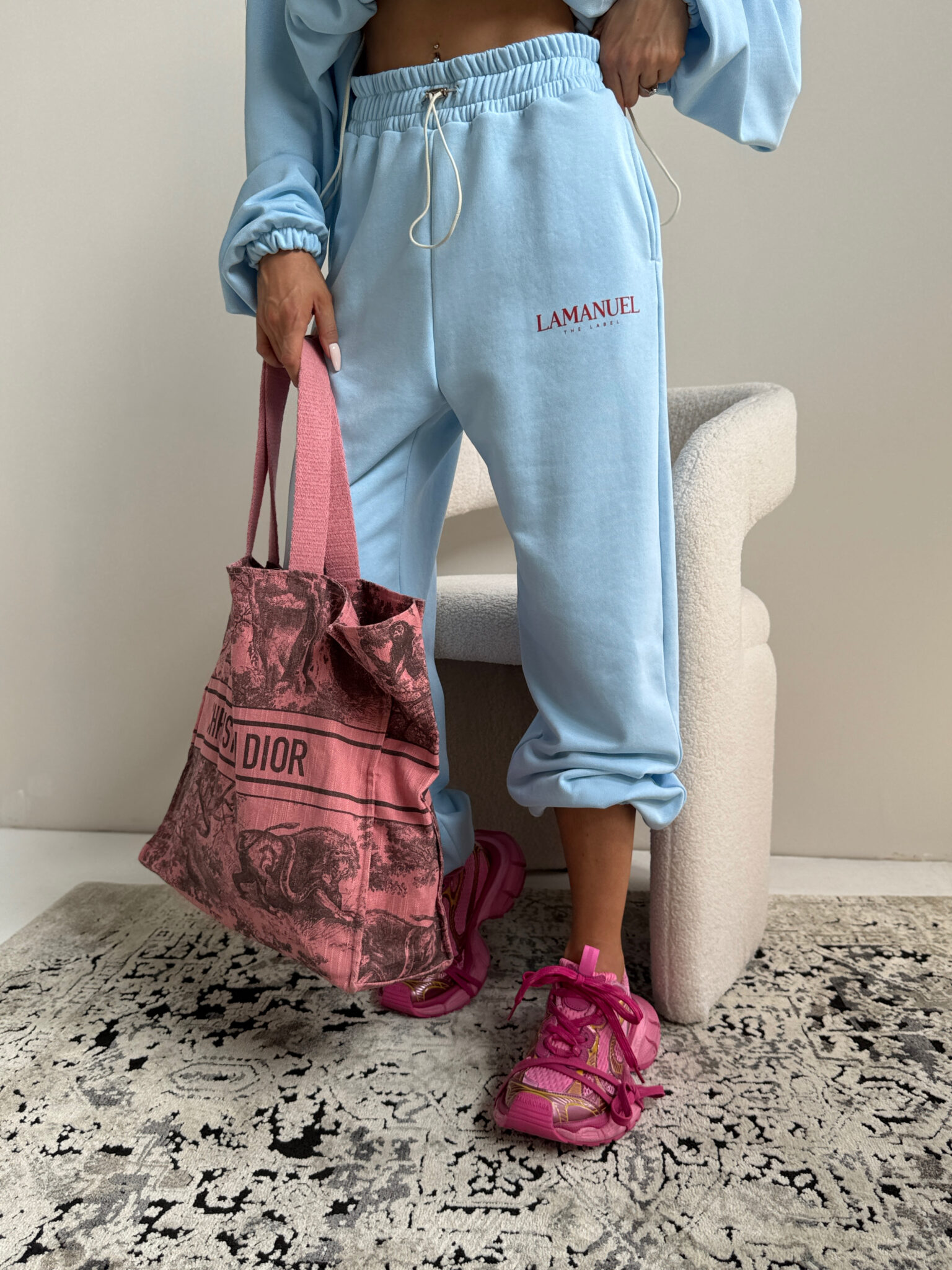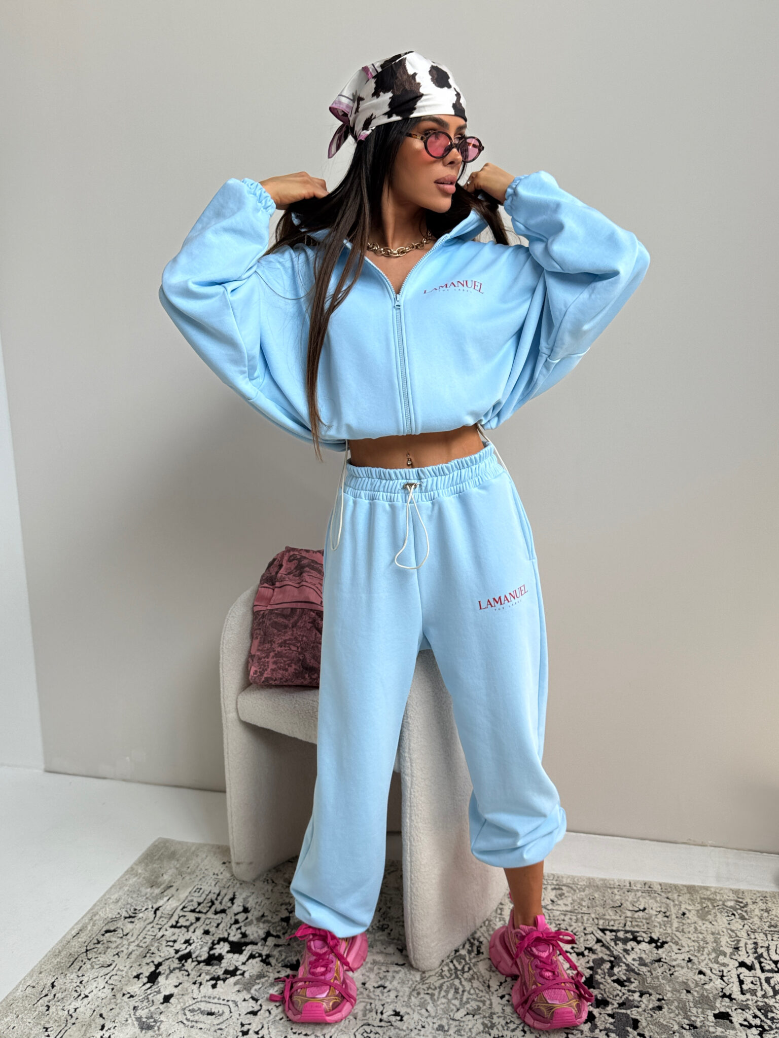 Szerokie spodnie dresowe, stylizowane na męskie z wysokim stanem i elastyczną gumką w pasie oraz dodatkowym troczkiem do regulacji. Szeroka, prosta nogawka i wygodny krój zapewniają komfort noszenia i swobodę ruchów. Na biodrze widoczne logo LAMANUEL, które spójnie komponuje się z bluza CLOUDY. tworząc kompletny, modny zestaw. Spodnie mimo, że są szerokie pasują idealnie od rozmiaru XS-L.