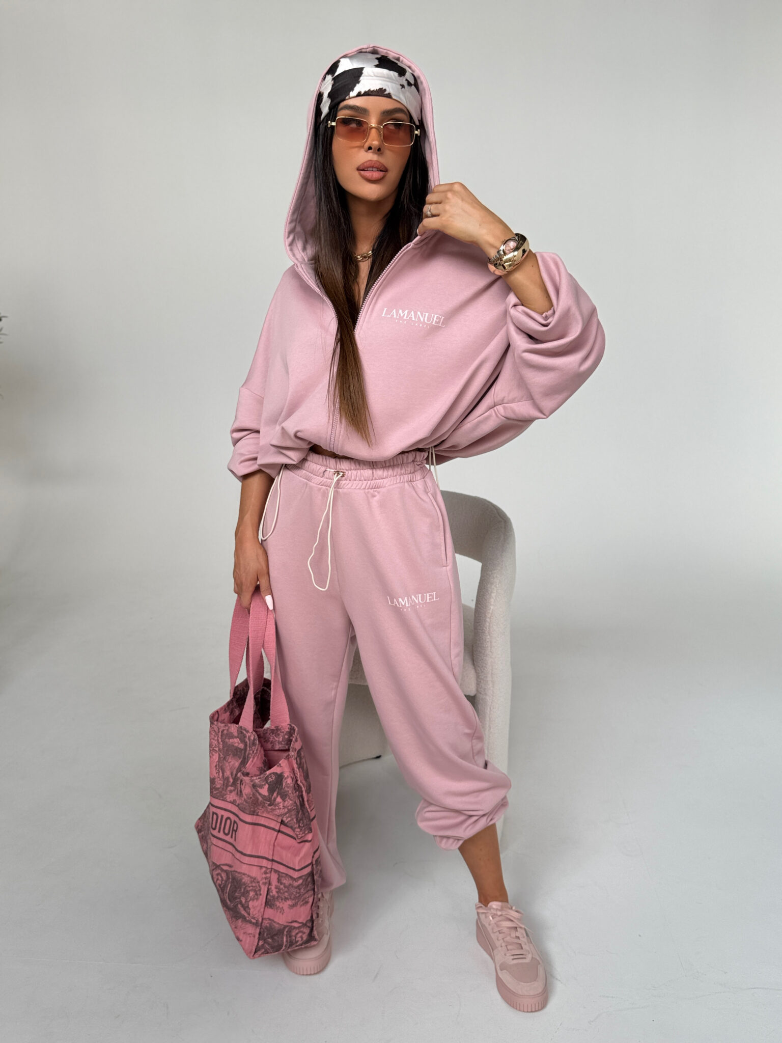 Szerokie spodnie dresowe, stylizowane na męskie z wysokim stanem i elastyczną gumką w pasie oraz dodatkowym troczkiem do regulacji. Szeroka, prosta nogawka i wygodny krój zapewniają komfort noszenia i swobodę ruchów. Na biodrze widoczne logo LAMANUEL, które spójnie komponuje się z bluza CLOUDY. tworząc kompletny, modny zestaw. Spodnie mimo, że są szerokie pasują idealnie od rozmiaru XS-L.