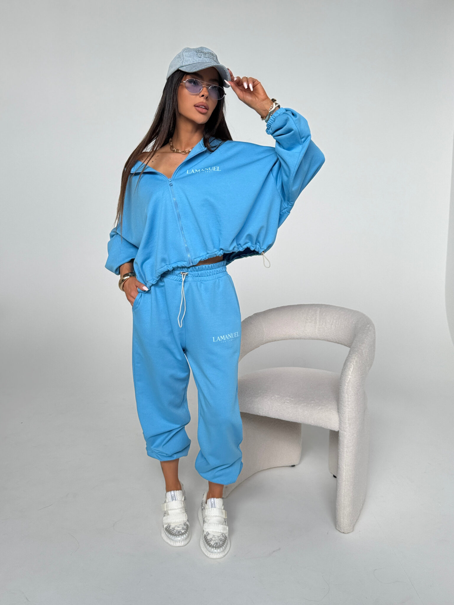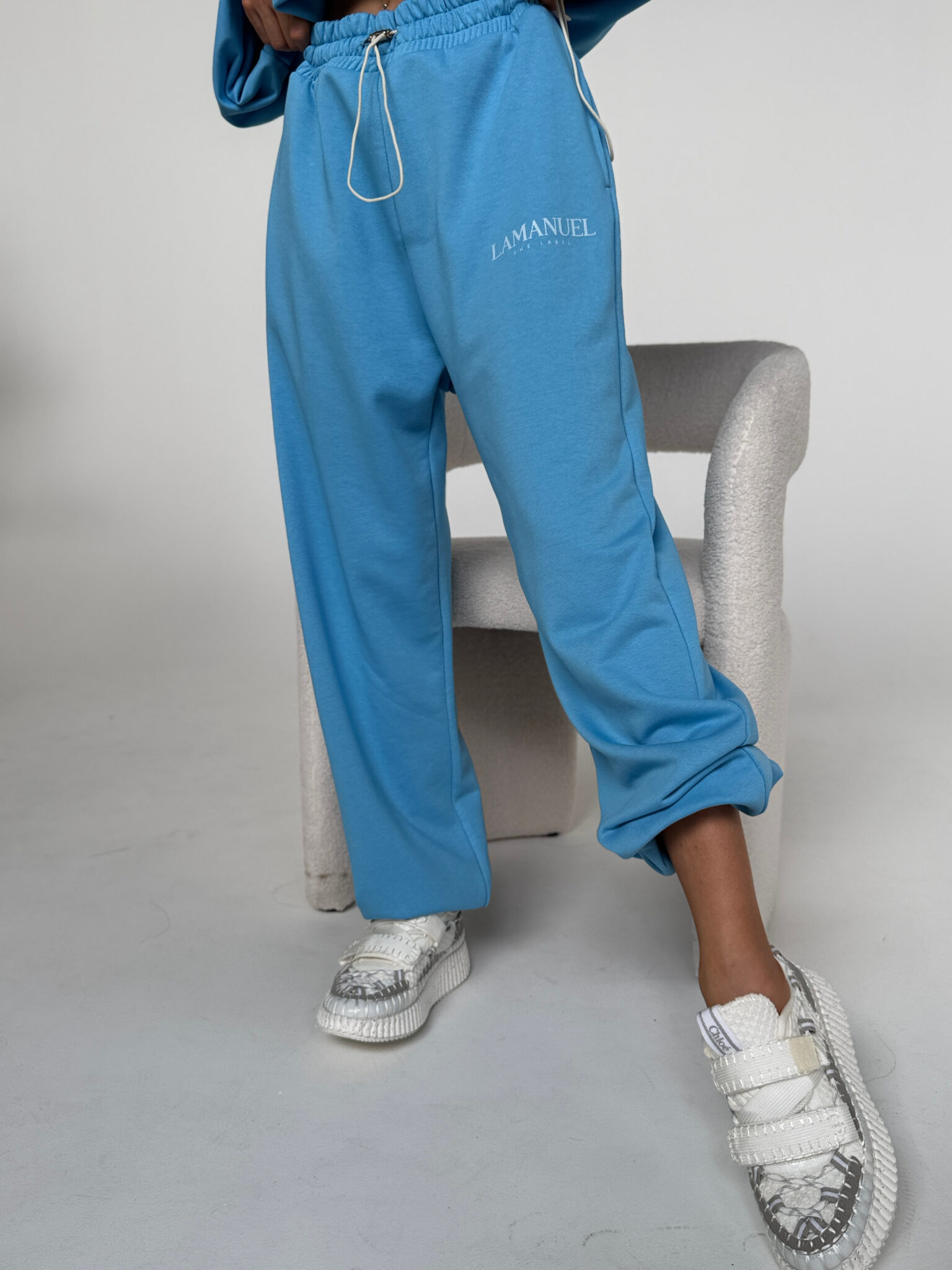 Szerokie spodnie dresowe, stylizowane na męskie z wysokim stanem i elastyczną gumką w pasie oraz dodatkowym troczkiem do regulacji. Szeroka, prosta nogawka i wygodny krój zapewniają komfort noszenia i swobodę ruchów. Na biodrze widoczne logo LAMANUEL, które spójnie komponuje się z bluza CLOUDY. tworząc kompletny, modny zestaw. Spodnie mimo, że są szerokie pasują idealnie od rozmiaru XS-L.