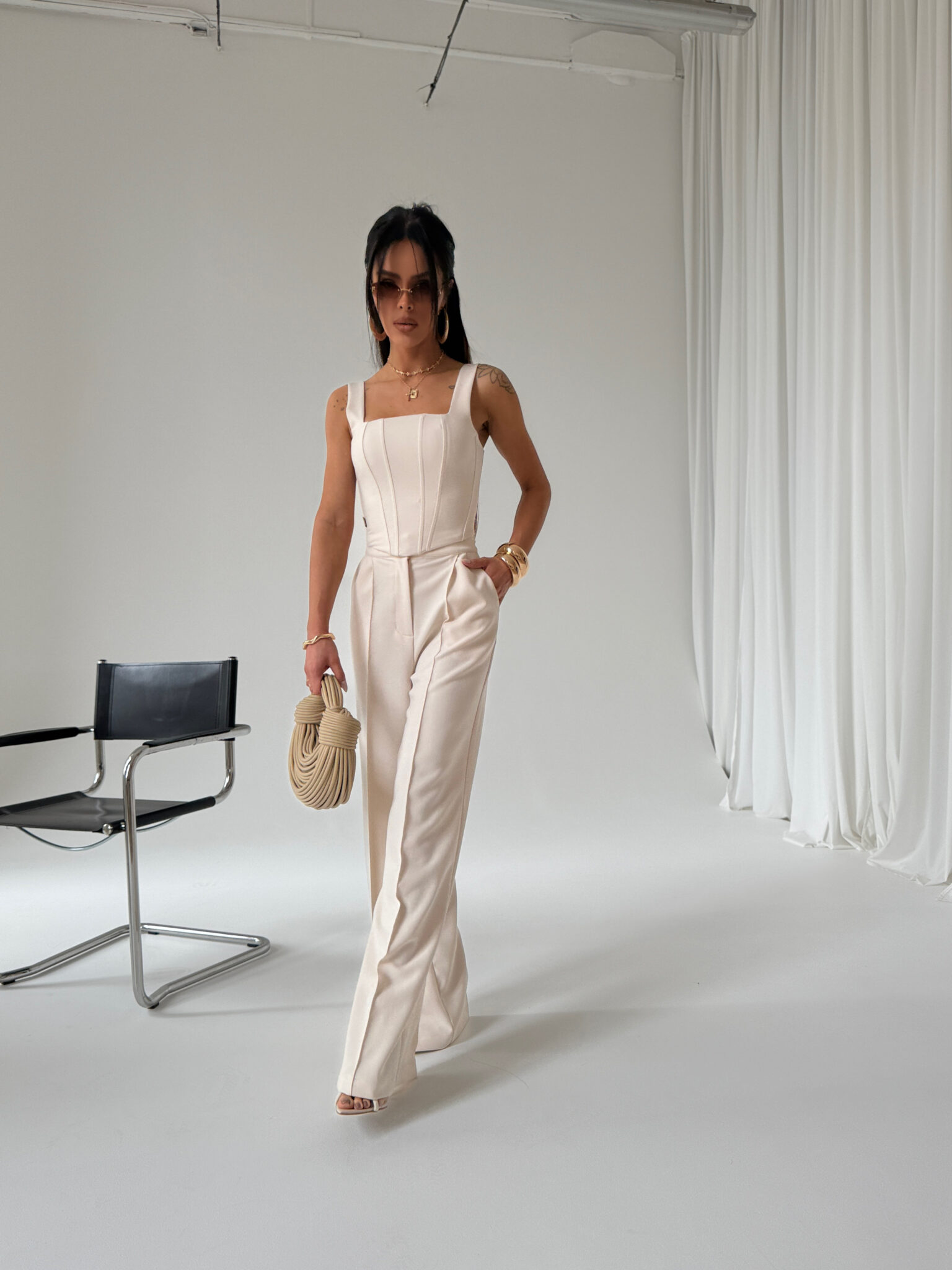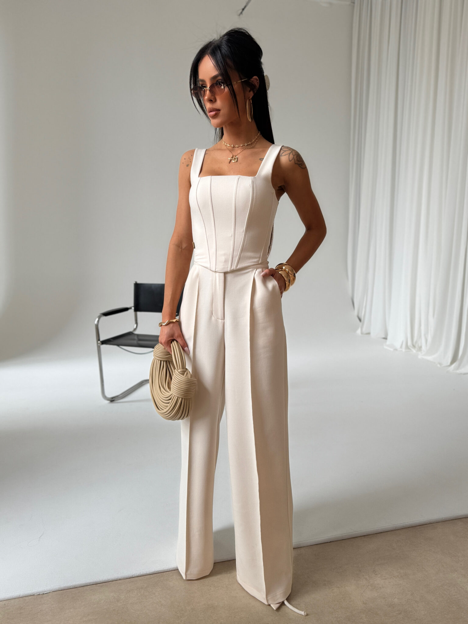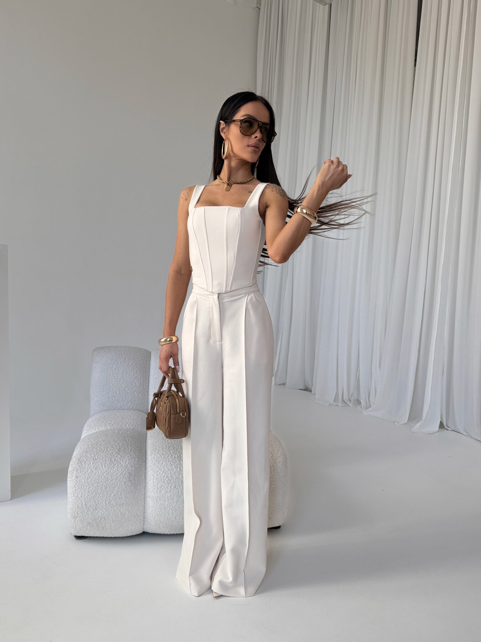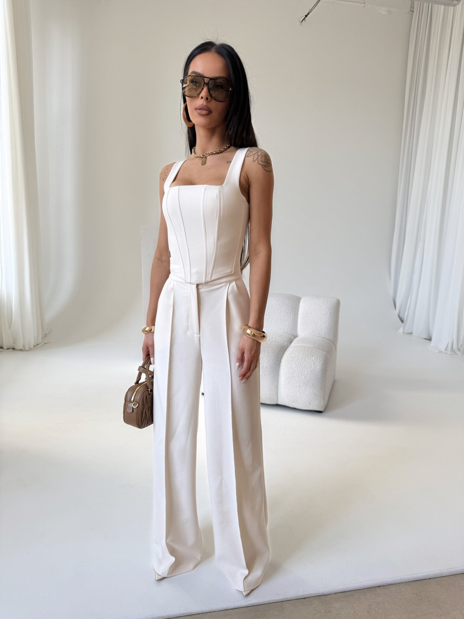 Spodnie o szerokim kroju z wysokim stanem, zapinane na suwak z boku. Wykonane z eleganckiej tkaniny o subtelnej fakturze, która nadaje im strukturalny wygląd. Model z kantem optycznie wydłużającym nogi i delikatnymi zakładkami w talii podkreślającymi sylwetkę. Doskonale sprawdzą się zarówno w klasycznych, jak i nowoczesnych stylizacjach, łącząc komfort z ponadczasową elegancją. Połącz je z naszym gorsetem DYNASTY!