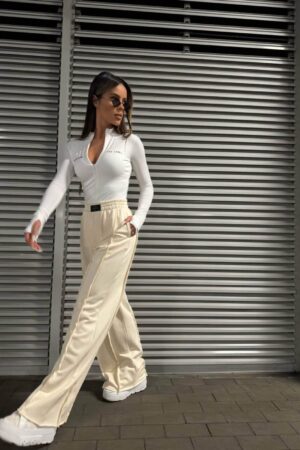Spodnie dresowe , wykonany z miękkiej, oddychającej tkaniny, idealne do codziennego użytku. Model o luźnej, szerokiej nogawce, dekoracyjne przeszycia w formie zakładek wzdłuż bocznych szwów tworzą efekt subtelnego lampasa. To detal, który optycznie wydłuża sylwetkę i dodaje spodniom przestrzenności. Model wyposażono w wygodne kieszenie Głęboki odcień limonki nadaje całości eleganckiego tonu. Produkt premium .