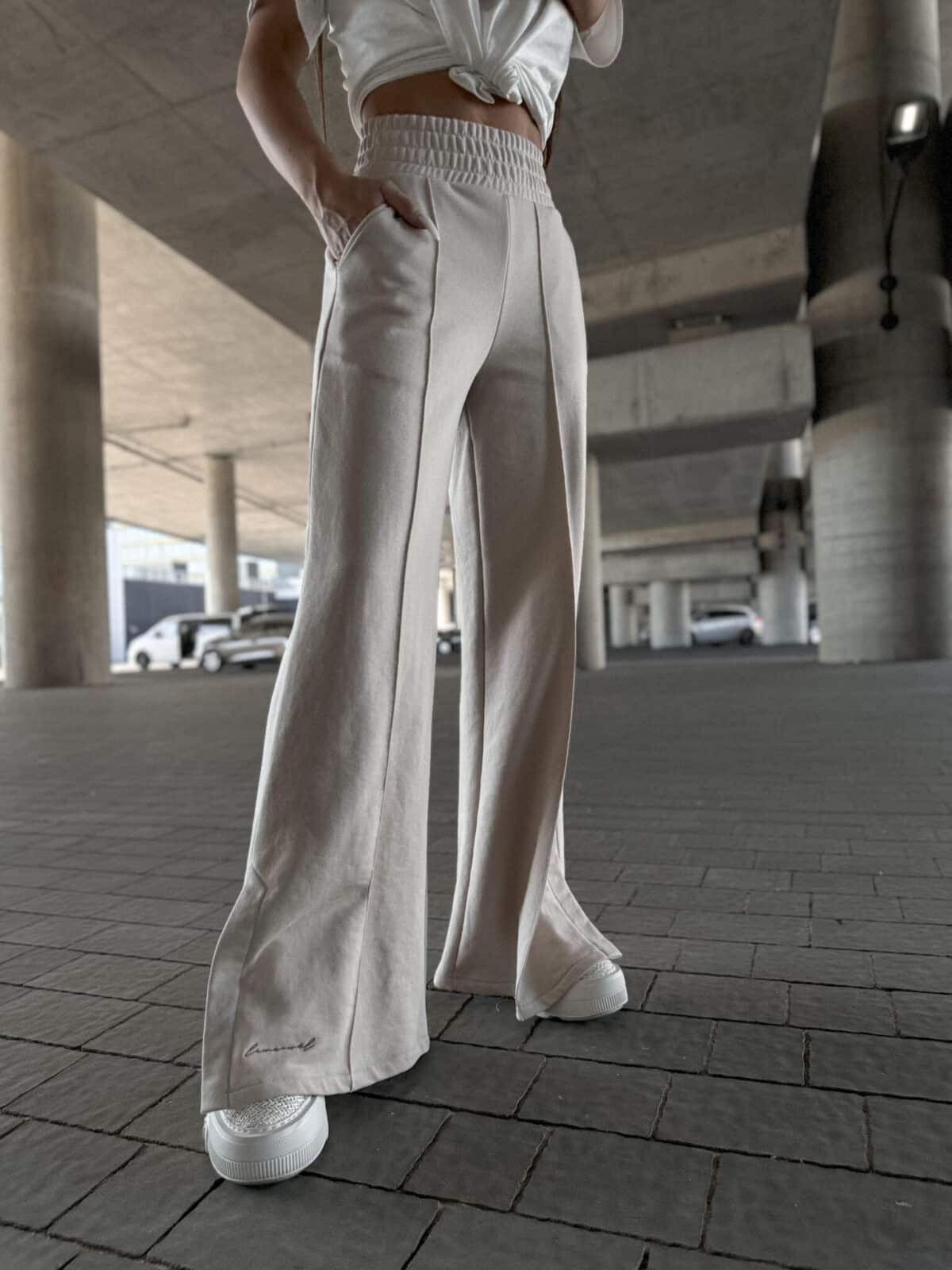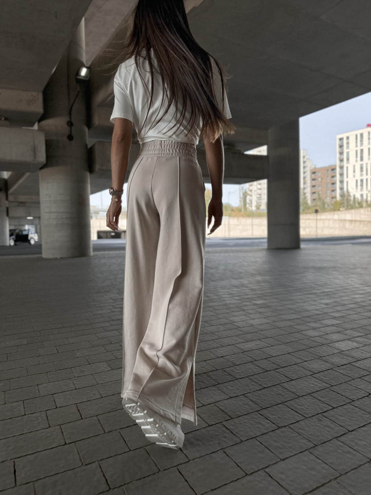 Spodnie dresowe damskie z rozszerzonymi nogawkami z ciekawymi przeszyciami oraz rocięciem na dole, wykonane z wysokiej jakości miękkiego materiału. Zapewniają komfort i swobodę ruchów. Spodnie z elastycznym pasem i praktycznymi kieszeniami. Made in Poland .