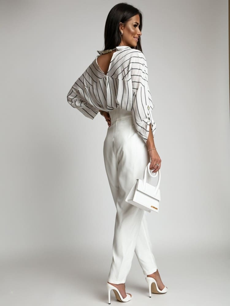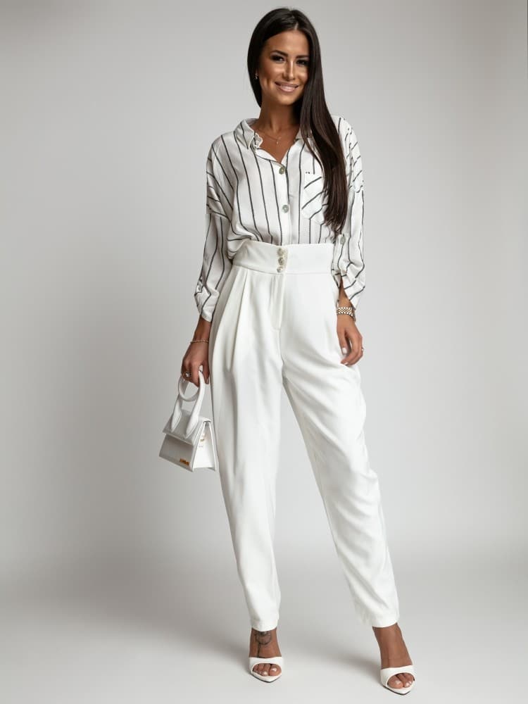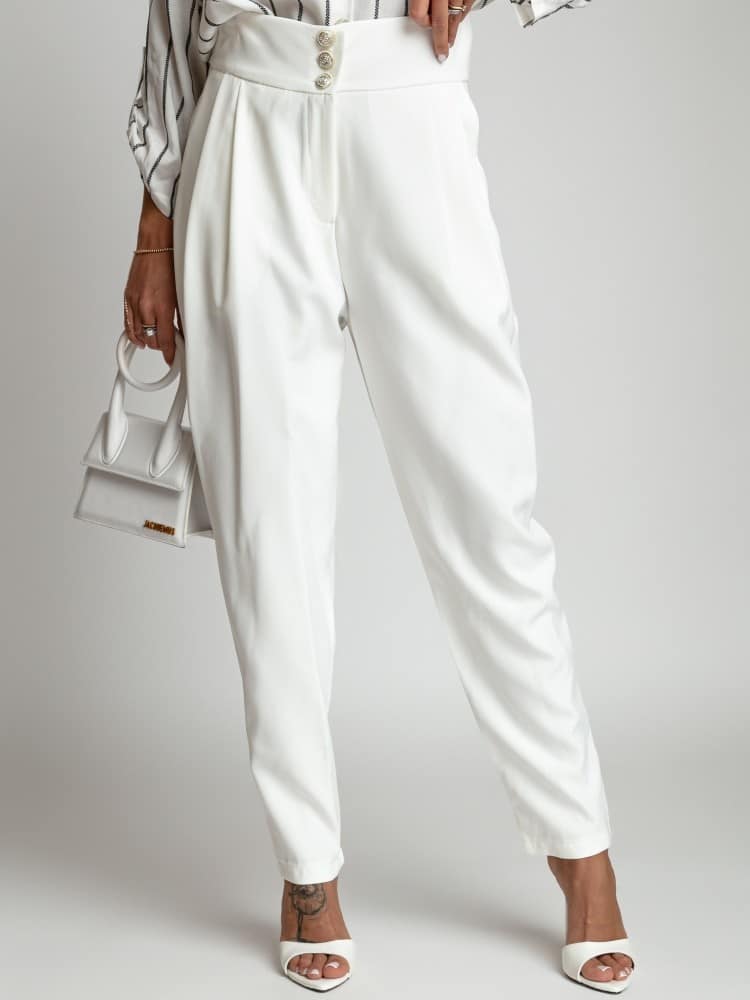 Genialne spodnie Manko, wykonane z wysokiej jakości materiału. Szyku dodaje wysoki, zwężany stan, który optycznie wyszczupla sylwetkę. Po bokach znajdują się pojemne kieszenie. Dodatkowym atutem są ozdobne, złote guziki. Made in Poland.