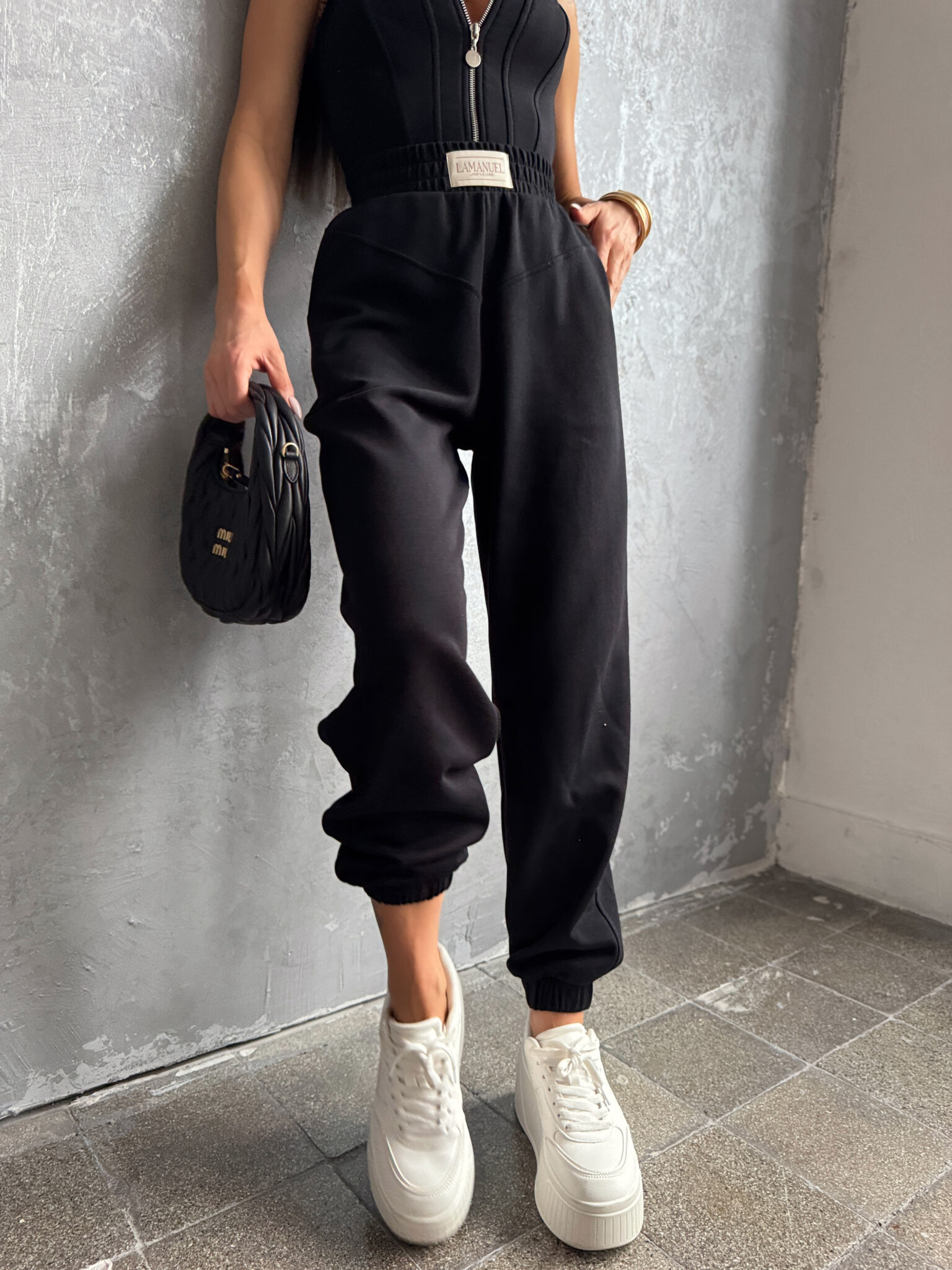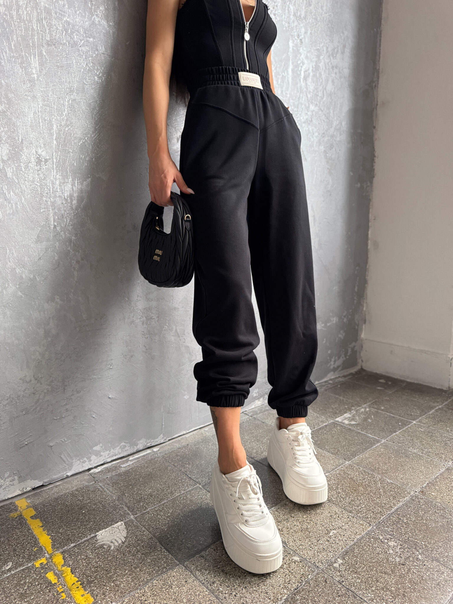 Damskie spodnie dresowe o luźnym fasonie, wykonane z miękkiej dzianiny. Wysoki stan z elastycznym pasem ozdobionym naszywką z logo LAMANUEL zapewnia wygodne dopasowanie i podkreśla talię. Model posiada charakterystyczne przeszycia w okolicy bioder oraz zwężane nogawki zakończone ściągaczami. Spodnie idealnie komponują się z gorsetem lub krótkim topem, tworząc nowoczesną, casualową stylizację.