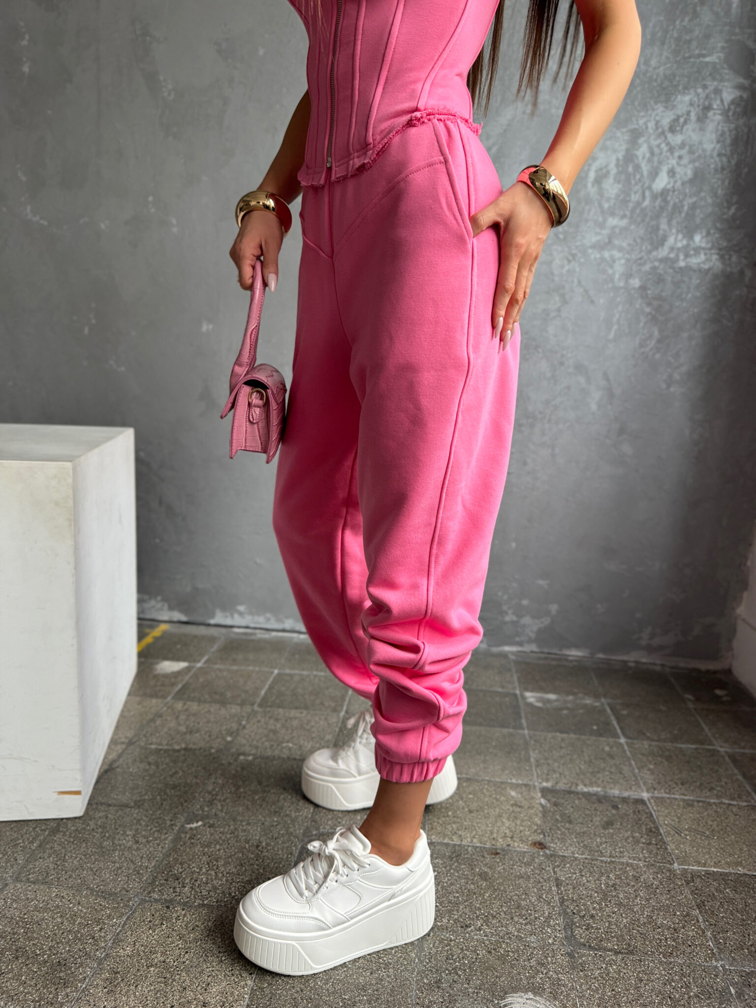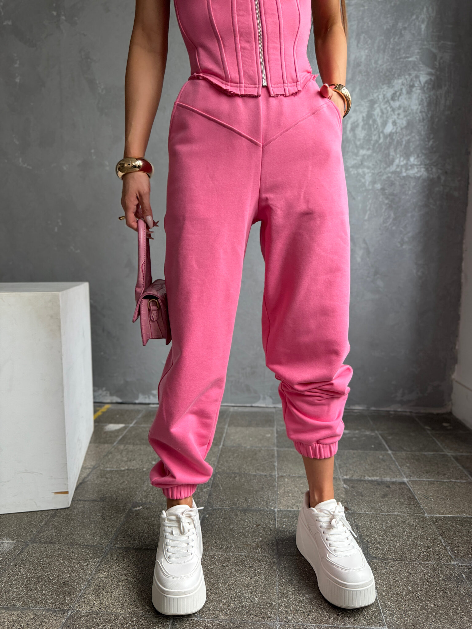 Damskie spodnie dresowe o luźnym fasonie, wykonane z miękkiej dzianiny. Wysoki stan z elastycznym pasem ozdobionym naszywką z logo LAMANUEL zapewnia wygodne dopasowanie i podkreśla talię. Model posiada charakterystyczne przeszycia w okolicy bioder oraz zwężane nogawki zakończone ściągaczami. Spodnie idealnie komponują się z gorsetem lub krótkim topem, tworząc nowoczesną, casualową stylizację.