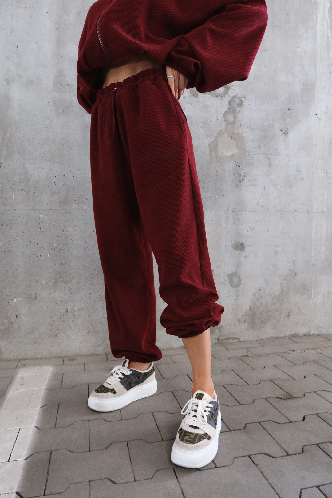 Luźne, welurowe spodnie dresowe o prostym kroju i elastycznej talii ze sznurkiem do regulacji. Prążkowana struktura materiału nadaje im nieoczywistego wyrazu, a haftowane logo przy kieszeni dodaje jakościowego akcentu. Komfortowe, a jednocześnie stylowe – idealne na co dzień i do zestawów z bluzą.