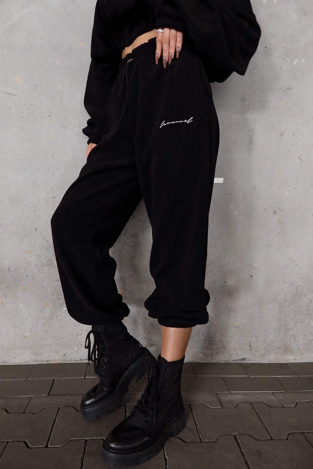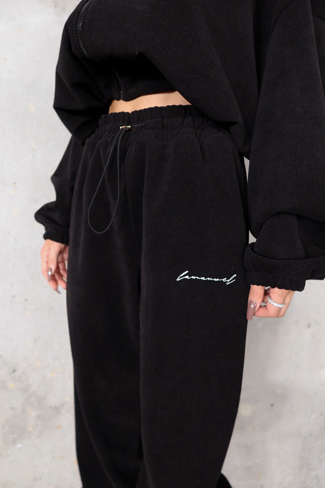Luźne, welurowe spodnie dresowe o prostym kroju i elastycznej talii ze sznurkiem do regulacji. Prążkowana struktura materiału nadaje im nieoczywistego wyrazu, a haftowane logo przy kieszeni dodaje jakościowego akcentu. Komfortowe, a jednocześnie stylowe – idealne na co dzień i do zestawów z bluzą.