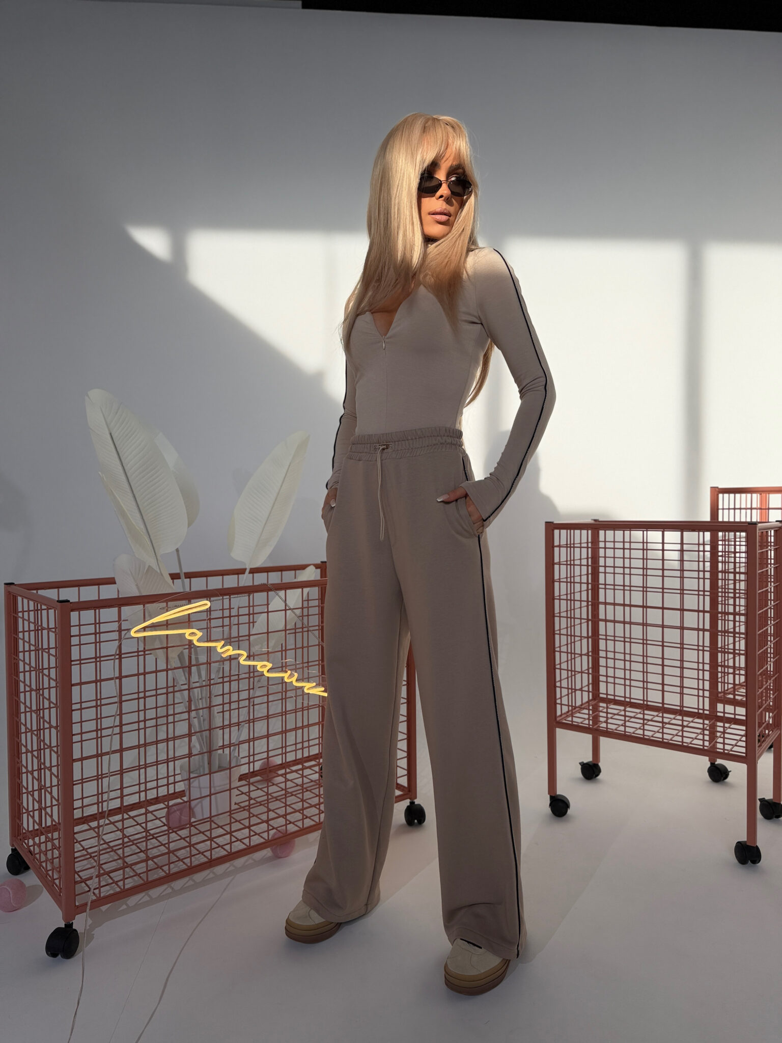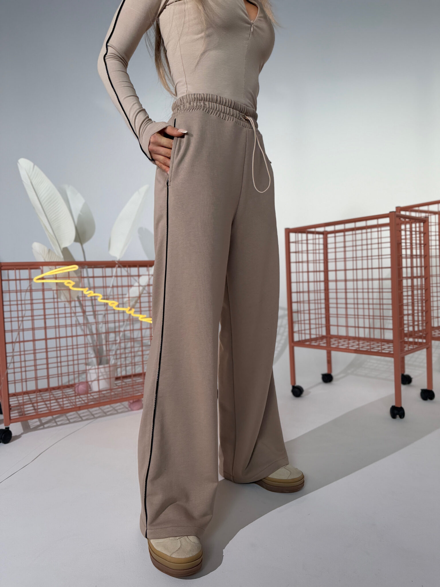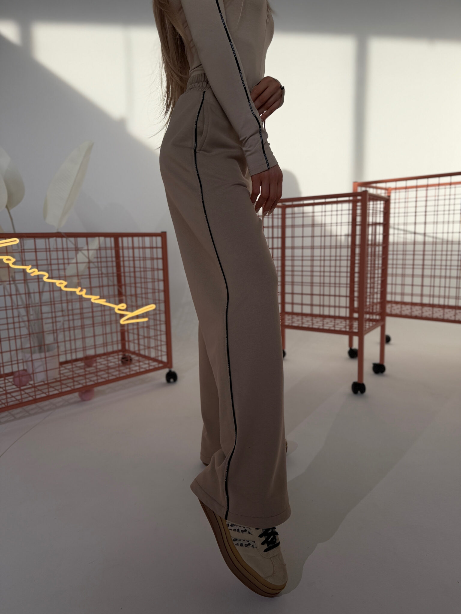 Model oparty na szerokiej, prostej nogawce z wydłużoną linią. Dzianina pętelkowa – miękka, ale stabilna. W pasie elastyczna guma i sznurek do regulacji. Boczna taśma z powtarzalnym logo w odcieniu bazowym. Wykończenie bez ściągaczy. Forma inspirowana sylwetką garniturową, przeniesiona na codzienny materiał. Spodnie, które można nosić jak dres, ale wyglądają jak przemyślany element stylizacji.