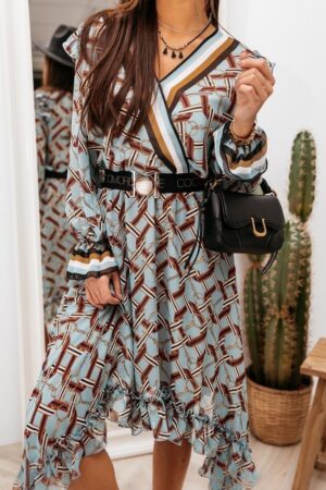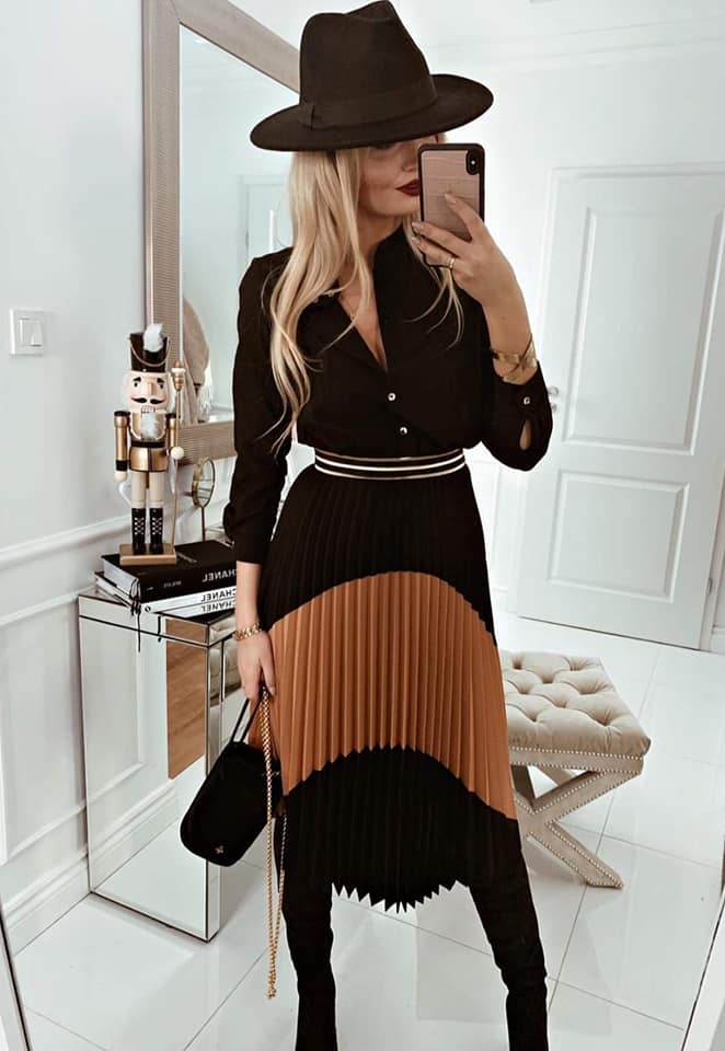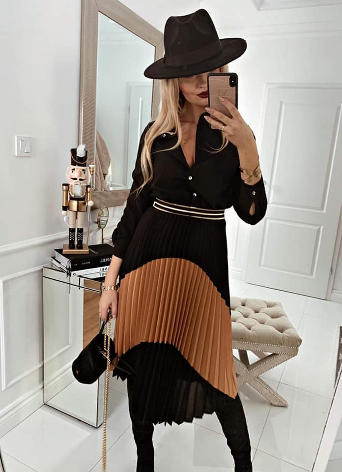 Rewelacyjna sukienka FLO w pięknym połączeniu kolorystycznym. Góra zapinana na praktyczne guziki, dół posiada plisowanie. Krój taliowany zdobioną szeroką gumką, podkreślający pięknie sylwetkę. Mankiet zapinany na praktyczne, modne guziki Idealna propozycja do pracy jak i na wyjście ze znajomymi. Made in Poland