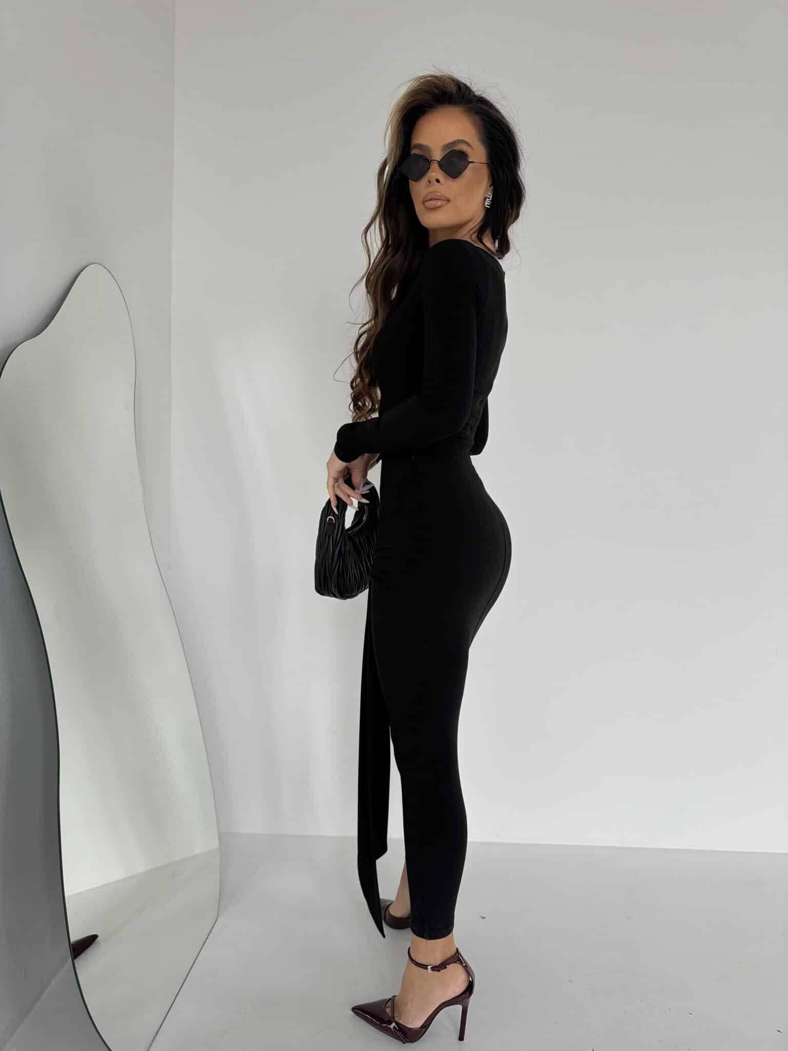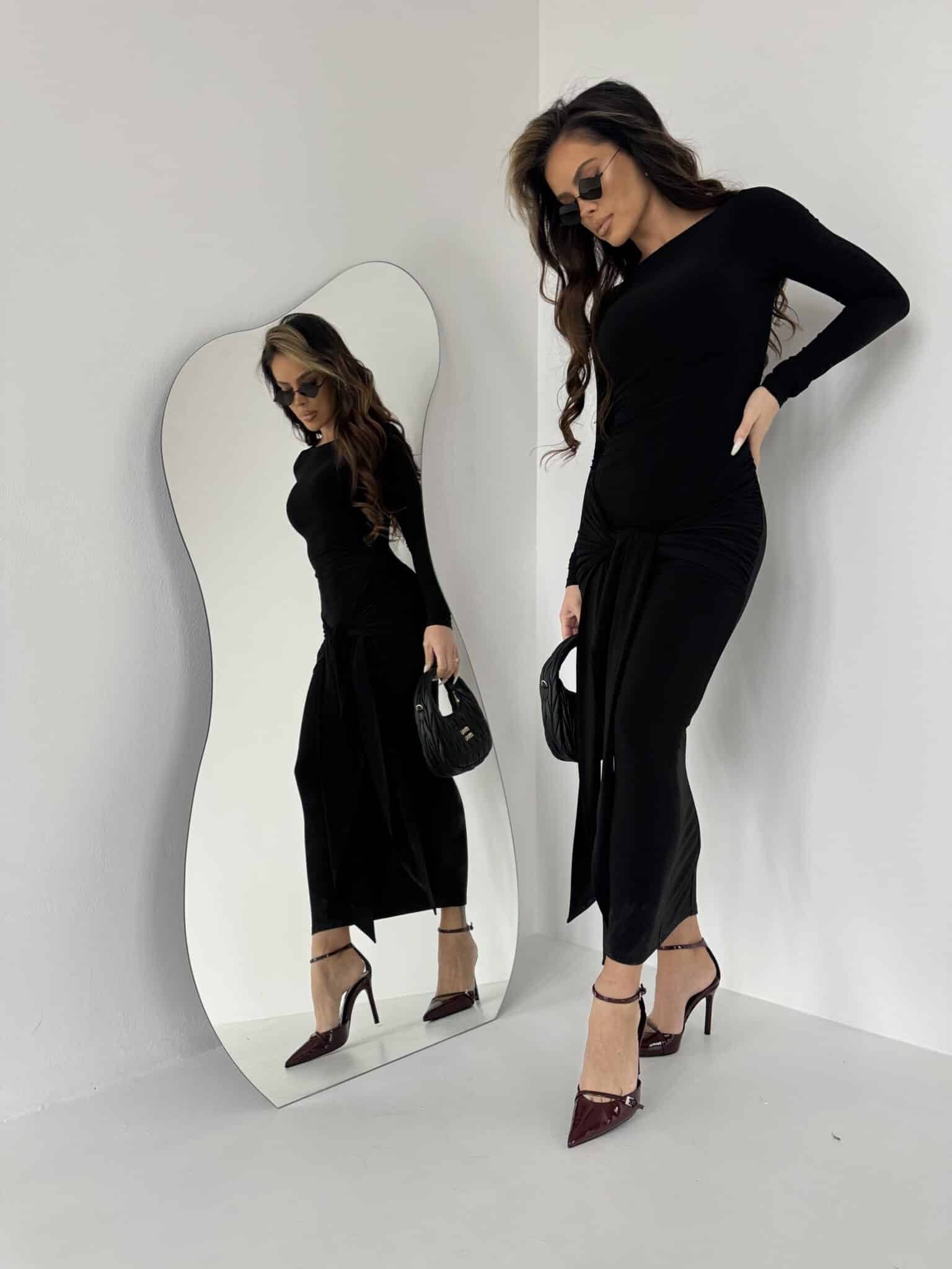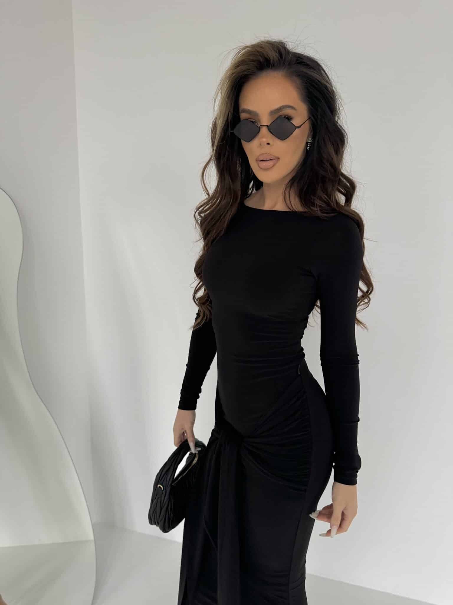 Elegancka sukienka z lejącego materiału to idealna propozycja dla kobiet ceniących sobie klasyczną elegancję połączoną z wygodą. Sukienka jest wykonana z delikatnie opływającego materiału, który doskonale dopasowuje się do sylwetki, podkreślając jej atuty. Model posiada długi rękaw, co dodaje jej szyku i sprawia, że jest idealna na chłodniejsze dni lub wieczorne wyjścia. Wiązanie w biodrach pozwala na dowolne dopasowanie i subtelne podkreślenie figury, a rozkloszowana, maxi spódnica nadaje kreacji lekkości i elegancji. To idealny wybór na wyjątkowe okazje, gdy chcesz wyglądać stylowo i czuć się swobodnie. Made in Poland .