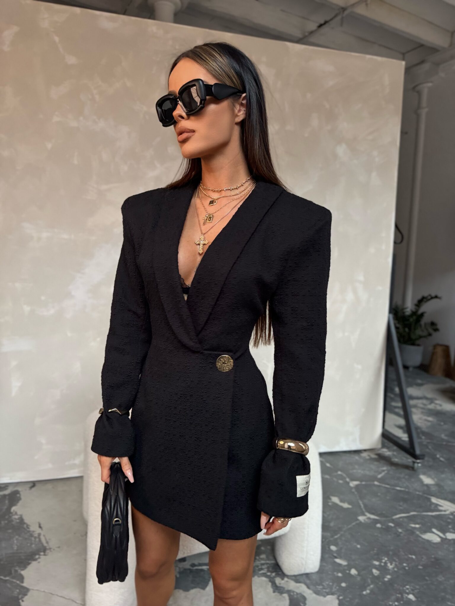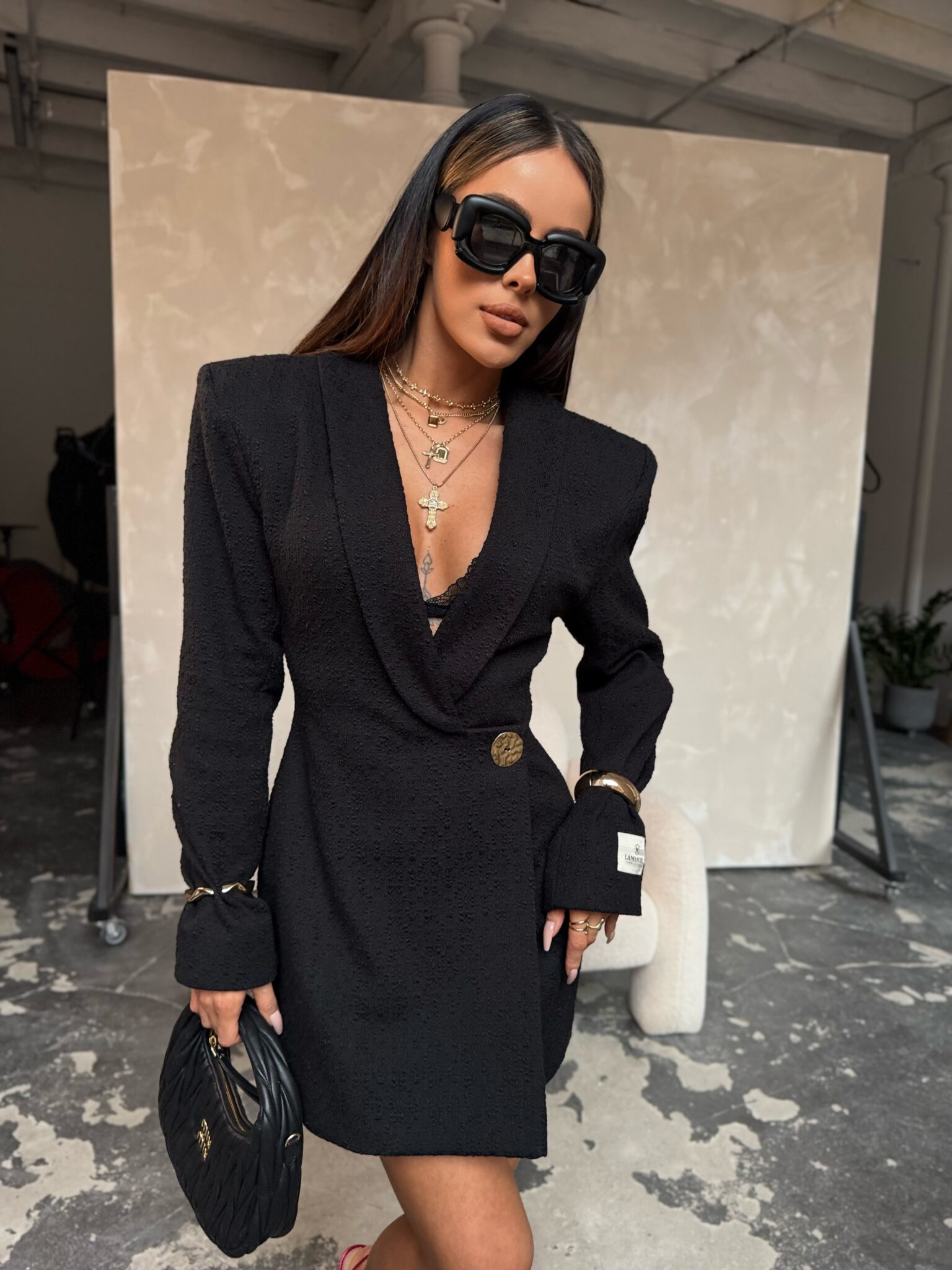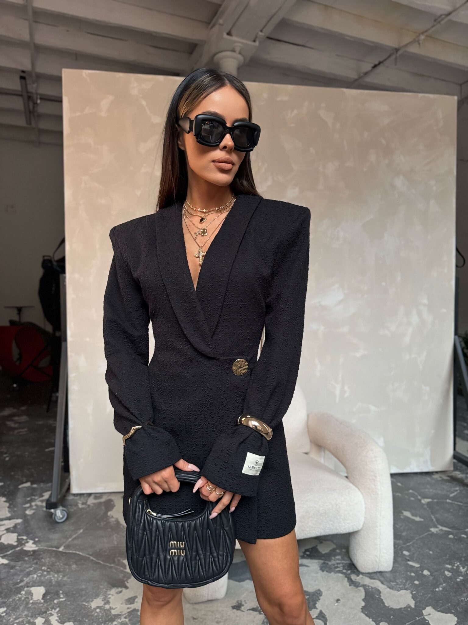 Elegancka sukienka o kroju marynarki, zapinana na dwa ozdobne guziki, łączy w sobie ponadczasową klasykę z nowoczesnym akcentem. Strukturalny materiał i dopracowane detale nadają jej luksusowego charakteru, a dopasowany fason podkreśla sylwetkę.