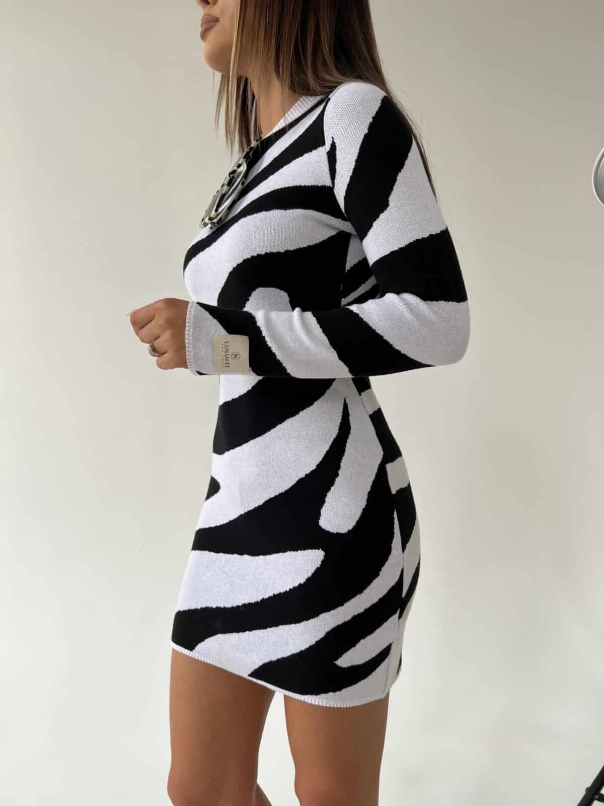 Sukienka ze sweterkowego materiału w print zwierzęcy to doskonały wybór dla kobiet, które cenią sobie nie tylko modę, ale także komfort. Sukienka zachwyca swoim oryginalnym wzornictwem. Jej zwierzęcy print dodaje jej wyjątkowego charakteru, podkreślając Twoją pewność siebie. Posiada długi rękaw i dopasowany krój. Wykonana została z miękkiego i przyjemnego w dotyku sweterkowego materiału. Materiał jest ciepły i idealny na chłodniejsze dni, a jednocześnie elastyczny, co umożliwia swobodę ruchów. Made in Poland .